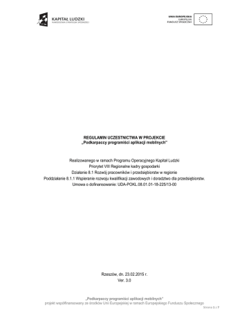 REGULAMIN UCZESTNICTWA W PROJEKCIE „Podkarpaccy programiści aplikacji mobilnych” Realizowanego w ramach Programu Operacyjnego Kapitał Ludzki Priorytet VIII Regionalne kadry gospodarki Działanie 8.1 Rozwój pracowników i przedsiębiorstw w regionie Poddziałanie 8.1.1 Wspieranie rozwoju kwalifikacji zawodowych i doradztwo dla przedsiębiorstw. Umowa o dofinansowanie: UDA-POKL.08.01.01-18-225/13-00 Rzeszów, dn. 23.02.2015 r. Ver. 3.0 „Podkarpaccy programiści aplikacji mobilnych” projekt współfinansowany ze środków Unii Europejskiej w ramach Europejskiego Funduszu Społecznego Strona 1 z 7 1. 2. 3. 4. 5. § 1 PRZEPISY OGÓLNE Regulamin określa warunki rekrutacji i uczestnictwa Beneficjentów Ostatecznych w ramach projektu „Podkarpaccy programiści aplikacji mobilnych” realizowanego w ramach Programu Operacyjnego Kapitał Ludzki, Priorytet VIII Regionalne kadry gospodarki, Działanie 8.1 Rozwój pracowników i przedsiębiorstw w regionie, Poddziałanie 8.1.1 Wspieranie rozwoju kwalifikacji zawodowych i doradztwo dla przedsiębiorstw. Projekt jest współfinansowany przez Unię Europejską w ramach Europejskiego Funduszu Społecznego. Wszystkie decyzje podejmowane w oparciu o regulamin są zgodne z umową nr UDA-POKL.08.01.01-18225/13-00 o dofinansowanie projektu „Podkarpaccy programiści aplikacji mobilnych” z dnia 02.07.2014 roku, zawartą pomiędzy Altkom Akademia S.A., a Wojewódzkim Urzędem Pracy w Rzeszowie. Okres realizacji projektu: 01.05.2014 r. – 30.04.2015 r. Obszar realizacji Projektu: województwo podkarpackie. SŁOWNIK POJĘĆ Użyte w niniejszym Regulaminie pojęcia, oznaczają: 1. Beneficjent/Altkom: Altkom Akademia S.A. 2. Siedziba Beneficjenta: ul. Chłodna 51, 00-867 Warszawa 3. Biuro Projektu: ul. Śniadeckich 5, 35-006 Rzeszów 4. Instytucja Pośrednicząca - Wojewódzki Urząd Pracy w Rzeszowie 5. Projekt: Projekt „Podkarpaccy programiści aplikacji mobilnych” 6. POKL: Program Operacyjny Kapitał Ludzki 7. Uczestnik/Uczestniczka Projektu (UP): osoba zakwalifikowana zgodnie z zasadami określonymi w niniejszym regulaminie do udziału w Projekcie, bezpośrednio korzystająca z realizowanych szkoleń 8. Regulamin: należy przez to rozumieć niniejszy Regulamin rekrutacji i uczestnictwa w projekcie określający zasady rekrutacji i realizacji Projektu. Regulamin jest dostępny na Stronie internetowej Projektu 9. Przedsiębiorca: to osoba fizyczna, osoba prawna i jednostka organizacyjna niebędąca osobą prawną, której odrębna ustawa przyznaje zdolność prawną – wykonująca we własnym imieniu działalność gospodarczą. Za przedsiębiorców uznaje się także wspólników spółki cywilnej w zakresie wykonywanej przez nich działalności gospodarczej (art. 4 Ustawy z dnia 2 lipca 2004 r. o swobodzie działalności gospodarczej; Dz. U. z 2007 r., Nr 155, poz. 1095, z późn. zm.) 10. Pracownik: to osoba zatrudniona na podstawie umowy o pracę, powołania, wyboru, mianowania lub spółdzielczej umowy o pracę (Ustawa z dnia 26 czerwca 1974 r., Kodeks Pracy, tekst jednolity: Dz. U. 1998 r. Nr 21 poz. 94 z póź. zm.) 11. Samozatrudnieni: osoby fizyczne prowadzące działalność gospodarczą, nie zatrudniające pracowników 12. MŚP: mikro (w tym samozatrudnieni), małe i średnie przedsiębiorstwa, w rozumieniu w rozumieniu załącznika I do rozporządzenia Komisji (UE) nr 651/2014 z dnia 17 czerwca 2014 r. uznającego niektóre rodzaje pomocy za zgodne z rynkiem wewnętrznym w zastosowaniu art. 107 i 108 Traktatu (Dz. Urz. UE L 187 z 26.06.2014, str. 1). 13. Strona internetowa Projektu: http://www.altkomakademia.pl/rzeszowmobile 14. Umowa szkoleniowa: umowa obejmująca przeprowadzenie szkoleń dla pracowników Przedsiębiorcy/ Przedsiębiorcy w ramach Projektu, zawarta pomiędzy Akademią a Przedsiębiorcą 15. Szkolenie: ścieżka szkoleniowa prowadzona zgodnie z przyjętym programem szkolenia §2 CEL PROJEKTU Celem głównym projektu jest wzmocnienie potencjału adaptacyjnego 61 MŚP ICT względem zmieniających się trendów rozwoju rynku IT poprzez przeszkolenie 90 pracowników w zakresie wytwarzania nowoczesnego programowania IT w województwie podkarpackim. Cel główny zostanie osiągnięty do 30 kwietnia 2015 r. w województwie podkarpackim przez spełnienie celów szczegółowych tj.: a. wzrost kwalifikacji o 70 % u 73 specjalistów IT MŚP ICT w zakresie programowania aplikacji na platformę Android, b. wzrost kwalifikacji o 70 % u 20 specjalistów IT MŚP ICT w zakresie projektowania mobilnych interfejsów graficznych, §3 1. 2. „Podkarpaccy programiści aplikacji mobilnych” projekt współfinansowany ze środków Unii Europejskiej w ramach Europejskiego Funduszu Społecznego Strona 2 z 7 c. wzrost kwalifikacji o 70 % u 17 specjalistów IT MŚP ICT w zakresie programowania aplikacji na platformę iOS, d. wzrost dostępu do wysokiej jakości kapitału ludzkiego o odpowiednich kwalifikacjach 61 MŚP ICT w województwie podkarpackim poprzez przeszkolenie 90 specjalistów IT. GRUPA DOCELOWA Grupę docelową stanowią mikro, małe i średnie przedsiębiorstwa, w tym osoby samozatrudnione, z sektora ICT - PKD 61 i 62 posiadające siedzibę/jednostkę organizacyjną w województwie podkarpackim, które oddelegują 90 (min. 15% kobiet) pracowników zatrudnionych w oparciu o umowę o pracę, w tym min. 45 osób o niskich kwalifikacjach, pracujących na terenie województwa podkarpackiego. Szkolenia są skierowane do programistów IT, bez względu na wiek, mających niezbędne kompetencje bazowe w zakresie programowania, którzy nie posiadają certyfikatu kompetencji zawodowych z zakresu przedmiotowego szkolenia. Pierwszeństwo udziału w projekcie mają osoby z maksymalnie średnim wykształceniem oraz kobiety. §4 1. 2. 3. ZGŁOSZENIE UCZESTNICTWA Wstępne zgłoszenie uczestnictwa w szkoleniach oferowanych przez Akademię odbywa się przez wypełnienie, podpisanie oraz przesłanie Karty Zgłoszenia wraz z zapotrzebowaniem na s