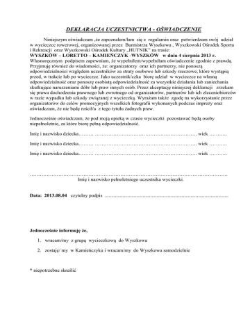 DEKLARACJA UCZESTNICTWA - OŚWIADCZENIE Niniejszym oświadczam ,że zapoznałem/łam się z regulamin oraz potwierdzam swój udział w wycieczce rowerowej, organizowanej przez Burmistrza Wyszkowa , Wyszkowski Ośrodek Sportu i Rekreacji oraz Wyszkowski Ośrodek Kultury „HUTNIK” na trasie: WYSZKÓW – LORETTO – KAMIEŃCZYK -WYSZKÓW w dniu 4 sierpnia 2013 r. Własnoręcznym podpisem zapewniam, że wypełniłem/wypełniłam oświadczenie zgodnie z prawdą. Przyjmuję również do wiadomości, że: organizatorzy oraz ich partnerzy, nie ponoszą odpowiedzialności względem uczestników za straty osobowe lub szkody rzeczowe, które wystąpią przed, w trakcie lub po wycieczce. Jako uczestnik/czka biorę udział w wycieczce na własną odpowiedzialność oraz ponoszę osobistą odpowiedzialność za wszystkie działania lub zaniechania skutkujące naruszeniami dóbr lub praw innych osób. Przez akceptację niniejszej deklaracji zrzekam się prawa dochodzenia prawnego lub zwrotnego od organizatorów, partnerów lub ich zleceniobiorców w razie wypadku lub szkody związanej z wycieczką. Wyrażam także zgodę na wykorzystanie przez organizatorów do celów promocyjnych wszelkich fotografii wykonanych podczas imprezy oraz oświadczam, że nie będę rościł/a z tego tytułu żadnych praw. Jednocześnie oświadczam, że pod moją opieką w czasie wycieczki pozostawać będą osoby niepełnoletnie, za które biorę pełną odpowiedzialność. Imię i nazwisko dziecka……… ……………………………………………………. wiek ……….. Imię i nazwisko dziecka……… ……………………………………………………. wiek ……….. Imię i nazwisko dziecka……… ……………………………………………………. wiek ……….. ………………………………………………………………………………………………………. Imię i nazwisko pełnoletniego uczestnika wycieczki. Data: 2013.08.04 czytelny podpis .................................................................................................. Jednocześnie informuję że, 1. wracam/my z grupą wycieczkową do Wyszkowa 2. zostaję/ my w Kamieńczyku i wracam/my do Wyszkowa samodzielnie * niepotrzebne skreślić