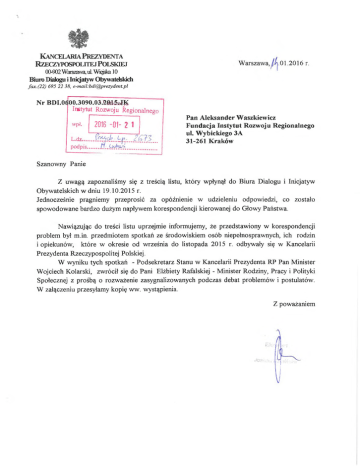 K a n c e l a r ia P r ezy denta R zec z y po spo l it e j P o l sk ie j 00-902Warszawa, uLWiejska 10 Biuro Dialogu i Inicjatyw Obywatelskich .01.2016 r. fax. (22) 695 22 38, e-mail:[email protected] Nr BDI.0600.3090.03.29J&<(^ Instytut Rozwoju Regionalnego wpł. Pan Aleksander Waszkiewicz Fundacja Instytut Rozwoju Regionalnego ul. Wybickiego 3A 31-261 Kraków 2016 -01" 1 1 J Szanowny Panie Z uwagą zapoznaliśmy się z treścią listu, który wpłynął do Biura Dialogu i Inicjatyw Obywatelskich w dniu 19.10.2015 r. Jednocześnie pragniemy przeprosić za opóźnienie w udzieleniu odpowiedzi, co zostało spowodowane bardzo dużym napływem korespondencji kierowanej do Głowy Państwa. Nawiązując do treści listu uprzejmie informujemy, że przedstawiony w korespondencji problem był m.in. przedmiotem spotkań ze środowiskiem osób niepełnosprawnych, ich rodzin i opiekunów, które w okresie od września do listopada 2015 r. odbywały się w Kancelarii Prezydenta Rzeczypospolitej Polskiej. W wyniku tych spotkań - Podsekretarz Stanu w Kancelarii Prezydenta RP Pan Minister Wojciech Kolarski, zwrócił się do Pani Elżbiety Rafalskiej - Minister Rodziny, Pracy i Polityki Społecznej z prośbą o rozważenie zasygnalizowanych podczas debat problemów i postulatów. W załączeniu przesyłamy kopię ww. wystąpienia. Z poważaniem V Warszawa,^) grudnia 2015 roku KANCELARIA PREZYDENTA RZECZYPOSPOLITEJ POLSKIEJ Podsekretarz Stanu W ojciech Kolarski Nr BDI.0600.4197.07.2015.JK Pani Elżbieta Rafalska Minister Rodziny, Pracy i Polityki Społecznej Uprzejmie informuję, że do Prezydenta Rzeczypospolitej Polskiej Pana Andrzeja Dudy zwrócili się przedstawiciele wielu organizacji pozarządowych działających na rzecz osób z niepełnosprawnościami, ich rodzin i opiekunów z prośbą o możliwość spotkania i przedstawienia problemów tego środowiska. W odpowiedzi na apele piszących, oraz wypełniając wyborcze zobowiązania Prezydenta Andrzeja Dudy, w ramach Biura Dialogu i Inicjatyw Obywatelskich Kancelarii Prezydenta RP odbyło się (w okresie od września do listopada 2015 r.) 5 spotkań, w których udział wzięli przedstawiciele m.in. Towarzystwa Pomocy Głuchoniewidomym, Polskie Stowarzyszenie na Rzecz Osób z Upośledzeniem Umysłowym, zrzeszenia podmiotów ekonomii społecznej Platforma Integracji Osób Niepełnosprawnych PION, Stowarzyszenia „STOP Wykluczeniom”, Stowarzyszenia Opiekunowie Niepełnosprawnych, Stowarzyszenia „Mam Przyszłość”, Stowarzyszenia „Niepełnosprawność - Jeden Front” oraz grupa matek przebywających na wcześniejszych emeryturach przyznawanych z tytułu sprawowania opieki nad niepełnosprawnym dzieckiem. Uczestnicy spotkań przedstawiali główne problemy środowiska osób z różnymi rodzajami niepełnosprawności. Najważniejsze z nich dotyczą: - realizacji wyroków Trybunału Konstytucyjnego wydanych w sprawie ustawy oświadczeniach rodzinnych w zakresie świadczeń dla opiekunów osób niepełnosprawnych i zmiany zasad przyznawania tego rodzaju świadczeń; - nowelizacji ustawy z dnia 25 września 2015 r. o zmianie ustawy o rehabilitacji zawodowej i społecznej oraz zatrudnianiu osób niepełnosprawnych w zakresie rozwiązań zawartych w art. 22, na mocy którego zmieniono zasady obniżania obowiązkowych wpłat (kar) na Państwowy Fundusz Rehabilitacji Osób Niepełnosprawnych przez podmioty, które nie zatrudniają osób niepełnosprawnych. konieczności podjęcia szeregu inicjatyw ustawodawczych zmierzających m.in. do stworzenia każdej osobie z niepełnosprawnością szansy na zatrudnienie na otwartym rynku pracy, przejścia z „opiekuńczego” modelu pomocy osobom niepełnosprawnym na aktywizujący i środowiskowy; - realizacji Konwencji o prawach osób z niepełnosprawnościami w Polsce” (w tym podpisanie Protokołu Fakultatywnego); zmiany zasad dystrybucji środków z Państwowego Funduszu Rehabilitacji Osób Niepełnosprawnych (obecne rozwiązania powodują braki w pewnych obszarach i niewykorzystanie środków w innych); - powrotu możliwości przechodzenia rodziców niepełnosprawnych dzieci na wcześniejszą emeryturę po osiągnięciu określonego okresu składkowego i nieskładkowego; - wprowadzenia świadczenia emerytalnego dla rodziców, którzy w okresie aktywności zawodowej nie mieli możliwości podjęcia pracy z powodu sprawowania opieki nad niepełnosprawnym dzieckiem; - konieczności zabezpieczenia osób otrzymujących świadczenia z tytułu opieki nad niepełnosprawnym członkiem rodziny, których podopieczny zmarł (np. poprzez zagwarantowanie prawa do zasiłku dla bezrobotnych na co najmniej rok oraz zagwarantowanie instrumentów ułatwiających powrót na rynek pracy - w tym szkoleń i staży; - konieczności zmiany zasad przyznawania i wydatkowania subwencji oświatowej przyznawanej na uczniów z niepełnosprawnościami; - konieczności wyrównania różnicy kwotowej świadczeń wcześniejszych emerytur i rent (świadczeń EWK, EDW) do kwoty świadczenia pielęgnacyjnego (1200 - docelowo 1300zł.) np. w postaci comiesięcznego dodatku do pobieranej emerytury lub renty; - zwiększenia dostępności placówek dziennych takich jak np.: Warsztaty Terapii Zajęciowej i Środowiskowe Domy Samopomocy dla dzieci niepełnosprawnych, które zakończyły edukację szkolną (w tym osób po 18 roku życia z orzeczoną niepełnosprawnością w stopniu znacznym). Ponieważ zasygnalizowane kwestie w przeważającej części wymagają rozwiązań ustawowych, a Ministerstwo Rodziny, Pracy i Polityki Społecznej jest organem powołanym m.in. do przygotowania projektów ustaw i rozporządzeń w tym zakresie, pozwalam sobie zwrócić się do Pani Minister z prośbą o rozpatrzenie zgłoszonych przez stronę społeczną uwag i postulatów zasygnalizowanych podczas debat przeprowadzonych w Kancelarii Prezydenta Rzeczypospolitej Polskiej. Jednocześnie zapewniam, że jestem otwarty na dalszą współpracę w obszarze spraw spo