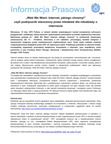 Informacja Prasowa „Web We Want. Internet, jakiego chcemy!” czyli podręcznik stworzony przez młodzież dla młodzieży o internecie Warszawa, 12 luty: UPC Polska, w ramach działań wspierających rozwój kompetencji cyfrowych, przygotowało publikację, której autorami i jednocześnie adresatami są młodzi użytkownicy Internetu. Najnowsza pozycja pt.: „Web We Want. Internet, jakiego chcemy!” to podręcznik edukacyjny przeznaczony dla 13 - 16-latków, stworzony z ich udziałem, poruszający kwestie związane z wyzwaniami stojącymi przed współczesnymi użytkownikami sieci. Duża część nakładu zostanie rozdystrybuowana bezpłatnie przez UPC do wybranych szkół. Publikacja powstała na zlecenie Insafe, europejskiej organizacji promującej bezpieczne korzystanie z Internetu, przy współpracy wielu partnerów w tym Fundacji Dzieci Niczyje, Naukowej i Akademickiej Sieci Komputerowej (NASK), Google i UPC Polska. Internet otwiera drzwi do świata niekończących się okazji do poznawania, komunikowania się i tworzenia. Jest to miejsce, gdzie kwitnie ciekawość i kreatywność, gdzie młodzież rozwija szeroki zakres umiejętności. By jednak móc w pełni z tej interaktywnej rzeczywistości korzystać, warto poznać i zrozumieć zasady, jakie w niej rządzą. Merytoryczne porady można znaleźć w eksperckich publikacjach, takich jak najnowszy podręcznik dla młodzieży „Web We Want. Internet, jakiego chcemy!” „Web We Want. Internet, jakiego chcemy!” To książka dla nastolatków, współtworzona przez młodzież. Zawartość i podejście współgrające z potrzebami oraz upodobaniami współczesnych młodych ludzi.„Web We Want. Internet, jakiego chcemy!” omawia kwestie praw i obowiązków internauty, prowadzenia blogów, ochrony tożsamości i prywatności, podawania nieprawdziwych informacji. Zapoznaje też z podstawowym znaczeniem wolności słowa, czy ochroną praw autorskich w sieci. Podręcznik odpowiada na wiele pytań nurtujących nie tylko młodych ludzi, ale również wielu dorosłych użytkowników Internetu: w jaki sposób świadomie zbudować i zarządzać swoim Cyfrowym Ja, dlaczego należy dbać o swoją prywatność. Po lekturze broszury każdy będzie miał świadomość tego, jak odpowiedzialnie funkcjonować w wirtualnej rzeczywistości. Internet jutra Podobnie, jak we wszystkich innych aspektach życia nastolatków, edukacja jest kluczowym elementem, który sprzyja rozwojowi bardziej świadomego podejścia do korzystania z internetu. Nauczyciele i rodzice mogą znaleźć materiały pomocnicze, dotyczące występujących w podręczniku zagadnień także na stronie internetowej: http://www.upc.pl/internet/bezpieczenstwo-w-sieci. Podręcznik „Web We Want. Internet, jakiego chcemy!” będzie bezpłatnie dystrybuowany w szkołach, w trakcie warsztatów i spotkań na temat bezpieczeństwa w sieci organizowanych przez UPC w ramach projektu „Bezpieczne dzieci to wyedukowani dorośli”. UPC szczególnie troszczy się o bezpieczeństwo swoich klientów, oferując im min. nieodpłatnie Pakiet Bezpieczeństwa UPC, który zapewnia kompleksowe bezpieczeństwo w sieci, kontrolę rodzicielską i ochronę komputera. Nasze działania dostrzegł Urząd Komunikacji Elektronicznej, przyznając po raz kolejny Certyfikat Bezpiecznego Internetu. Podręcznik można pobrać ze strony: http://www.upc.pl/pdf/the_web_we_want_PL.pdf ************** UPC Polska jest liderem cyfrowych usług kablowych: telewizji, szerokopasmowego Internetu i telefonii dla klientów indywidualnych i biznesowych. Łączymy ludzi z cyfrowym światem, ułatwiając korzystanie z jego nieograniczonego potencjału oraz wyznaczamy nowe trendy na rynku, dzięki wdrażaniu najlepszych, światowych technologii. Na koniec czwartego kwartału 2013 r. z usług UPC Polska korzystało 1 436 700 abonentów, w tym 848 300 z interaktywnej telewizji cyfrowej, 387 000 z telewizji analogowej, 915 900 z szerokopasmowego internetu i 521 800 z telefonii. W zasięgu najnowszej generacji szerokopasmowych sieci UPC w standardzie DOCSIS 3.0 znajduje się ponad 2,5 mln gospodarstw domowych, w ponad 100 miastach w Polsce. UPC Polska jest częścią Liberty Global, Inc. (NASDAQ: LBTYA, LBTYB, LBTYK). Więcej informacji dostępnych jest na stronie: www.upc.pl. Liberty Global jest największym międzynarodowym operatorem telewizji kablowej, obecnym w 14 krajach. Łączymy ludzi z cyfrowym światem, umożliwiając im odkrywanie jego nieograniczonych możliwości. Nasza potrójna usługa, wyznaczająca rynkowe trendy, jest dostarczana dzięki sieciom nowej generacji oraz innowacyjnym platformom technologicznym, które łączą 24 mln klientów, korzystających z 48 mln usług: telewizji, szerokopasmowego Internetu i telefonii. (dane z 31 grudnia 2013r.). Marki konsumenckie, jakie należą do Liberty Global to Virgin Media, UPC, Unitymedia, Kabel BW, Telenet i VTR. Nasza działalność operacyjna obejmuje również Liberty Global Business Services oraz fundusz inwestycyjny Liberty Global Ventures. Więcej informacji na www.lgi.com. Kontakty dla mediów: Michał Fura Kierownik komunikacji korporacyjnej i public affairs Rzecznik prasowy UPC Polska T +48 22 24 16 877 e-mail: [email protected]