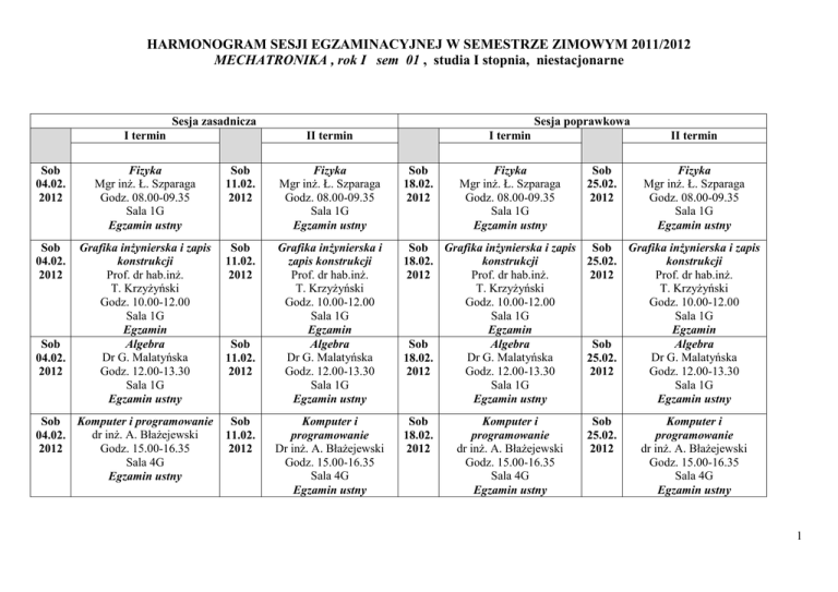 HARMONOGRAM SESJI EGZAMINACYJNEJ W SEMESTRZE ZIMOWYM 2011/2012 MECHATRONIKA , rok I sem 01 , studia I stopnia, niestacjonarne Sesja zasadnicza I termin Sesja poprawkowa II termin I termin Sob 04.02. 2012 Fizyka Mgr inż. Ł. Szparaga Godz. 08.00-09.35 Sala 1G Egzamin ustny Sob 11.02. 2012 Fizyka Mgr inż. Ł. Szparaga Godz. 08.00-09.35 Sala 1G Egzamin ustny Sob 18.02. 2012 Sob 04.02. 2012 Grafika inżynierska i zapis konstrukcji Prof. dr hab.inż. T. Krzyżyński Godz. 10.00-12.00 Sala 1G Egzamin Algebra Dr G. Malatyńska Godz. 12.00-13.30 Sala 1G Egzamin ustny Sob 11.02. 2012 Grafika inżynierska i zapis konstrukcji Prof. dr hab.inż. T. Krzyżyński Godz. 10.00-12.00 Sala 1G Egzamin Algebra Dr G. Malatyńska Godz. 12.00-13.30 Sala 1G Egzamin ustny Sob Grafika inżynierska i zapis Sob Grafika inżynierska i zapis 18.02. konstrukcji 25.02. konstrukcji Prof. dr hab.inż. Prof. dr hab.inż. 2012 2012 T. Krzyżyński T. Krzyżyński Godz. 10.00-12.00 Godz. 10.00-12.00 Sala 1G Sala 1G Egzamin Egzamin Sob Algebra Sob Algebra Dr G. Malatyńska Dr G. Malatyńska 18.02. 25.02. Godz. 12.00-13.30 Godz. 12.00-13.30 2012 2012 Sala 1G Sala 1G Egzamin ustny Egzamin ustny Sob Komputer i programowanie dr inż. A. Błażejewski 04.02. Godz. 15.00-16.35 2012 Sala 4G Egzamin ustny Sob 11.02. 2012 Komputer i programowanie Dr inż. A. Błażejewski Godz. 15.00-16.35 Sala 4G Egzamin ustny Sob 18.02. 2012 Sob 04.02. 2012 Sob 11.02. 2012 Fizyka Mgr inż. Ł. Szparaga Godz. 08.00-09.35 Sala 1G Egzamin ustny II termin Komputer i programowanie dr inż. A. Błażejewski Godz. 15.00-16.35 Sala 4G Egzamin ustny Sob 25.02. 2012 Sob 25.02. 2012 Fizyka Mgr inż. Ł. Szparaga Godz. 08.00-09.35 Sala 1G Egzamin ustny Komputer i programowanie dr inż. A. Błażejewski Godz. 15.00-16.35 Sala 4G Egzamin ustny 1 Nd 05.02. 2012 Rachunek różniczkowy i całkowy Dr G. Malatyńska Godz. 10.30-14.00 Sala 1G Egzamin Nd 12.02. 2012 Rachunek różniczkowy i całkowy Dr G. Malatyńska Godz. 10.30-14.00 Sala 1G Egzamin Nd 19.02. 2012 Rachunek różniczkowy i całkowy Dr G. Malatyńska Godz. 10.30-14.00 Sala 1G Egzamin Nd 26.02. 2012 Rachunek różniczkowy i całkowy Dr G. Malatyńska Godz. 10.30-14.00 Sala 1G Egzamin 2 HARMONOGRAM SESJI EGZAMINACYJNEJ W SEMESTRZE ZIMOWYM 2011/2012 MECHATRONIKA , rok II sem. 03, studia I stopnia, niestacjonarne Sesja zasadnicza I termin Pt 03.02. 2012 Sob 04.02. 2012 Sob 04.02. 2012 Nd 04.02. 2012 Wytrzymałość materiałów Prof. dr hab.inż. K. Wierzcholski Godz. 15.50-19.15 Sala 103 G Egzamin ustny Modele sygnałów i systemów dr inż. S. Bartkiewicz Godz. 08.00-11.00 Sala 104 G Egzamin ustny Probabilistyka i statystyka Dr hab. K. Frischmuth Godz. 11.00-14.00 Sala 104 G Egzamin Sterowniki mikroprocesorowe i mikrokontrolery Dr inż. P. Zaporski Godz. 11.30-14.00 Sala 201-3G Egzamin Sesja poprawkowa II termin Pt 17.02. 2012 So 11.02. 2012 So 11.02. 2012 Nd 12.02. 2012 Wytrzymałość materiałów Prof. dr hab.inż. K. Wierzcholski Godz. 15.50-19.15 Sala 103 G Egzamin ustny Modele sygnałów i systemów dr inż. S. Bartkiewicz Godz. 08.00-11.00 Sala 104 G Egzamin ustny Probabilistyka i statystyka Dr hab. K. Frischmuth Godz. 11.00-14.00 Sala 104 G Egzamin Sterowniki mikroprocesorowe i mikrokontrolery Dr inż. P. Zaporski Godz. 11.30-14.00 Sala 201-3G Egzamin I termin Pt 24.02. 2012 So 18.02. 2012 So 18.02. 2012 Nd 19.02. 2012 Wytrzymałość materiałów Prof. dr hab.inż. K. Wierzcholski Godz. 15.50-19.15 Sala 103 G Egzamin ustny Modele sygnałów i systemów dr inż. S. Bartkiewicz Godz. 08.00-11.00 Sala 104 G Egzamin ustny Probabilistyka i statystyka Dr hab. K. Frischmuth Godz. 11.00-14.00 Sala 104 G Egzamin Sterowniki mikroprocesorowe i mikrokontrolery Dr inż. P. Zaporski Godz. 11.30-14.00 Sala 201-3G Egzamin II termin Pt 25.02. 2012 So 25.02. 2012 So 25.02. 2012 Nd 26.02. 2012 Wytrzymałość materiałów Prof. dr hab.inż. K. Wierzcholski Godz. 15.50-19.15 Sala 103 G Egzamin ustny Modele sygnałów i systemów dr inż. S. Bartkiewicz Godz. 08.00-11.00 Sala 104 G Egzamin ustny Probabilistyka i statystyka Dr hab. K. Frischmuth Godz. 11.00-14.00 Sala 104 G Egzamin Sterowniki mikroprocesorowe i mikrokontrolery Dr inż. P. Zaporski Godz. 11.30-14.00 Sala 201-3G Egzamin 3 HARMONOGRAM SESJI EGZAMINACYJNEJ W SEMESTRZE ZIMOWYM 2011/2012 MECHATRONIKA , rok III sem. 05 , studia I stopnia, niestacjonarne Sesja zasadnicza I termin Pt 03.02. 2012 Pt 03.02. 2012 So 04.02. 2012 So 04.02. 2012 Robotyka i napędy Dr hab.inż. T. Kiczkowiak/ dr P. Zaporski Godz. 18.30-21.00 Sala 1G Egzamin ustny Metody projektowania i eksploatacji Dr hab.inż. T. Kiczkowiak Godz. 16.45 – 18.20 Sala 205-2G Egzamin ustny Programowanie obiektowe maszyn i urządzeń dr inż. P. Majchrzak Godz. 08.00-10.30 Sala 103G Egzamin Architektura i oprogramowanie wbudowanych systemów komputerowych Dr inż. G. Górski Godz. 13.00-15.00 Sala 4G Egzamin ustny Sesja poprawkowa II termin Pt Robotyka i napędy 10.02. Dr hab.inż. T. Kiczkowiak/ dr P. Zaporski 2012 Godz. 18.30-21.00 Sala 1G Egzamin ustny Pt Metody projektowania i 10.02. eksploatacji 2012 Dr hab.inż. T. Kiczkowiak Godz. 16.45 – 18.20 Sala 205-2G Egzamin ustny So Programowanie obiektowe 11.02. maszyn i urządzeń dr inż. P. Majchrzak 2012 Godz. 08.00-10.30 Sala 103G Egzamin So Architektura i 11.02. oprogramowanie 2012 wbudowanych systemów komputerowych Dr inż. G. Górski Godz. 13.00-15.00 Sala 4G Egzamin ustny I termin Pt Robotyka i napędy 17.02. Dr hab.inż. T. Kiczkowiak/ dr P. Zaporski 2012 Godz. 18.30-21.00 Sala 1G Egzamin ustny Pt Metody projektowania i 17.02. eksploatacji 2012 Dr hab.inż. T. Kiczkowiak Godz. 16.45 – 18.20 Sala 205-2G Egzamin ustny So Programowanie obiektowe 18.02. maszyn i urządzeń dr inż. P. Majchrzak 2012 Godz. 08.00-10.30 Sala 103G Egzamin So Architektura i 18.02. oprogramowanie 2012 wbudowanych systemów komputerowych Dr inż. G. Górski Godz. 13.00-15.00 Sala 4G Egzamin ustny II termin Robotyka i napędy Dr hab.inż. T. Kiczkowiak/ dr P. Zapors