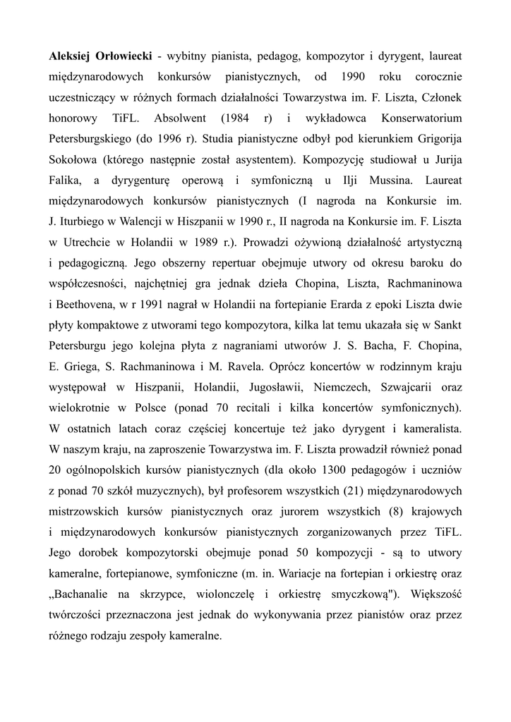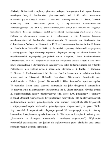 Aleksiej Orłowiecki - wybitny pianista, pedagog, kompozytor i dyrygent, laureat międzynarodowych konkursów pianistycznych, od 1990 roku corocznie uczestniczący w różnych formach działalności Towarzystwa im. F. Liszta, Członek honorowy TiFL. Absolwent (1984 r) i wykładowca Konserwatorium Petersburgskiego (do 1996 r). Studia pianistyczne odbył pod kierunkiem Grigorija Sokołowa (którego następnie został asystentem). Kompozycję studiował u Jurija Falika, a dyrygenturę operową i symfoniczną u Ilji Mussina. Laureat międzynarodowych konkursów pianistycznych (I nagroda na Konkursie im. J. Iturbiego w Walencji w Hiszpanii w 1990 r., II nagroda na Konkursie im. F. Liszta w Utrechcie w Holandii w 1989 r.). Prowadzi ożywioną działalność artystyczną i pedagogiczną. Jego obszerny repertuar obejmuje utwory od okresu baroku do współczesności, najchętniej gra jednak dzieła Chopina, Liszta, Rachmaninowa i Beethovena, w r 1991 nagrał w Holandii na fortepianie Erarda z epoki Liszta dwie płyty kompaktowe z utworami tego kompozytora, kilka lat temu ukazała się w Sankt Petersburgu jego kolejna płyta z nagraniami utworów J. S. Bacha, F. Chopina, E. Griega, S. Rachmaninowa i M. Ravela. Oprócz koncertów w rodzinnym kraju występował w Hiszpanii, Holandii, Jugosławii, Niemczech, Szwajcarii oraz wielokrotnie w Polsce (ponad 70 recitali i kilka koncertów symfonicznych). W ostatnich latach coraz częściej koncertuje też jako dyrygent i kameralista. W naszym kraju, na zaproszenie Towarzystwa im. F. Liszta prowadził również ponad 20 ogólnopolskich kursów pianistycznych (dla około 1300 pedagogów i uczniów z ponad 70 szkół muzycznych), był profesorem wszystkich (21) międzynarodowych mistrzowskich kursów pianistycznych oraz jurorem wszystkich (8) krajowych i międzynarodowych konkursów pianistycznych zorganizowanych przez TiFL. Jego dorobek kompozytorski obejmuje ponad 50 kompozycji - są to utwory kameralne, fortepianowe, symfoniczne (m. in. Wariacje na fortepian i orkiestrę oraz „Bachanalie na skrzypce, wiolonczelę i orkiestrę smyczkową"). Większość twórczości przeznaczona jest jednak do wykonywania przez pianistów oraz przez różnego rodzaju zespoły kameralne.