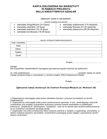 KARTA ZGŁOSZENIA NA WARSZTATY W RAMACH PROJEKTU WILLA KREATYWNYCH DZIAŁAŃ Zgłaszam udział w warsztatach: /NALEŻY ZAKREŚLIĆ WŁAŚCIWE/     warsztaty fotograficzne (3-4 lipca) warsztaty pisarskie (10 lipca) warsztaty teatralne (16-18 lipca) warsztaty komiksowe (19-20 lipca)    warsztaty szablonowe (7-8 sierpnia) warsztaty filmowe (21-22 sierpnia) warsztaty plastyczne (28-29 sierpnia) /NALEŻY WYPEŁNIĆ PISMEM DRUKOWANYM/ Imię i nazwisko Wiek Adres: Telefon Email Podpis……………………………………… Uwaga! Dla uczestników niepełnoletnich wymagana jest pisemna zgoda rodziców lub opiekunów. Ja, niżej podpisany(a)......................................................................................., wyrażam zgodę na udział mojego podopiecznego w warsztatach w ramach projektu Willa Kreatywnych Działań. Podpis………………………………………. Zgłoszenia należy dostarczyć do Centrum Promocji Młodych (al. Wolności 30) 1.Organizatorzy zastrzegają sobie prawo odwołania imprezy z przyczyn powstałych po stronie Organizatorów. 2. Organizatorzy zastrzegają sobie prawo zamieszczenia reportażu, w tym zawierającego wizerunki uczestników oraz projekty uczestników wykonane podczas trwania warsztatów w publikacjach prasowych, książkowych, telewizyjnych, wystawach oraz na na stronie cpm.muzeumczestochowa.pl, na co uczestnicy warsztatów wyrażają zgodę. 3. Organizator ma prawo przetwarzać dane osobowe zebrane w związku z organizacją warsztatów, w celach realizacji programu warsztatów. Uczestnikom przysługuje prawo wglądu i poprawiania swoich danych osobowych.