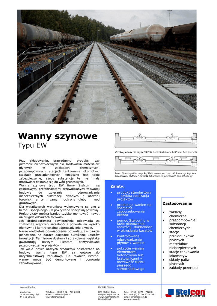Wanny szynowe Typu EW Przekrój wanny dla szyny S4/S54 i szerokości toru 1435 mm bez pokrycia Przy składowaniu, przeładunku, produkcji czy przerobie niebezpiecznych dla środowiska materiałów płynnych w zakładach chemicznych, przepompowniach, stacjach tankowania lokomotyw, stacjach przeładunkowych konieczne jest takie zabezpieczenie, ażeby substancje te nie miały możliwości dostania się do wód gruntowych. Wanny szynowe typu EW firmy Stelcon są żelbetowymi prefabrykatami przewidzianymi w swojej budowie do zbierania i odprowadzania niebezpiecznych substancji płynnych z obszaru torowisk, a tym samym ochrone gleby i wód gruntowych. Dla wyjątkowych warunków wykonywane są one z betonu specjalnego lub pokrywane specjalną powłoką. Prefabrykaty można bardzo szybko montować nawet na długich odcinkach torowisk. Ich drobnoporowata powierzchnia odpowiada za znakomitą nieprzepuszczalnoćć i pozwala na wysoko efektywne i kontrolowalne odprowadzenie płynów. Nasze wieloletnie doświadczenie pozwala już w trakcie planowania na bardzo dokładne określenie kosztów inwestycji. Terminowe dostawy i sprawdzona logistyka gwarantują naszym klientom bezryzykowne przeprowadzanie projektów. Jak wiele innych naszych produktów dostarczane na budowy wanny typu EW sa gotowe do natychmiastowej zabudowy. Co również istotne: wanny mogą być demontowane i ponownie zabudowywane. Kontakt Polska: stalchemia ul. M. Gorkiego 3/5 44-113 Gliwice Przekrój wanny dla szyny S4/S54 i szerokości toru 1435 mm z pokryciem betonowymi płytami typu SLW 60 umożliwiającymi ruch samochodowy Zalety: • produkt standartowy - szybka realizacja projektów • produkcja wanien na specjalne zapotrzebowania klienta Zastosowanie: • pomoc Stelcon’ u w fazie planowania i realizacji, dokładność w określaniu kosztów • • kontrolowane odprowadzenie płynów z wanien • pokrycie wanien elementami betonowymi lub kratownicami – możliwość ruchu pieszego i samochodowego Kontakt Niemcy Tel./Fax: +48 (0 ) 32 - 721 23 04 email: [email protected] www.stalchemia.pl BTE Stelcon GmbH Philippsburger Str. 4 76726 Germersheim Deutschland Tel.: +49 (0) 7274 - 7028 0 Fax: +49 (0) 7274- 7018 119 email: [email protected] www.stelcon.de • • • • • zakłady chemiczne przepompownie substancji chemicznych stacje przeładunkowe płynnych materiałów niebezpiecznych stacje tankowania lokomotyw składy paliw płynnych zakłady przerobu