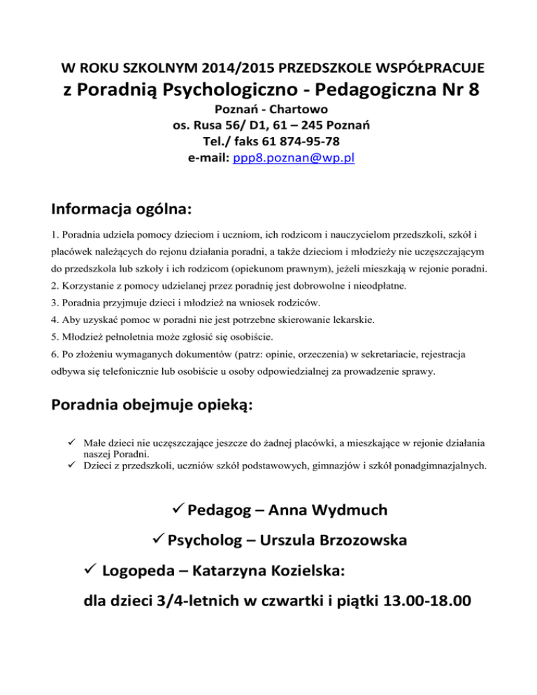 W ROKU SZKOLNYM 2014/2015 PRZEDSZKOLE WSPÓŁPRACUJE z Poradnią Psychologiczno - Pedagogiczna Nr 8 Poznań - Chartowo os. Rusa 56/ D1, 61 – 245 Poznań Tel./ faks 61 874-95-78 e-mail: [email protected] Informacja ogólna: 1. Poradnia udziela pomocy dzieciom i uczniom, ich rodzicom i nauczycielom przedszkoli, szkół i placówek należących do rejonu działania poradni, a także dzieciom i młodzieży nie uczęszczającym do przedszkola lub szkoły i ich rodzicom (opiekunom prawnym), jeżeli mieszkają w rejonie poradni. 2. Korzystanie z pomocy udzielanej przez poradnię jest dobrowolne i nieodpłatne. 3. Poradnia przyjmuje dzieci i młodzież na wniosek rodziców. 4. Aby uzyskać pomoc w poradni nie jest potrzebne skierowanie lekarskie. 5. Młodzież pełnoletnia może zgłosić się osobiście. 6. Po złożeniu wymaganych dokumentów (patrz: opinie, orzeczenia) w sekretariacie, rejestracja odbywa się telefonicznie lub osobiście u osoby odpowiedzialnej za prowadzenie sprawy. Poradnia obejmuje opieką: Małe dzieci nie uczęszczające jeszcze do żadnej placówki, a mieszkające w rejonie działania naszej Poradni. Dzieci z przedszkoli, uczniów szkół podstawowych, gimnazjów i szkół ponadgimnazjalnych. Pedagog – Anna Wydmuch Psycholog – Urszula Brzozowska Logopeda – Katarzyna Kozielska: dla dzieci 3/4-letnich w czwartki i piątki 13.00-18.00