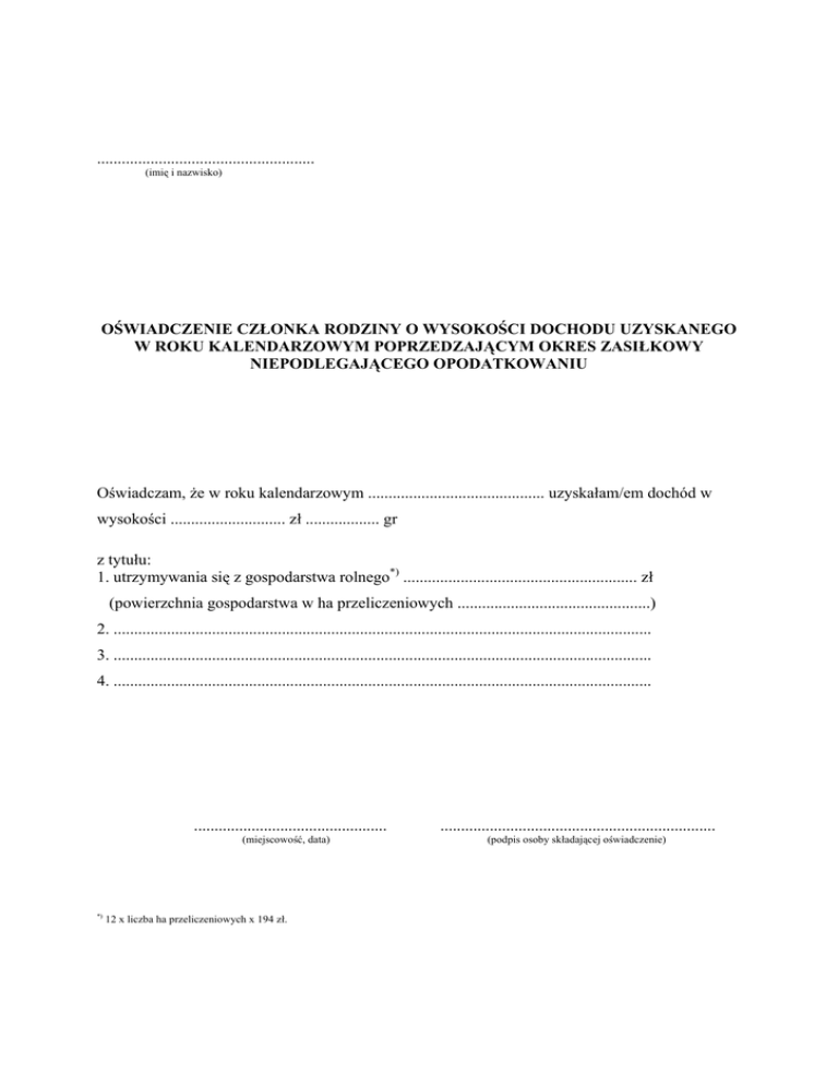 oświadczenie członka rodziny o wysokości dochodu uzyskanego w