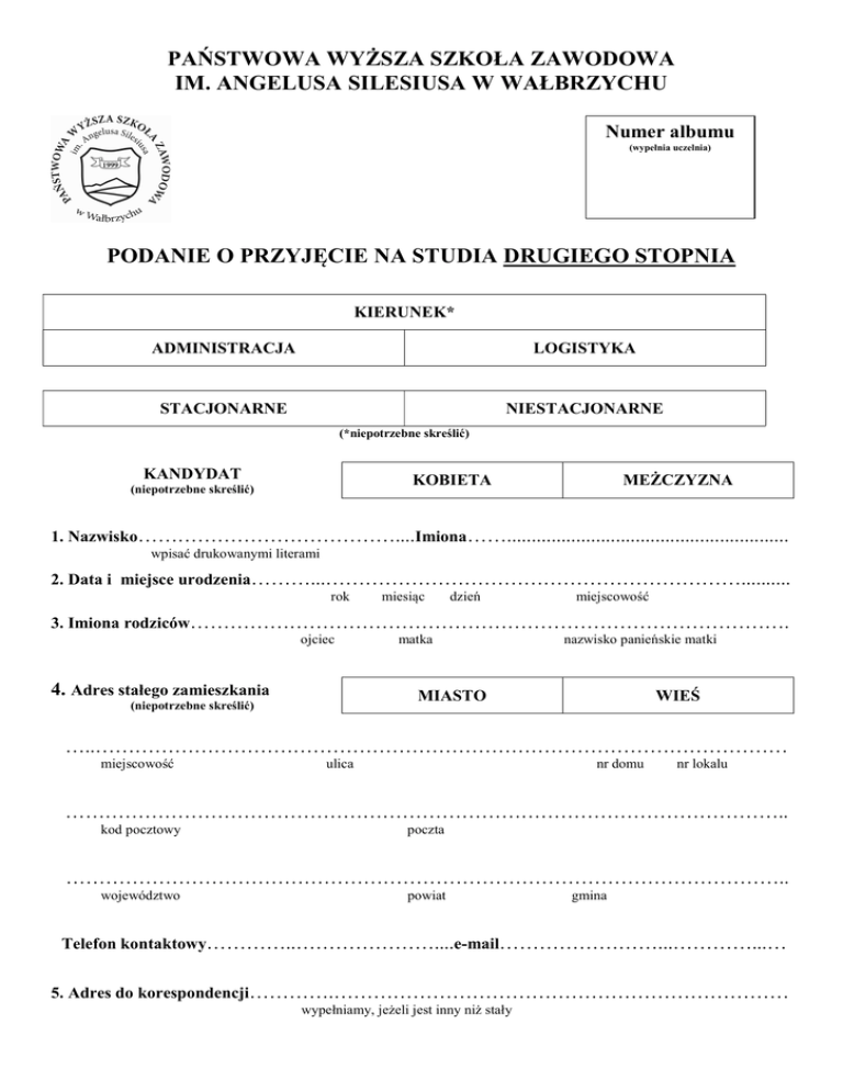 PAŃSTWOWA WYŻSZA SZKOŁA ZAWODOWA IM. ANGELUSA SILESIUSA W WAŁBRZYCHU Numer albumu (wypełnia uczelnia) PODANIE O PRZYJĘCIE NA STUDIA DRUGIEGO STOPNIA KIERUNEK* ADMINISTRACJA LOGISTYKA STACJONARNE NIESTACJONARNE (*niepotrzebne skreślić) KANDYDAT KOBIETA (niepotrzebne skreślić) MEŻCZYZNA 1. Nazwisko…………………………………....Imiona……......................................................... wpisać drukowanymi literami 2. Data i miejsce urodzenia………...……………………………………………………….......... rok miesiąc dzień miejscowość 3. Imiona rodziców………………………………………………………………………………. ojciec 4. Adres stałego zamieszkania matka nazwisko panieńskie matki MIASTO (niepotrzebne skreślić) WIEŚ …..…………………………………………………………………………………………… miejscowość ulica nr domu nr lokalu ……………………………………………………………………………………………….. kod pocztowy poczta ……………………………………………………………………………………………….. województwo powiat gmina Telefon kontaktowy…………..…………………....e-mail……………………...…………...… 5. Adres do korespondencji………….…………………………………………………………… wypełniamy, jeżeli jest inny niż stały …………..………...…………………………………………………………………………. 6. Informacja o podstawowym źródle utrzymania rodziny kandydata na studia (zakreślić odpowiednie) własne dochody z pracy stałej, własne dochody z pracy dorywczej, dochody rodziców kandydata, inne (jakie?) ..................................................................................................................................................... 7. Stan cywilny……………………………………….……………………………………………………....... Nazwisko panieńskie u mężatek…………………………………………………………………................. 8. Seria i numer dowodu osobistego...................................nr PESEL…..………………………………… Narodowość………………………..….Obywatelstwo……………………………………..……………… 9. Ukończona szkoła wyższa: Nazwa szkoły………......…………………………………………………………………………................. ………………………………………………………………………………………………………………...... kierunek STACJONARNE specjalność (niepotrzebne skreślić) NIESTACJONARNE Data ukończenia (wpisać rok) Dyplom: numer……………………….…………data wystawienia…………………...……………... 10. O ofercie Państwowej Wyższej Szkoły Zawodowej im. Angelusa Silesiusa dowiedziałem/am się z*: - reklamy radiowej - reklamy prasowej - reklamy TV - billboardu - plakatów wywieszonych w sklepach - z targów edukacyjnych - z oficjalnego profilu PWSZ na Facebooku - z Internetu (podać stronę)……………………………….. - z innych źródeł (wpisać jakie)………………………………. * Postaw znak „x” przy właściwej odpowiedzi 11. Wyrażam zgodę na wykorzystanie moich danych osobowych dla celów wynikających z ewidencji i potrzeb związanych z procesem rekrutacji i nauczania ………………………………………………. data i czytelny podpis 12. Prawdziwość danych poświadczam własnoręcznym podpisem oraz zobowiązuję się do natychmiastowego powiadomienia Uczelni o ich zmianie. ………………………………………………. data i czytelny podpis Do podania załączam następujące dokumenty: LP. 1. 2. 3. 4. 5. 6. 7. 8. SPIS DOKUMENTÓW Świadectwo dojrzałości w oryginale/odpisie/odpisie notarialnym * POKWITOWANIE W PRZYPADKU ODBIORU DOKUMENTÓW Odpis dyplomu ukończenia studiów pierwszego stopnia/ studiów drugiego stopnia / jednolitych studiów magisterskich *, Suplement do dyplomu (dotyczy absolwentów, którzy ukończyli studia w latach, w których był on wydawany), Dwie aktualne fotografie (jednakowe), o wymiarach 35 x 45 mm, przedstawiające osobę bez nakrycia głowy i okularów z ciemnymi szkłami, w taki sposób, aby ukazywały głowę w pozycji lewego pół profilu i z widocznym lewym uchem, z zachowaniem równomiernego oświetlenia twarzy, Kserokopia dowodu osobistego Dowód opłaty rekrutacyjnej wniesionej na konto Uczelni Bank BPH SA 19 1060 0076 0000 3310 0019 3116 Zaświadczenie z wyliczoną średnią z dotychczasowego toku studiów (z dokładnością do dwóch miejsc po przecinku), Inne: W przypadku nie przyjęcia do Państwowej Wyższej Szkoły Zawodowej im. Angelusa Silesiusa w Wałbrzychu wyrażam zgodę na przesłanie złożonych dokumentów na adres korespondencyjny. ………………………………………………. data i czytelny podpis *niepotrzebne skreślić WYPEŁNIA KOMISJA MIĘDZYINSTYTUTOWA PROTOKÓŁ Z PRZEBIEGU KONKURSU ŚWIADECTW z dnia ………………………………….. Średnia ocen uzyskana podczas odbytych studiów pierwszego stopnia, drugiego stopnia lub jednolitych studiów magisterskich (wyliczona z dokładnością do dwóch miejsc po przecinku) Miejsce kandydata na liście rankingowej, ustalone na podstawie średniej ocen w ramach określonego limitu przyjęć na daną formę studiów. Na podstawie postępowania kwalifikacyjnego, Komisja Międzyinstytutowa proponuje: …………………………………………………………………………………………………...... (przyjąć, nie przyjąć na I rok studiów drugiego stopnia) 1. ………………………………………… 2. ………………………………………… 3. …