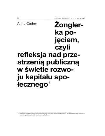 38 kultura popularna 2012 nr 4 (34) !"#$%&' ()*+!' ,-./%01* .23$/* &%4%(5,)*")6*+&2%' 57&2%"/8*+9:$/.2"8* ;*<;/%7$%*&!2;!' ,9*()+/7)=9*5+!' >? =%.2"%#! Anna Cudny 1 Powyższy tekst jest jedynie zasygnalizowaniem badanego przez autorkę tematu. Ze względu na jego rozległość pewne zagadnienia zostały przedstawione hasłowo. Anna Cudny Żonglerka pojęciem, cz yli refleksja nad przestrzenią publiczną !"#$%&'( to umiejętność utrzymania w powietrzu w jednym czasie, dzięki ciągłemu wyłapywaniu i wyrzucaniu, większej liczby przedmiotów niż używana do wykonywania tej czynności liczba rąk. Żonglować można piłkami, maczugami, obręczami. Można również słowem, „przerzucając” faktyczne znaczenia pojęć. W ostatnich latach pojęcie przestrzeni publicznej stało się niezwykle popularne. Można zaryzykować stwierdzenie, że jest ono wręcz modne, a używanie go – w przeróżnych kontekstach – należy do dobrego tonu, ułatwia rozmowę i świadczy o propagacji egalitaryzmu. Bo przecież jeśli przestrzeń jest publiczna, to dla wszystkich. Jest jak piłka, którą podrzucamy do góry, kiedy należy pokazać coś efektownego. Tak też dla socjologów i działaczy społecznych przestrzeń ta często staje się tożsama z przestrzenią społeczną, dla dziennikarzy – z przestrzenią mediów, a dla polityków reprezentujących odmienne orientacje światopoglądowe czasami zrównuje się znaczeniowo ze społeczeństwem. Jak widać, tak dobrze znane nam – artystom, architektom, badaczom przestrzeni – pojęcie urbanistyczne stało się niezwykle pojemne i jest wykorzystywane częściej w celach retorycznych niż jako element rzeczowej naukowej argumentacji na użytek wielu dziedzin. Zupełnie niesłusznie. Właściwa definicja brzmi: „Przestrzeń publiczna to obszar o szczególnym znaczeniu dla zaspokajania potrzeb mieszkańców, poprawy jakości ich życia i sprzyjający nawiązywaniu kontaktów społecznych ze względu na jego położenie oraz cechy funkcjonalno-przestrzenne; określony w studium uwarunkowań i kierunków zagospodarowania przestrzennego gminy” (Ustawa, 2003). @%A"/!;)"/%*()+/7)=9* 5+!=%.2"%#! Podobne zjawisko zachodzi w odniesieniu do pojęcia kapitału społecznego, które na dobre zagościło w dyskursie społecznym i zaczęło funkcjonować jako kategoria pojęciowa wykorzystywana w analizach problemów z niemal wszystkich dziedzin życia (Psyk-Piotrowska, 2009), aczkolwiek w tym przypadku nie jest to nieprawidłowe użycie pojęcia, a brak spójnego definiowania, wynikający z faktu, że jest to pojęcie stosunkowo nowe i wciąż badane – zarówno pod względem źródeł, jak i konsekwencji istnienia. Pojęcie kapitał społeczny po raz pierwszy zostało użyte w pierwszej dekadzie XX wieku przez Lydę Hanifana dla określenia dobrej woli, stosunków przyjacielskich i sympatii w stosunkach międzyludzkich. Koncepcja kapitału rozwijana była w latach 50. i 60. Tamtego stulecia, kiedy to wykształciły się dwa podstawowe nurty jego rozumienia. Pierwszy z nich, reprezentowany przez Roberta Putnama, mówi, że :„Kapitał społeczny odnosi się tu do takich cech organizacji społeczeństwa, jak zaufanie, normy i powiązania, które mogą zwiększyć sprawność społeczeństwa ułatwiając skoordynowane działania: » Tak jak i inne postaci kapitału, kapitał społeczny jest produktywny, umożliwia bowiem osiągnięcie pewnych celów, których nie dałoby się osiągnąć, gdyby go zabrakło« [ … ]” (Putnam, 1995: 285). Warto tu zwrócić uwagę na „niejasności definicji, która — jak wynika z powyższego cytatu — nie określa dokładnie, czym kapitał społeczny jest, lecz zaledwie wskazuje, do czego się odnosi. Skutkiem tego jest niezwykła dowolność zastosowania i często hasłowe traktowanie omawianego pojęcia” (Zarycki, 2004). Co istotne w tym kontekście, w ujęciu 39 B"")*C96"3* !"#$%&'()')"*!"+,-./(0')"! 1-.&'($%0&)&!2"#,3"/,)&(45!1#-/"63&!3"47$&"! 3!8#-4()'9/!:#+"0&,';$30;$%!/!1#"$-/0&!<-=8-3;$4&!>#+"0&,';$30(4! 0"!2;63&".(!?#$%&'()':#;! 125!1&,3(!6-)'-#"'! -!#(."$4&!$3@-/&()"!&!:#+"0&,';)&*!)'9#(A-!&,'-'0B! $37C$&B!+763&(!'(="'! (6:)"$4&!"#$%&'()'-0&$30(4! &!8#3(,'#3(00(45!1#-4()':4(!/07'#3"*!=".:4(!0"! ')"0&0"$%*!D-'-A#"D:4(5 40 kultura popularna 2012 nr 4 (34) Putnama kapitał społeczny jest cechą przypisywaną nie poszczególnym jednostkom, ale grupom społecznym, w szczególności społecznościom regionalnym czy lokalnym. W tym rozumieniu wiązany jest niejako z ogólną sumą zaufania mieszkańców danej wspólnoty wobec siebie oraz różnego rodzaju instytucji. Przedstawicielem drugiego nurtu jest Pierre Bourdieu, który definiuje kapitał społeczny jako „sumę zasobów aktualnych i potencjalnych, które należą się jednostce lub grupie z tytułu posiadania trwałej, mniej lub bardziej zinstytucjonalizowanej, sieci relacji, znajomości, uznania wzajemnego. To znaczy jest sumą kapitałów i władzy, które sieć taka może zmobilizować” (Bourdieu W., Wacquant L., 2001: 104 – 105). Kapitał społeczny jest jednym z trzech rodzajów kapitałów, wyróżnionych przez Bourdieu, obok kapitału ekonomicznego i kulturowego. Bez względu na przyjętą koncepcję, czynnikiem podstawowym podlegającym badaniom, mierzonym ilościowo (nie jakościowo), kształtującym kapitał społeczny jest zaufanie. „Wiąże się ono bezpośrednio z kształtowaniem postaw, które za pomocą świadomej komunikacji społecznej budują kooperację oraz wzmagają kreatywność indywidualną i społeczną. Zaufanie społeczne powoduje również wzrost partycypacji społecznej [ … ] [ tym samym – przyp. aut. ] wpływu obywateli na życie publiczne” (Strategia Rozwoju Kapitału Społecznego: 114). Najczęściej stosowanym w badaniach miernikiem tego typu zaufania jest odsetek osób zgadzających się ze stwierdzeniem: większości ludzi można ufać (Psyk-Piotrowska, 2009). A sam kapitał, pomijając wyjątki zale