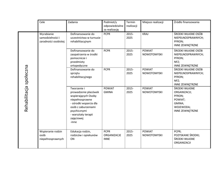 Cele Rehabilitacja społeczna Wyrabianie samodzielności i zaradności osobistej Wspieranie rodzin osób niepełnosprawnych Zadania Podmiot/y Termin odpowiedzialne realizacji za realizację PCPR 20152025 Miejsce realizacji Źródło finansowania KRAJ ŚRODKI WŁASNE OSÓB NIEPEŁNOSPRAWNYCH; PFRON; INNE ZEWNĘTRZNE Dofinansowanie do zaopatrzenia w środki pomocnicze i przedmioty ortopedyczne Dofinansowanie do sprzętu rehabilitacyjnego PCPR 20152025 POWIAT NOWOTOMYSKI PCPR 20152025 POWIAT NOWOTOMYSKI Tworzenie i prowadzenie placówek wspierających Osoby niepełnosprawne - ośrodki wsparcia dla osób z zaburzeniami psychicznymi - warsztaty terapii zajęciowej -inne POWIAT GMINA 20152025 POWIAT NOWOTOMYSKI ŚRODKI WŁASNE OSÓB NIEPEŁNOSPRAWNYCH; PFRON; NFZ; INNE ZEWNĘTRZNE ŚRODKI WŁASNE OSÓB NIEPEŁNOSPRAWNYCH; PFRON; NFZ; INNE ZEWNĘTRZNE ŚRODKI WŁASNE ORGANIZACJI; PFRON; POWIAT; GMINA; WOJEWODA; INNE ZEWNĘTRZNE Edukacja rodzin, rodziców i opiekunów ON PCPR ORGANIZACJE INNE 20152025 POWIAT NOWOTOMYSKI Dofinansowanie do uczestnictwa w turnusie rehabilitacyjnym PCPR; POZYSKANE ŚRODKI; ŚRODKI WŁASNE ORGANIZACJI Likwidacja barier Umożliwienie kształcenia osób niepełnosprawnych Aktywizacja osób zagrożonych wykluczeniem społecznym Likwidacja barier architektonicznych, technicznych i w komunikowaniu się PCPR 20152025 POWIAT NOWOTOMYSKI PFRON; ŚRODKI WŁASNE OSÓB NIEPEŁNOSPRAWNYCH; ŚRODKI WŁASNE ORGANIZACJI; Przystosowywanie obiektów publicznych do potrzeb osób niepełnosprawnych POWIAT GMINA INNE 20152025 Likwidacja barier w dostępie do edukacji poprzez realizowanie różnych programów Tworzenie oddziałów integracyjnych PCPR 20152025 POWIAT NOWOTOMYSKI PFRON; ŚRODKI WŁASNE OSÓB NIEPEŁNOSPRAWNYCH GMINA POWIAT 20152025 POWIAT NOWOTOMYSKI Edukacja kadry mającej kontakt z osobami niepełnosprawnymi PCPR POWIAT GMINA 20152025 POWIAT NOWOTOMYSKI POWIAT; GMINA; PFRON POWIAT; GMINA; PFRON; POZYSKANE ŚRODKI Kształtowanie właściwych postaw i zachowań osób pełnosprawnych w stosunku do osób niepełnosprawnych Podejmowanie działań mających na celu wykorzystywanie środków zewnętrznych. PCPR POWIAT GMINA 20152025 POWIAT NOWOTOMYSKI POWIAT; GMINA; PFRON; POZYSKANE ŚRODKI PCPR PARTNERZY PUP INNE 20152025 POWIAT NOWOTOMYSKI PFRON; ŚRODKI ZEWNĘTRZNE; ŚRODKI WŁASNE MIEJSCE ZAMIESZKANIE OSÓB NIEPEŁNOSPRAWNYCH POWIAT PFRON; NOWOTOMYSKI WŁAŚCICIEL OBIEKTU OBIEKTY PUBLICXNE Rehabilitacja społeczna Rehabilitacja społeczna Podejmowanie działań mających na celu aktywizację społeczną i w życiu rodzinnym PCPR PARTNERZY PUP INNE 20152025 POWIAT NOWOTOMYSKI PFRON; ŚRODKI ZEWNĘTRZNE; ŚRODKI WŁASNE Pomoc w tworzeniu i wspieranie: - klubów - grup wsparcia - stowarzyszeń PCPR INNE 20152025 POWIAT NOWOTOMYSKI POWIAT; POZYSKANE ŚRODKI Wspieranie organizacji pozarządowych działających na rzecz osób niepełnosprawnych - pomoc w przygotowaniu projektów umożliwiających pozyskiwaniu środków - pomoc organizowaniu imprez integracyjnych - dofinansowanie do zadań z zakresu sportu, kultury, rekreacji i turystyki POWIAT GMINA PCPR 20152025 POWIAT NOWOTOMYSKI GMINA PCPR PFRON; ŚRODKI WŁASNE ORGANIZACJI; POWIAT; POZYSKANE ŚRODKI Nabywanie nowych umiejętności Rozwijanie samodzielności, kompetencji i możliwości samorealizacji Rozwijanie aktywności społecznej osób niepełnosprawnych Rehabilitacja zawodowa Aktywizacja zawodowa osób niepełnosprawnych Przyznanie osobie niepełnosprawnej środków na podjęcie działalności gospodarczej, rolniczej, wniesienie wkładu do spółdzielni socjalnej PUP 20152025 POWIAT NOWOTOMYSKI PFRON; ŚRODKI WŁASNE Zapewnienie osobie niepełnosprawnej równego dostępu do rynku pracy PUP 20152025 POWIAT NOWOTOMYSKI Zwrot kosztów pracodawcy za wyposażenie stanowiska pracy osobie niepełnosprawnej Pośrednictwo pracy i poradnictwo zawodowe PUP 20152025 POWIAT NOWOTOMYSKI PUP; PFRON; POWIAT; GMINA; INNE PFRON; ŚRODKI WŁASNE PRACODAWCY PUP 20152025 POWIAT NOWOTOMYSKI PUP Organizowanie szkoleń dla osób niepełnosprawnych Wspieranie stażu ON PUP 20152025 POWIAT NOWOTOMYSKI PUP ; PFRON PUP POWIAT 20152025 POWIAT NOWOTOMYSKI Pozyskiwanie środków celem zwiększenia liczby miejsc zatrudnienia PUP 20152025 POWIAT NOWOTOMYSKI PUP; PFRON; INNE PFRON Przestrzeganie praw osób niepełnosprawnych Aktywizacja osób zagrożonych wykluczeniem społecznym Dofinansowanie do oprocentowania kredytu bankowego dla osoby niepełnosprawnej Podejmowanie działań mających na celu wykorzystywanie środków zewnętrznych. Podejmowanie działań mających na celu aktywizację zawodową osób niepełnosprawnych Nabywanie nowych umiejętności, rozwijanie samodzielności i kompetencji osób niepełnosprawnych Zapewnienie osobom niepełnosprawnym możliwości reprezentowania swojego środowiska przy przedsięwzięciach na rzecz rehabilitacji społecznej i zawodowej: Działanie Społecznej Powiatowej Rady ds. Osób Niepełnosprawnych Dostęp do wszechstronnej rehabilitacji PUP PFRON; ŚRODKI WŁASNE 20152025 POWIAT NOWOTOMYSKI PCPR PARTNERZY PUP INNE PCPR PARTNERZY PUP INNE 20152025 POWIAT NOWOTOMYSKI PFRON; ŚRODKI ZEWNĘTRZNE; ŚRODKI WŁASNE 20152025 POWIAT NOWOTOMYSKI PFRON; ŚRODKI ZEWNĘTRZNE; ŚRODKI WŁASNE PCPR POWIAT GMINA STAROSTWO ORGANIZACJE INNE 20152025 POWIAT NOWOTOMYSKI PFRON POWIAT GMINA ŚRODKI WŁASNE PCPR ŚRODKI WŁASNE STAROSTWA POZYSKANE ŚRODKI ŚRODKI WŁASNE ORGANIZACJI INNE PCPR POWIAT GMINA ORGANIZACJE 20152025 POWIAT NOWOTOMYSKI PFRON POWIAT GMINA ŚRODKI WŁASNE PCPR Przestrzeganie praw osób niepełnosprawnych INNE POZYSKANE ŚRODKI ŚRODKI WŁASNE ORGANIZACJI INNE PFRON; POWIAT; GMINA; ŚRODKI WŁASNE PCPR; ŚRODKI WŁASNE STAROSTWA POZYSKANE ŚRODKI; ŚRODKI WŁASNE; ORGANIZACJI; INNE PFRON; POZYSKANE ŚRODKI; WŁAŚCICIELE OBIEKTÓW Pełne uczestnictwo w życiu społecznym, kulturalnym, publicznym, sportowym, artystycznym PCPR POWIAT GMINA ORGANIZACJE STAROSTWO INNE 20152025 POWIAT NOWOTOMYSKI Funkcjonowanie 