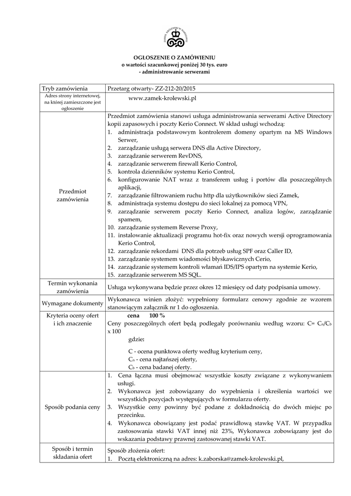 OGŁOSZENIE O ZAMÓWIENIU o wartości szacunkowej poniżej 30 tys. euro - administrowanie serwerami Tryb zamówienia Przetarg otwarty- ZZ-212-20/2015 Adres strony internetowej, na której zamieszczone jest ogłoszenie Przedmiot zamówienia Termin wykonania zamówienia Wymagane dokumenty Kryteria oceny ofert i ich znaczenie www.zamek-krolewski.pl Przedmiot zamówienia stanowi usługa administrowania serwerami Active Directory kopii zapasowych i poczty Kerio Connect. W skład usługi wchodzą: 1. administracja podstawowym kontrolerem domeny opartym na MS Windows Serwer, 2. zarządzanie usługą serwera DNS dla Active Directory, 3. zarządzanie serwerem RevDNS, 4. zarządzanie serwerem firewall Kerio Control, 5. kontrola dzienników systemu Kerio Control, 6. konfigurowanie NAT wraz z transferem usług i portów dla poszczególnych aplikacji, 7. zarządzanie filtrowaniem ruchu http dla użytkowników sieci Zamek, 8. administracja systemu dostępu do sieci lokalnej za pomocą VPN, 9. zarządzanie serwerem poczty Kerio Connect, analiza logów, zarządzanie spamem, 10. zarządzanie systemem Reverse Proxy, 11. instalowanie aktualizacji programu hot-fix oraz nowych wersji oprogramowania Kerio Control, 12. zarządzanie rekordami DNS dla potrzeb usług SPF oraz Caller ID, 13. zarządzanie systemem wiadomości błyskawicznych Cerio, 14. zarządzanie systemem kontroli włamań IDS/IPS opartym na systemie Kerio, 15. zarządzanie serwerem MS SQL. Usługa wykonywana będzie przez okres 12 miesięcy od daty podpisania umowy. Wykonawca winien złożyć: wypełniony formularz cenowy zgodnie ze wzorem stanowiącym załącznik nr 1 do ogłoszenia. cena 100 % Ceny poszczególnych ofert będą podlegały porównaniu według wzoru: C= Cn/Cb x 100 gdzie: 1. 2. Sposób podania ceny 3. 4. Sposób i termin składania ofert C - ocena punktowa oferty według kryterium ceny, Cn - cena najtańszej oferty, Cb - cena badanej oferty. Cena łączna musi obejmować wszystkie koszty związane z wykonywaniem usługi. Wykonawca jest zobowiązany do wypełnienia i określenia wartości we wszystkich pozycjach występujących w formularzu oferty. Wszystkie ceny powinny być podane z dokładnością do dwóch miejsc po przecinku. Wykonawca obowiązany jest podać prawidłową stawkę VAT. W przypadku zastosowania stawki VAT innej niż 23%, Wykonawca zobowiązany jest do wskazania podstawy prawnej zastosowanej stawki VAT. Sposób złożenia ofert: 1. Pocztą elektroniczną na adres: [email protected], 2. 3. faksem na nr: (22) 35 55 219 lub na adres: Zamek Królewski w Warszawie – Muzeum; Kancelaria Główna Plac Zamkowy 4, 00-277 Warszawa Termin składania ofert upływa dnia 26.06.2015 r. o godz. 9.00 Termin związania ofertą Termin związania ofertą wynosi 30 dni. Bieg terminu związania ofertą rozpoczyna się wraz z upływem terminu składania ofert. Oferty złożone po terminie składania ofert nie będą brane pod uwagę. Zamawiający zastrzega sobie prawo do zmiany treści ogłoszenia lub odwołania przetargu. Zamawiający zastrzega sobie prawo zamknięcia przetargu bez dokonania wyboru którejkolwiek z ofert bez podawania przyczyny. Za chwilę zawarcia umowy uważa się podpisanie przez Strony umowy w formie pisemnej. Wzór formularza cenowego stanowi integralną część ogłoszenia. I ZASTĘPCA DYREKTORA ds. Zarządzania Zamku Królewskiego w Warszawie – Muzeum /…/ Irena Zalewska
