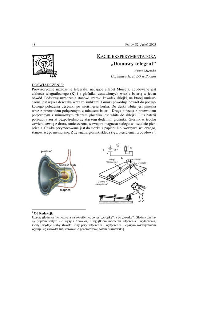 48 FOTON 82, Jesień 2003 KĄCIK EKSPERYMENTATORA „Domowy telegraf” Anna Micuda Uczennica kl. Ib LO w Bochni DOŚWIADCZENIE: Prowizoryczne urządzenie telegrafu, nadające alfabet Morse’a, zbudowane jest z klucza telegraficznego (K) i z głośnika, zestawionych wraz z baterią w jeden obwód. Podstawę urządzenia stanowi szeroki kawałek sklejki, na której umieszczona jest wąska deseczka wraz ze śrubkami. Gumki powodują powrót do początkowego położenia deseczki po naciśnięciu korka. Do deski wbita jest pinezka wraz z przewodem połączonym z minusem baterii. Druga pinezka z przewodem połączonym z minusowym złączem głośnika jest wbita do sklejki. Plus baterii połączony został bezpośrednio ze złączem dodatnim głośnika. Głośnik w środku zawiera cewkę z drutu, umieszczoną wewnątrz magnesu stałego w kształcie pierścienia. Cewka przymocowana jest do stożka z papieru lub tworzywa sztucznego, stanowiącego membranę. Z zewnątrz głośnik składa się z pierścienia i z obudowy1. 1 Od Redakcji: Użycie głośnika nie pozwala na określenie, co jest „kropką”, a co „kreską”. Głośnik zasilany prądem stałym nie wysyła dźwięku, z wyjątkiem momentu włączenia i wyłączenia, kiedy „wydaje słaby stukot”, inny przy włączeniu i wyłączeniu. Lepszym rozwiązaniem wydaje się żarówka lub sterowanie generatorem [Adam Starnawski]. FOTON 82, Jesień 2003 49 Budowa głośnika Budowa klucza OBSERWACJA: Po uruchomieniu klucza, w momencie kiedy dwie pinezki zetkną się, obwód zaczyna działać, a głośnik wydaje dźwięki krótkie lub długie. Membrana przemieszcza się do wnętrza oraz na zewnątrz głośnika, co możemy wyczuć, dotykając ją lekko palcami. WNIOSKI: Naciskając klucz, zamykamy obwód prądu, który płynie z baterii przez uzwojenie. Prąd płynie przez cewkę wewnątrz głośnika, umieszczoną w polu magnesu. Zależnie od kierunku, w którym płynie prąd, cewka jest przyciągana lub odpychana przez magnes. W ten sposób sygnał elektryczny wprawia cewkę w drgania. Membrana, do której przymocowana jest cewka, drga razem z nią. Drgania stożka wywołują zmiany ciśnienia w powietrzu (znajdującego się w jego pobliżu) i jego rozchodzenie w postaci fal. Ucho ludzkie odbiera te fale jako dźwięk. Krótkie i długie dźwięki odpowiadają poszczególnym literom alfabetu Morse’a. Urządzenie działa tylko wtedy, gdy obwód jest zamknięty i następuje przepływ prądu. A ._ B _... C _._. D _.. E. F .._. G _ _. H .... I .. J ._ _ _ K _._ L ._.. M__ N _. O___ P ._._ R ._. S ... T_ U .._ W ._ _ X _. Y _._ _ Z _ _..