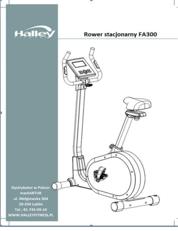 Dystrybutor w Polsce: markARTUR ul. Mełgiewska 30d 20-234 Lublin Tel.: 81-745-09-10 WWW.HALLEYFITNESS.PL Rower stacjonarny FA300 INDEKS Instrukcje montażowe: rysunki, części, regulacja Instrukcja obsługi użytkownika • Instrukcje • Komputer • Gwarancja Widok rozstrzelony i lista części 10 PL – Wstęp Drogi kliencie, Jesteśmy wdzięczni za zaufanie i zakup niniejszego produktu. Przed rozpoczęciem użytkowania niniejszego produktu prosimy uważnie przeczytać instrukcję oraz zachować ją na wypadek potrzeby jej użycia w przyszłości. W przypadku jakichkolwiek wątpliwości po przeczytaniu instrukcji prosimy nas powiadomić przez portal www.halleyfitness.pl WAŻNE • Niniejszy produkt został zaprojektowany i przetestowany wyłącznie do użytku domowego zgodnie z normą EN 957-1/5 klasy HB. Gwarancja oraz odpowiedzialność producenta nie obejmuje żadnego produktu lub uszkodzenia produktu powstałego na skutek użytku komercyjnego. •Czujnik tętna nie jest urządzeniem medycznym. Ze względu na różne czynniki, może się zdarzyć, że wskazane tętno nie odpowiada tętnu rzeczywistemu. Pomiar tętna, wyświetlanie przybliżonych wartości tętna służy po prostu jako pomoc podczas ćwiczenia. •Pamiętaj, że możesz zwiększyć lub zmniejszyć intensywność ćwiczeń przy użyciu komputera (patrz instrukcja do komputera). KONSERWACJA •Regularnie kontrolować sprzęt w celu wykrycia wszelkich uszkodzeń lub zużycia, które mogą się pojawić. •Zwrócić szczególną uwagę na części, które najszybciej się zużywają. •Bezzwłocznie wymieniać wszelkie wadliwe części unikając stosowania sprzętu aż do chwili, gdy będzie on ponownie w doskonałym stanie. •Zaleca się smarowanie od czasu do czasu części ruchomych w celu zapobieżenia ich przedwczesnego zużycia. •Regularnie sprawdzać czy nakrętki i śruby są odpowiednio dokręcone. •Pamiętaj, że pot jest żrący. Nie dopuszczać do kontaktu ze sprzętem. • Sprzęt czyścić przy pomoc wilgotnej gąbki. • Poziom bezpieczeństwa sprzętu można utrzymać wyłącznie w przypadku jego regularnej kontroli. ZDROWIE I BEZPIECZEŃSTWO Użytkownik odpowiada za wszelkie ryzyko urazów, które mogą wystąpić na skutek użytkowania niniejszego sprzętu. Ryzyka można zminimalizować stosując poniższe zasady: •Sprzęt zamontować na czystej, płaskiej powierzchni pozostawiając przynajmniej metr wolnego miejsca wokół. Nie użytkować sprzętu w pobliżu wody lub na zewnątrz. •Chronić przed dziećmi i zwierzętami. W żadnym wypadku nie zostawiać dziecka w pobliżu sprzętu bez kontroli osoby dorosłej. • Nie wolno obciążać sprzętu powyżej 120 kg. • Zawsze nosić odpowiedni strój i obuwie sportowe. • Sprzęt nie jest przeznaczony w celach leczniczych. •Niniejszy sprzęt przeznaczony jest do domowego użytku dlatego też producent nie przyjmuje odpowiedzialności za inne sposoby użytkowania (sale gimnastyczne, kluby sportowe, itd.) •W przypadku zawrotów głowy, mdłości, bólu w klatce piersiowej lub innych niepokojących objawów, zaprzestań wykonywania ćwiczenia i skonsultuj się z lekarzem. • W żadnym wypadku nie wstrzymuj oddechu podczas ćwiczeń •W żadnym wypadku nie rozpoczynaj programu ćwiczeń bez konsultacji z lekarzem jeśli zmagasz się lub zmagałeś z jakąkolwiek dolegliwością fizyczną. • Nie ćwicz 30-60 minut przed lub po posiłku. •Przed rozpoczęciem jakiegokolwiek programu ćwiczeń należy wziąć pod uwagę wiek oraz poziom sprawności fizycznej. W przypadku siedzącego trybu życia, istotna jest konsultacja z lekarzem w celu określenia właściwego poziomu intensywności ćwiczeń. Nie spodziewaj się osiągnięcia maksymalnych wyników ćwiczeń w ciągu pierwszych kilku sesji. Każdą sesję należy rozpoczynać stopniową 3-5-minutową rozgrzewką. Jest to szczególnie zalecane dla osób powyżej 50 roku życia. Rozpoczynaj od stopniowej rozgrzewki, zmniejszaj intensywność ćwiczeń pod koniec. W przypadku narzucenia sobie bardzo wysokiego tempa na początku sesji, możesz szybko się zmęczyć i doznać kontuzji. •Osoby niepełnosprawne nie powinny użytkować niniejszego sprzętu bez kontroli specjalisty lub właściwego lekarza. •Osoby odpowiedzialne za dzieci powinny być świadome powagi swojego zadania, gdyż naturalny instynkt dziecka do zabawy oraz tendencja do eksperymentowania może doprowadzić do sytuacji i zachowań niedozwolonych podczas użytkowania niniejszego sprzętu. •W przypadku użytkowania sprzętu przez dzieci należy wziąć pod uwagę ich poziom mentalny i fizyczny oraz temperament. Należy je monitorować oraz poinformować na temat właściwego użytkowania sprzętu. W żadnym razie nie należy traktować niniejszego sprzętu jako obiektu do zabawy dla dziecka. Mając na względzie stałe ulepszanie sprzętu, producent zastrzega sobie prawo do dokonywania wszelkich zmian jakie uważa za właściwe zarówno dotyczących sprzętu jak i instrukcji obsługi. UWAGA Pilnować, aby dzieci nie wkładały rąk w ruchome części sprzętu. Przeczytać instrukcję obsługi w celu uniknięcia wszelkich wypadków. PL - Komputer ELEMENTY 1. Termometr: Wyświetlacz wskazuje temperaturę w trybie oczekiwania 2. Dane użytkownika: na komputerze można zarejestrować do 4 użytkowników. W celu wprowadzenia rekordu należy wprowadzić następujące dane: Numer Użytkownika (U1→U4)/Płeć/Wiek/Wzrost/Wagę. 3. U0: ustawienia użytkownika niewymagane 4. Szybki Start: naciśnij przycisk „Szybki Start” w celu rozpoczęcia treningu w trybie ręcznym. Poziom oporu można zmieniać podczas treningu. 5. Manualna: w ramach funkcji manualnej można ustawić poziom oporu, odległość, czas, kalorie oraz tętno. 6. Program: Komputer wyposażony jest w 12 wcześniej ustawianych programów o różnych profilach treningowych. W celu rozpoczęcia treningu należy wybrać program oraz ustawić czas. 7. Stała nat