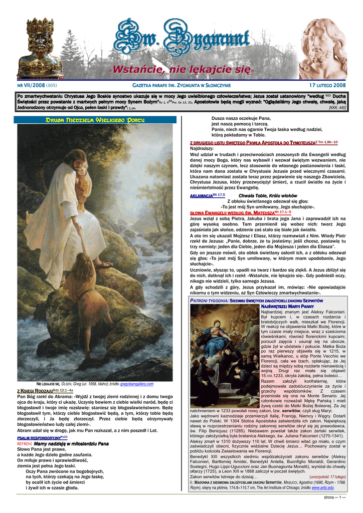 Wstańcie, nie lękajcie się« » NR VII/2008 (305) GAZETKA PARAFII ŚW W. ZYGMUNTA W SŁOMCZYNIE 17 LUTEGO 2008 Po zmartwychwstaniu Chrystusa Jego Boskie synostwo ukazuje się w mocy Jego uwielbionego człowieczeństwa; Jezus został ustanowiony "według 653 Ducha Świętości przez powstanie z martwych pełnym mocy Synem Bożym"Rz 1, 455Por. Dz 13, 33. Apostołowie będą mogli wyznać: "Oglądaliśmy Jego chwałę, chwałę, jaką [KKK, 445] Jednorodzony otrzymuje od Ojca, pełen łaski i prawdy"J 1,14. DRUGA NIEDZIELA WIELKIEGO POSTU Dusza nasza oczekuje Pana, jest naszą pomocą i tarczą. Panie, niech nas ogarnie Twoja łaska według nadziei, którą pokładamy w Tobie. Z DRUGIEGO LISTU ŚWIĘTEGO PAWŁA APOSTOŁA DO TYMOTEUSZA2 Tm 1,8b–10 Najdroższy: Weź udział w trudach i przeciwnościach znoszonych dla Ewangelii według danej mocy Boga, który nas wybawił i wezwał świętym wezwaniem, nie dzięki naszym czynom, lecz stosownie do własnego postanowienia i łaski, która nam dana została w Chrystusie Jezusie przed wiecznymi czasami. Ukazana natomiast została teraz przez pojawienie się naszego Zbawiciela, Chrystusa Jezusa, który przezwyciężył śmierć, a rzucił światło na życie i nieśmiertelność przez Ewangelię. AKLAMACJAMt 17,5 Chwała Tobie, Królu wieków Z obłoku świetlanego odezwał się głos: »To jest mój Syn umiłowany, Jego słuchajcie«. SŁOWA EWANGELII WEDŁUG ŚW. MATEUSZAMt 17,1–9 Jezus wziął z sobą Piotra, Jakuba i brata jego Jana i zaprowadził ich na górę wysoką osobno. Tam przemienił się wobec nich: twarz Jego zajaśniała jak słońce, odzienie zaś stało się białe jak światło. A oto im się ukazali Mojżesz i Eliasz, którzy rozmawiali z Nim. Wtedy Piotr rzekł do Jezusa: „Panie, dobrze, że tu jesteśmy; jeśli chcesz, postawię tu trzy namioty: jeden dla Ciebie, jeden dla Mojżesza i jeden dla Eliasza”. Gdy on jeszcze mówił, oto obłok świetlany osłonił ich, a z obłoku odezwał się głos: »To jest mój Syn umiłowany, w którym mam upodobanie, Jego słuchajcie«. Uczniowie, słysząc to, upadli na twarz i bardzo się zlękli. A Jezus zbliżył się do nich, dotknął ich i rzekł: »Wstańcie, nie lękajcie się«. Gdy podnieśli oczy, nikogo nie widzieli, tylko samego Jezusa. A gdy schodzili z góry, Jezus przykazał im, mówiąc: »Nie opowiadajcie nikomu o tym widzeniu, aż Syn Człowieczy zmartwychwstanie«. PATRONI TYGODNIA: SIEDMIU ŚWIĘTYCH ZAŁOŻYCIELI ZAKONU SERWITÓW NAJŚWIĘTSZEJ MARYI PANNY NIE LĘKAJCIE SIĘ, OLSEN, Greg (ur. 1958, Idaho); źródło gregolsengallery.com Z KSIĘGI RODZAJURdz 12,1–4a Pan Bóg rzekł do Abrama: »Wyjdź z twojej ziemi rodzinnej i z domu twego ojca do kraju, który ci ukażę. Uczynię bowiem z ciebie wielki naród, będę ci błogosławił i twoje imię rozsławię: staniesz się błogosławieństwem. Będę błogosławił tym, którzy ciebie błogosławić będą, a tym, którzy tobie będą złorzeczyli, i Ja będę złorzeczył. Przez ciebie będą otrzymywały błogosławieństwo ludy całej ziemi«. Abram udał się w drogę, jak mu Pan rozkazał, a z nim poszedł i Lot. PSALM RESPONSORYJNYPs33 REFREN: Mamy nadzieję w miłosierdziu Pana Słowo Pana jest prawe, a każde Jego dzieło godne zaufania. On miłuje prawo i sprawiedliwość, ziemia jest pełna Jego łaski. Oczy Pana zwrócone na bogobojnych, na tych, którzy czekają na Jego łaskę, by ocalił ich życie od śmierci i żywił ich w czasie głodu. Najbardziej znanym jest Aleksy Falconieri. Był kupcem i, w czasach rozdarcia i bratobójczych walk, mieszkał we Florencji. W reakcji na objawienia Matki Bożej, które w tym czasie miały miejsce, wraz z sześcioma rówieśnikami, również florenckimi kupcami, porzucił zajęcia i usunął się na ubocze, gdzie żył w ubóstwie i pokucie. Matka Boża po raz pierwszy objawiła się w 1215, w samą Wielkanoc, u stóp Ponte Vecchio we Florencji, cała we łzach, opłakując, że Jej dzieci są między sobą rozdarte nienawiścią i wojną. Drugi raz miała się objawić 15.VIII.1233, okryta żałobą, pełna boleści… Razem założyli konfraternię, która podejmowała zadośćuczynienie za życie i grzechy współziomków. Z czasem przeniosła się ona na Monte Senario. Jej członkowie rozważali Mękę Pańską i mieli żywą cześć do Matki Bożej Bolesnej. Za Jej natchnieniem w 1233 powołali nowy zakon, tzw. serwitów, czyli sług Maryi. Jako wędrowni kaznodzieje przemierzyli Italię, Francję, Niemcy i Węgry. Dotarli nawet do Polski. W 1304 Stolica Apostolska zatwierdziła ich zakon. Największą sławą w rozprzestrzenianiu rodziny zakonnej serwitów okrył się jej prawodawca, św. Filip Benicjusz (†1285). Niebawem powstał także zakon żeński serwitek, którego założycielką była bratanica Aleksego, św. Juliana Falconieri (1270-1341). Aleksy zmarł w 1310 dożywszy 110 lat. W chwili śmierci witać go miało, o czym zaświadczyli obecni, fizycznie widzialne Dziecię Jezus… Pochowany został w pobliżu kościoła Zwiastowania we Florencji. Benedykt XIII wszystkich siedmiu współzałożycieli zakonu serwitów (Aleksy Falconieri, Bartłomiej Amidei, Benedykt Antella, Buonfiglio Monaldi, Gerardino Sostegni, Hugo Lippi-Uguccioni oraz Jan Buonagiunta Monetti), wyniósł do chwały ołtarzy (1725), a Leon XIII w 1888 zaliczył w poczet świętych. (uroczystość 17 lutego) Zakon serwitów Istnieje do dzisiaj… il.: MADONNA Z SIEDMIOMA ZAŁOŻYCIELAMI ZAKONU SERWITÓW, MASUCCI, Agostino (1690, Rzym - 1768, Rzym), olejny na płótnie, 174.8×115.7 cm, The Art Institute of Chicago; źródło www.artic.edu strona — 1 — NR VII/2008 (305) INFORMACJE PARAFIALNE Nabożeństwa wielkopostne odprawiane są według następującego porządku: DROGA KRZYŻOWA- w każdy piątek Wielkiego Postu: o 17:30. Po zakończeniu ferii zimowych, tj. od 24.II, będzie to nabożeństwo tylko dla dorosłych. Dla dzieci i młodzieży odprawiane będą odrę