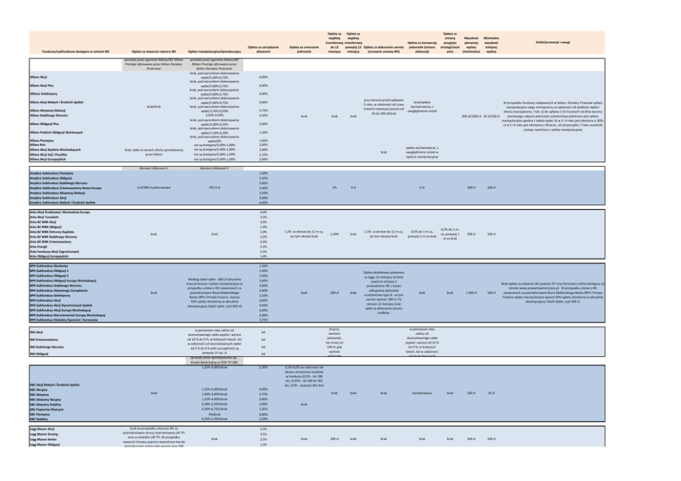 Fundusze/subfundusze dostępne w ramach IKE Opłata za otwarcie rejestru IKE Opłata manipulacyjna/dystrybucyjna sprzedaż przez agentów Allianz/IKE Allianz Prestige oferowane przez Xelion.Doradcy Finansowi sprzedaż przez agentów Allianz/IKE Allianz Prestige oferowane przez Xelion.Doradcy Finansowi brak, pod warunkiem dokonywania wpłat/5,00%-0,75% brak, pod warunkiem dokonywania wpłat/5,00%-0,75% brak, pod warunkiem dokonywania wpłat/5,00%-0,75% brak, pod warunkiem dokonywania wpłat/5,00%-0,75% brak, pod warunkiem dokonywania wpłat/3,50%-0,50% 3,50%-0,50% brak, pod warunkiem dokonywania wpłat/2,00%-0,25% brak, pod warunkiem dokonywania wpłat/1,50%-0,20% brak, pod warunkiem dokonywania wpłat/0% nie są dostępne/5,00%-1,00% nie są dostępne/5,00%-1,00% nie są dostępne/5,00%-1,00% nie są dostępne/5,00%-1,00% Allianz Akcji Allianz Akcji Plus Alllianz Selektywny Allianz Akcji Małych i Średnich Spółek brak/brak Allianz Aktywnej Alokacji Allianz Stabilnego Wzrostu Allianz Obligacji Plus Allianz Polskich Obligacji Skarbowych Allianz Pieniężny Allianz Bric Allianz Akcji Rynków Wschodzących Allianz Akcji Azji i Pacyfiku Allianz Akcji Europejskich brak, tylko w ramach oferty sprzedawanej przez Xelion Wariant I/Wariant II Amplico Subfundusz Pieniężny Amplico Subfundusz Obligacji Amplico Subfundusz Stabilnego Wzrostu Amplico Subfundusz Zrównoważony Nowa Europa Amplico Subfundusz Aktywnej Alokacji Amplico Subfundusz Akcji Amplico Subfundusz Małych i Średnich Spółek Arka Akcji Środkowej i Wschodniej Europy Arka Akcji Tureckich Arka BZ WBK Akcji Arka BZ WBK Obligacji Arka BZ WBK Ochrony Kapitału Arka BZ WBK Stabilnego Wzrostu Arka BZ WBK Zrównoważony Arka Energii Arka Funduszy Akcji Zagranicznych Arka Obligacji Europejskich BPH Subfundusz Skarbowy BPH Subfundusz Obligacji 1 BPH Subfundusz Obligacji 2 BPH Subfundusz Obligacji Europy Wschodzącej BPH Subfundusz Stabilnego Wzrostu BPH Subfundusz Aktywnego Zarządzania BPH Subfundusz Selektywny BPH Subfundusz Akcji BPH Subfundusz Akcji Dynamicznych Spółek BPH Subfundusz Akcji Europy Wschodzącej BPH Subfundusz Nieruchomości Europy Wschodzącej BPH Subfundusz Globalny Żywności i Surowców 0 zł/300 zł jednorazowo brak brak ING Akcji ING Zrównoważony ING Stabilnego Wzrostu ING Obligacji KBC Akcji Małych i Średnich Spólek KBC Akcyjny KBC Aktywny KBC Globalny Akcyjny KBC Globalny Stabilny KBC Papierów Dłużnych KBC Pieniężny KBC Stabilny Legg Mason Akcji Legg Mason Strateg Legg Mason Senior Legg Mason Obligacji brak brak (w przypadku otwracia IKE za pośrednictwem strony internetoweej LM TFI oraz w siedzibie LM TFI. W przypadku zawarcia Umowy poprzez zewnetrzne kanaly dystrybucyjne oplata taka wynosi max 200 Opłata za zarządzanie aktywami Opłata za umorzenie jednostek Opłata za Opłata za wypłatę wypłatę transferową transferową do 12 powyżej 12 Opłata za dokonanie zwrotu miesięcy miesięcy (zerwanie umowy IKE) Opłata za konwersję jednostek (zmiana alokoacjI) Opłata za zmianę Wysokość przyjętej pierwszej strategii/wari wpłaty antu (minimalna) Minimalna wysokość kolejnej wpłaty Zniżki/promocje i uwagi 4,00% 4,00% 4,00% 4,00% 3,75% 3,50% brak brak brak przy zwrocie przed upływem 5 roku, w zależności od czasu trwania inwestycji wynosi od 50 do 200 zł/brak brak/opłata wyrównawcza, z uwzględnienie zniżek brak opłata wyrównawcza, z uwzględnienie zniżek w opłacie manipulacyjnej W przypadku funduszy nabywanych w Xelion. Doradcy Finanowi opłata manipulacyjna ulega zmniejszeniu w zależności od wielkości wpłat i okresu oszczędzania. I tak: a) do upływu 2 lat liczonych od dnia wyceny 300 zł/1000 zł 50 zł/200 zł pierwszego nabycia jednostek uczestnictwa pobierana jest opłata manipulacyjna zgodna z tabela opłat; b) w 3 i 4 roku jest obniżona o 30%; c) w 5 i 6 roku jest obniżona o 50 proc.; d) od początku 7 roku uczestnik zostaje zwolniony z opłaty manipulacyjnej 2,00% 1,50% 1,00% 2,00% 2,00% 2,25% 2,00% Wariant I/Wariant II 2%/ 0 zł 1,00% 1,45% 3,00% 2,40% 3,50% 4,00% 4,00% brak 4,0% 3,5% 4,0% 1,4% 1,0% 2,9% 3,4% 2,5% 2,5% 1,4% Według tabeli opłat - 800 zł (aktualnie trwa promocja i opłata manipulacyjna w przypadku umów o IKE zawieranych za pośrednictwem Biura Maklerskiego Banku BPH i Private Finance wynosi 50% opłaty określonej w aktualnie obowiązującej tabeli opłat, czyli 400 zł) 1,50% 1,90% 2,00% 2,00% 3,00% 4,00% 2,50% 4,00% 4,00% 4,00% 2,00% 3,75% w pierwszym roku zależy od skumulowanego salda wypłat i wynosi od 10 % do 0 %; w kolejnych latach, też w zależności od skumulowanych wpłat od 5 % do 0 % jeśli oszczędności są powyżej 15 tys. zł sprzedaż przez dystrybutorów np.. Kredyt Bank/zakup w POK TFI KBC 1,25%-4,00%/brak 2,30% 1,25%-4,00%/brak 1,00%-3,00%/brak 1,25%-4,00%/brak 0,30%-2,50%/brak 0,30%-0,75%/brak 4,00% 3,75% 3,00% 2,00% 1,35% 0%/brak 0,35%-2,50%/brak 0,80% 2,50% 1,5% w okresie do 12 m-cy, po tym okresie brak brak 2% 0 zł 1,50% brak 1,5% w okresie do 12 m-cy, po tym okresie brak brak Opłata dodatkowa pobierana w ciągu 12 miesięcy od dnia zawarcia Umowy o prowadzenie IKE z tytułu odkupienia jednostek uczestnictwa typu B - w tym zwrotu wynosi: 500 zł. Po okresie 12 miesięcy brak opłat za dokonanie zwrotu środków. 500 zł 0 zł 10 proc. wartości jednostek, nie mniej niż 100 zł; gdy wartość jednostek bd bd bd bd 0,5% do 1 m-ca, powyżej 1 m-ca brak brak 0,5% do 1 mca, powyżej 1 m-ca brak 500 zł 100 zł 500 zł 100 zł brak 1 000 zł 100 zł w pierwszym roku zależy od skumulowanego salda wypłat i wynosi od 10 % do 0 %; w kolejnych latach, też w zależności od skumulowanych 0,5%-0,0% (w zależności od okresu utrzymania środków w funduszu (0,5% - do 180 dni, 0,35% - od 180 do 365 dni, 0,0% - powyżej 365 dni) brak brak brak wyrównawcza brak 100 zł 50 zł 200 zł brak brak brak brak 500 zł 100 zł brak 3,5% 3,5% brak 2,5% 1,5% brak Brak opłaty za otwarcie IKE poprzez STI oraz formularz online dostępny na str