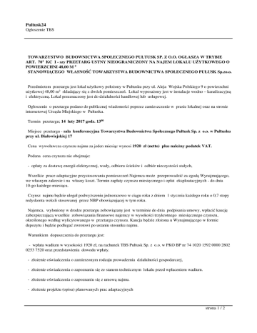 Pultusk24 Ogłoszenie TBS TOWARZYSTWO BUDOWNICTWA SPOŁECZNEGO PUŁTUSK SP. Z O.O. OGŁASZA W TRYBIE ART. 701 KC I - szy PRZETARG USTNY NIEOGRANICZONY NA NAJEM LOKALU UŻYTKOWEGO O POWIERZCHNI 48,00 M 2 STANOWIĄCEGO WŁASNOŚĆ TOWARZYSTWA BUDOWNICTWA SPOŁECZNEGO PUŁUSK Sp.zo.o. Przedmiotem przetargu jest lokal użytkowy położony w Pułtusku przy ul. Aleja Wojska Polskiego 9 o powierzchni użytkowej 48,00 m2 składający się z dwóch pomieszczeń. Lokal wyposażony jest w instalacje wodno – kanalizacyjną i elektryczną. Lokal przeznaczony jest do działalności handlowej lub usługowej. Ogłoszenie o przetargu podano do publicznej wiadomości poprzez zamieszczenie w prasie lokalnej oraz na stronie internetowej Urzędu Miejskiego w Pułtusku. Termin przetargu; 14 luty 2017 godz. 1300 Miejsce przetargu - sala konferencyjna Towarzystwa Budownictwa Społecznego Pułtusk Sp. z o.o. w Pułtusku przy ul. Białowiejskiej 17 Cena wywoławcza czynszu najmu za jeden miesiąc wynosi 1920 zł (netto) plus należny podatek VAT. Podana cena czynszu nie obejmuje: - opłaty za dostawę energii elektrycznej, wody, odbioru ścieków i odbiór nieczystości stałych, Wszelkie prace adaptacyjne przystosowania pomieszczeń Najemca może przeprowadzić za zgodą Wynajmującego, we własnym zakresie i na własny koszt. Termin zapłaty czynszu miesięcznego i opłat eksploatacyjnych - do dnia 10-go każdego miesiąca. Czynsz najmu będzie ulegał podwyższeniu jednorazowo w ciągu roku z dniem 1 stycznia każdego roku o 0,7 stopy redyskonta weksli stosowanej przez NBP obowiązującej w tym roku. Najemca, wyłoniony w drodze przetargu zobowiązany jest w terminie do dnia podpisania umowy, wpłacić kaucję zabezpieczającą wszelkie zobowiązania finansowe najemcy w wysokości trzykrotnego miesięcznego czynszu, określonego według wylicytowanego w przetargu czynszu. Kaucja będzie złożona u Wynajmującego w formie depozytu i będzie podlegać zwrotowi po ustaniu stosunku najmu. Warunkiem dopuszczenia do przetargu jest: - wpłata wadium w wysokości 1920 zł, na rachunek TBS Pułtusk Sp. z o.o. w PKO BP nr 74 1020 1592 0000 2802 0253 7520 oraz przedstawienia dowodu wpłaty. - złożenie oświadczenia o zamierzonym rodzaju prowadzenia działalności gospodarczej, - złożenie oświadczenia o zapoznaniu się ze stanem technicznym lokalu przed wpłaceniem wadium. - złożenie oświadczenia o zapoznaniu się z umową najmu. - złożenie projektu (opisu) planowanych prac adaptacyjnych strona 1 / 2 Pultusk24 Ogłoszenie TBS -złożenie pisemnego oświadczenia o wykonaniu wszystkich robót remontowo – budowlanych oraz wszelkich ewentualnych napraw w lokalu we własnym zakresie, na własny koszt i ryzyko, bez prawa zwrotu poniesionych na ten cel nakładów, zarówno w trakcie jak i po ustaniu stosunku najmu i zrzeczenie się wszelkich roszczeń z tego tytułu. Ww. dokumenty należy przedłożyć najpóźniej do dnia 13 luty 2017 w sekretariacie Towarzystwa Budownictwa Społecznego Pułtusk przy ul Białowiejskiej 17 Ze wzorem umowy najmu lokalu użytkowego położonego w Pułtusku przy ul. Aleja Wojska Polskiego 9 można zapoznać się w siedzibie TBS Pułtusk Sp. z o.o. w dni robocze w godzinach 900 - 1400 . Lokal można oglądać do dnia 10 luty 2017 r. w dni robocze w godzinach 900 - 1400 po wcześniejszym telefonicznym umówieniu się. O wysokości postąpienia decydują uczestnicy przetargu – minimalnie co 50 zł powyżej ceny wywoławczej. Przetarg uważa się za ważny jeżeli nastąpiło choć jedno postąpienie. Najemca wyłoniony w drodze przetargu zobowiązany jest do zawarcia umowy najmu w terminie 30 dni od dnia zamknięcia przetargu. Wpłacone wadium nie podlega oprocentowaniu. Wadium wpłacone przez osobę, która wygra przetarg zostaje zaliczone na poczet czynszu z tytułu najmu. Wadium wpłacone przez oferentów, którzy nie wygrali przetargu zostanie zwrócone po rozstrzygnięciu przetargu na wskazane przez oferenta konto. Wadium przepada na rzecz Towarzystwa Budownictwa Społecznego Pułtusk Sp. z o.o. w przypadku, gdy osoba, która wygra przetarg uchyli się od zawarcia umowy najmu. Organizator przetargu zastrzega sobie prawo odstąpienia od przetargu bez podania przyczyn. Dodatkowe informacje można uzyskać w Towarzystwie Budownictwa Społecznego Pułtusk Sp. z o.o. tel. 23 692 33 93 Niniejsze ogłoszenie stanowi zaproszenie osób zainteresowanych przetargiem. strona 2 / 2