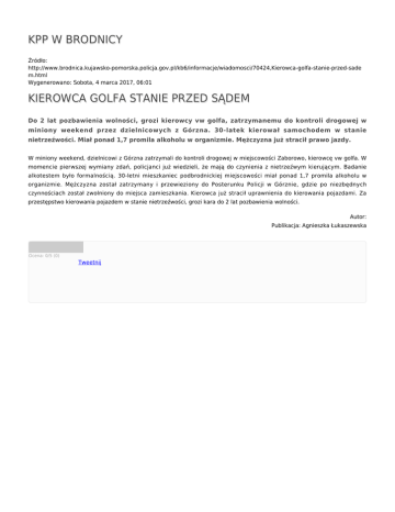 KPP W BRODNICY Źródło: http://www.brodnica.kujawsko-pomorska.policja.gov.pl/kb6/informacje/wiadomosci/70424,Kierowca-golfa-stanie-przed-sade m.html Wygenerowano: Sobota, 4 marca 2017, 06:01 KIEROWCA GOLFA STANIE PRZED SĄDEM Do 2 lat pozbawienia wolności, grozi kierowcy vw golfa, zatrzymanemu do kontroli drogowej w miniony weekend przez dzielnicowych z Górzna. 30-latek kierował samochodem w stanie nietrzeźwości. Miał ponad 1,7 promila alkoholu w organizmie. Mężczyzna już stracił prawo jazdy. W miniony weekend, dzielnicowi z Górzna zatrzymali do kontroli drogowej w miejscowości Zaborowo, kierowcę vw golfa. W momencie pierwszej wymiany zdań, policjanci już wiedzieli, że mają do czynienia z nietrzeźwym kierującym. Badanie alkotestem było formalnością. 30-letni mieszkaniec podbrodnickiej miejscowości miał ponad 1,7 promila alkoholu w organizmie. Mężczyzna został zatrzymany i przewieziony do Posterunku Policji w Górznie, gdzie po niezbędnych czynnościach został zwolniony do miejsca zamieszkania. Kierowca już stracił uprawnienia do kierowania pojazdami. Za przestępstwo kierowania pojazdem w stanie nietrzeźwości, grozi kara do 2 lat pozbawienia wolności. Autor: Publikacja: Agnieszka Łukaszewska Ocena: 0/5 (0) Tweetnij
