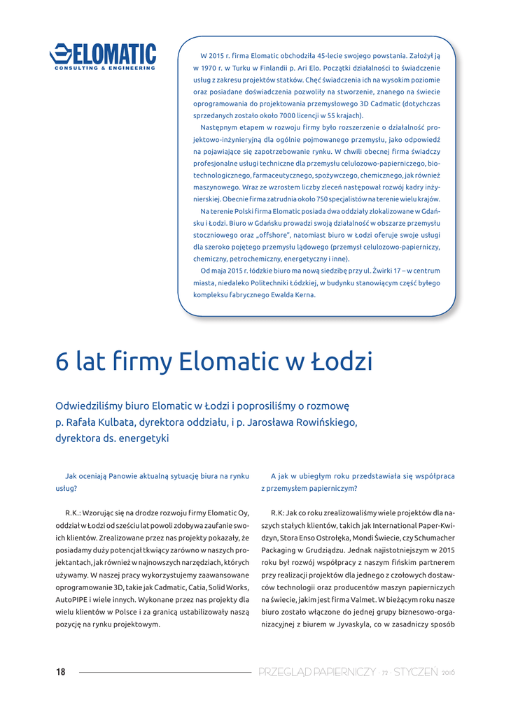 W ZAKŁADACH W 2015 r. firma Elomatic obchodziła 45-lecie swojego powstania. Założył ją w 1970 r. w Turku w Finlandii p. Ari Elo. Początki działalności to świadczenie usług z zakresu projektów statków. Chęć świadczenia ich na wysokim poziomie oraz posiadane doświadczenia pozwoliły na stworzenie, znanego na świecie oprogramowania do projektowania przemysłowego 3D Cadmatic (dotychczas sprzedanych zostało około 7000 licencji w 55 krajach). Następnym etapem w rozwoju firmy było rozszerzenie o działalność projektowo-inżynieryjną dla ogólnie pojmowanego przemysłu, jako odpowiedź na pojawiające się zapotrzebowanie rynku. W chwili obecnej firma świadczy profesjonalne usługi techniczne dla przemysłu celulozowo-papierniczego, biotechnologicznego, farmaceutycznego, spożywczego, chemicznego, jak również maszynowego. Wraz ze wzrostem liczby zleceń następował rozwój kadry inżynierskiej. Obecnie firma zatrudnia około 750 specjalistów na terenie wielu krajów. Na terenie Polski firma Elomatic posiada dwa oddziały zlokalizowane w Gdańsku i Łodzi. Biuro w Gdańsku prowadzi swoją działalność w obszarze przemysłu stoczniowego oraz „offshore”, natomiast biuro w Łodzi oferuje swoje usługi dla szeroko pojętego przemysłu lądowego (przemysł celulozowo-papierniczy, chemiczny, petrochemiczny, energetyczny i inne). Od maja 2015 r. łódzkie biuro ma nową siedzibę przy ul. Żwirki 17 – w centrum miasta, niedaleko Politechniki Łódzkiej, w budynku stanowiącym część byłego kompleksu fabrycznego Ewalda Kerna. 6 lat firmy Elomatic w Łodzi Odwiedziliśmy biuro Elomatic w Łodzi i poprosiliśmy o rozmowę p. Rafała Kulbata, dyrektora oddziału, i p. Jarosława Rowińskiego, dyrektora ds. energetyki Jak oceniają Panowie aktualną sytuację biura na rynku usług? A jak w ubiegłym roku przedstawiała się współpraca z przemysłem papierniczym? R.K.: Wzorując się na drodze rozwoju firmy Elomatic Oy, R.K: Jak co roku zrealizowaliśmy wiele projektów dla na- oddział w Łodzi od sześciu lat powoli zdobywa zaufanie swo- szych stałych klientów, takich jak International Paper-Kwi- ich klientów. Zrealizowane przez nas projekty pokazały, że dzyn, Stora Enso Ostrołęka, Mondi Świecie, czy Schumacher posiadamy duży potencjał tkwiący zarówno w naszych pro- Packaging w Grudziądzu. Jednak najistotniejszym w 2015 jektantach, jak również w najnowszych narzędziach, których roku był rozwój współpracy z naszym fińskim partnerem używamy. W naszej pracy wykorzystujemy zaawansowane przy realizacji projektów dla jednego z czołowych dostaw- oprogramowanie 3D, takie jak Cadmatic, Catia, Solid Works, ców technologii oraz producentów maszyn papierniczych AutoPIPE i wiele innych. Wykonane przez nas projekty dla na świecie, jakim jest firma Valmet. W bieżącym roku nasze wielu klientów w Polsce i za granicą ustabilizowały naszą biuro zostało włączone do jednej grupy biznesowo-orga- pozycję na rynku projektowym. nizacyjnej z biurem w Jyvaskyla, co w zasadniczy sposób 18 PRZEGLĄD PAPIERNICZY · 72 · STYCZEŃ 2016