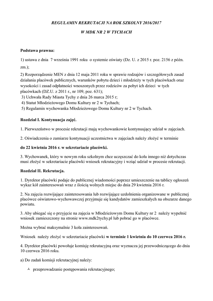 REGULAMIN REKRUTACJI NA ROK SZKOLNY 2016/2017 W MDK NR 2 W TYCHACH Podstawa prawna: 1) ustawa z dnia 7 września 1991 roku o systemie oświaty (Dz. U. z 2015 r. poz. 2156 z późn. zm.); 2) Rozporządzenie MEN z dnia 12 maja 2011 roku w sprawie rodzajów i szczegółowych zasad działania placówek publicznych, warunków pobytu dzieci i młodzieży w tych placówkach oraz wysokości i zasad odpłatności wnoszonych przez rodziców za pobyt ich dzieci w tych placówkach (DZ.U. z 2011 r., nr 109, poz. 631); 3) Uchwała Rady Miasta Tychy z dnia 26 marca 2015 r; 4) Statut Młodzieżowego Domu Kultury nr 2 w Tychach; 5) Regulamin wychowanka Młodzieżowego Domu Kultury nr 2 w Tychach. Rozdział I. Kontynuacja zajęć. 1. Pierwszeństwo w procesie rekrutacji mają wychowankowie kontynuujący udział w zajęciach. 2. Oświadczenia o zamiarze kontynuacji uczestnictwa w zajęciach należy złożyć w terminie do 22 kwietnia 2016 r. w sekretariacie placówki. 3. Wychowanek, który w nowym roku szkolnym chce uczęszczać do koła innego niż dotychczas musi złożyć w sekretariacie placówki wniosek rekrutacyjny i wziąć udział w procesie rekrutacji. Rozdział II. Rekrutacja. 1. Dyrektor placówki podaje do publicznej wiadomości poprzez umieszczenie na tablicy ogłoszeń wykaz kół zainteresowań wraz z ilością wolnych miejsc do dnia 29 kwietnia 2016 r. 2. Na zajęcia rozwijające zainteresowania lub rozwijające uzdolnienia organizowane w publicznej placówce oświatowo-wychowawczej przyjmuje się kandydatów zamieszkałych na obszarze danego powiatu. 3. Aby ubiegać się o przyjęcie na zajęcia w Młodzieżowym Domu Kultury nr 2 należy wypełnić wniosek zamieszczony na stronie www.mdk2tychy.pl lub pobrać go w placówce. Można wybrać maksymalnie 3 koła zainteresowań. Wniosek należy złożyć w sekretariacie placówki w terminie 1 kwietnia do 10 czerwca 2016 r. 4. Dyrektor placówki powołuje komisję rekrutacyjną oraz wyznacza jej przewodniczącego do dnia 10 czerwca 2016 roku. a) Do zadań komisji rekrutacyjnej należy: przeprowadzanie postępowania rekrutacyjnego; ustalenie i podanie do publicznej wiadomości listy kandydatów zakwalifikowanych i niezakwalifikowanych na zajęcia do placówki; ustalenie i podanie do publicznej wiadomości listy kandydatów przyjętych i nieprzyjętych na zajęcia do placówki; sporządzenie protokołu postępowania rekrutacyjnego. 5. Wyniki postępowania rekrutacyjnego podaje się do publicznej wiadomości w formie listy zawierającej imiona i nazwiska kandydatów zakwalifikowanych i niezakwalifikowanych na zajęcia w placówce. Listy podaje się do publicznej wiadomości poprzez umieszczenie na tablicy ogłoszeń w siedzibie placówki. 6. W przypadku większej liczby kandydatów spełniających kryteria, niż liczba wolnych miejsc na zajęcia rozwijające zainteresowania, bierze się pod uwagę kryteria określone w art. 20c ust.2 ustawy o systemie oświaty (patrz rozdział III pkt 1). 7. Po wypełnieniu wymaganych dokumentów przez zakwalifikowanego kandydata podaje się do publicznej wiadomości w formie listy zawierającej imiona i nazwiska kandydatów przyjętych i nieprzyjętych na zajęcia w placówce. 8. Kryteria wiekowe do poszczególnych kół ustalane są przez nauczyciela prowadzącego zajęcia w uzgodnieniu z dyrektorem placówki. 9. Kryteria, o których mowa w pkt. 5 oraz inne informacje dotyczące zajęć prowadzonych w placówce dostępne są na stronie www.mdk2tychy.pl w zakładce Koła zainteresowań. 10. Kandydat niespełniający kryterium wiekowego nie bierze udziału w procesie rekrutacji. 11. Ilość uczestników w poszczególnych kołach ustalana jest przez nauczyciela prowadzącego zajęcia w uzgodnieniu z dyrektorem placówki. Rozdział III. Kryteria rekrutacji: 1. Kryteria na I etapie postępowania rekrutacyjnego. Kryteria ustawowe wynikające z art.20c ust 2 ustawy o systemie oświaty (Dz. U. z 2015 r. poz. 2156 z późn. zm.). Wielodzietność rodziny kandydata, Niepełnosprawność kandydata, Niepełnosprawność jednego z rodziców kandydata, Niepełnosprawność obojga rodziców kandydata, Niepełnosprawność rodzeństwa kandydata, Samotne wychowywanie kandydata w rodzinie, Objęcie kandydata pieczą zastępczą. Za spełnienie każdego z kryteriów ustawowych kandydat otrzymuje 50 punktów. 2. Kryteria na II etapie postępowania rekrutacyjnego. - Kandydat, którego oboje rodziców/opiekunów pracuje lub studiuje w systemie stacjonarnym, - Kandydat, którego jeden z rodziców/opiekunów pracuje lub studiuje w systemie stacjonarnym, - Rodzeństwo kandydata uczęszcza na zajęcia w placówce. Za spełnienie kryteriów drugiego etapu postępowania rekrutacyjnego kandydat otrzymuje kolejno 15, 10 i 5 punktów. Rozdział IV. Rekrutacja uzupełniająca. 1. Jeżeli po przeprowadzeniu postępowania rekrutacyjnego placówka będzie nadal dysponowała wolnymi miejscami, przeprowadza się rekrutację uzupełniającą. 2. Jeżeli po przeprowadzeniu postępowania uzupełniającego, placówka nadal dysponuje wolnymi miejscami, dyrektor placówki przeprowadza powtórne postępowanie uzupełniające, które powinno się zakończyć do 15 września danego roku szkolnego. 3. Jeżeli przyjęty na zajęcia w placówce, zrezygnuje z tych zajęć w czasie trwania roku szkolnego lub zostanie skreślony z powodów wymienionych w Statucie placówki oraz Regulaminie wychowanka, na jego miejsce zostaje przyjęty kandydat, którego wniosek o przyjęcie został złożony po 15 września danego roku szkolnego lub kandydat z listy rezerwowych lub nieprzyjętych na zajęcia do MDK Nr 2 w Tychach. 4. Dyrektor placówki dopuszcza możliwość zapisania się na niektóre zajęcia w trakcie roku szkolnego, w chwili zwolnienia się miejsca w kole. W takim przypadku kandydat zobowiązany jest do złożenia wniosku, o którym mowa w rozdziale II punkt 2. Rozdział V. Odwołanie od decyzji komisji rekrutacyjnej. 1. W terminie 7 dni od daty podania do pub