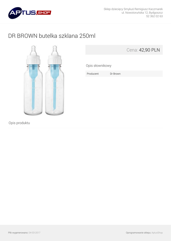 Sklep dziecięcy Smykuś Remigiusz Kaczmarek ul. Nowotoruńska 12, Bydgoszcz 52 362 02 63 DR BROWN butelka szklana 250ml Cena: 42,90 PLN Opis słownikowy Producent Dr Brown Opis produktu Plik wygenerowano: 04-03-2017 Powered by TCPDF (www.tcpdf.org) Oprogramowanie sklepu: AptusShop