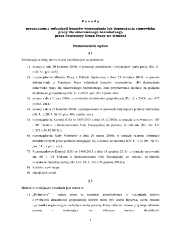 Zasady przyznawania refundacji kosztów wyposażenia lub doposażenia stanowiska pracy dla skierowanego bezrobotnego przez Powiatowy Urząd Pracy we Wrześni Postanowienia ogólne §1 Refundacja, o której mowa wyżej udzielana jest na podstawie: 1) ustawy z dnia 20 kwietnia 2004r. o promocji zatrudnienia i instytucjach rynku pracy (Dz. U. z 2016r., poz. 645); 2) rozporządzenia Ministra Pracy i Polityki Społecznej z dnia 23 kwietnia 2012r. w sprawie dokonywania z Funduszu Pracy refundacji kosztów wyposażenia lub/i doposażenia stanowiska pracy dla skierowanego bezrobotnego, oraz przyznawania środków na podjęcie działalności gospodarczej (Dz. U. z 2012r. poz. 457 z późn. zm); 3) ustawy z dnia 2 lipca 2004r. o swobodzie działalności gospodarczej (Dz. U. z 2013r. poz. 672 z późn. zm.); 4) ustawy z dnia 30 kwietnia 2004r. o postępowaniu w sprawach dotyczących pomocy publicznej (Dz. U. z 2007. Nr 59, poz. 404, z późn. zm.); 5) rozporządzenia Komisji (UE) nr 1407/2013 z dnia 18.12.2013r. w sprawie stosowania art. 107 i 108 Traktatu o funkcjonowaniu Unii Europejskiej do pomocy de minimis (Dz. Urz. UE L 352 z 24.12.2013r.); 6) rozporządzenia Rady Ministrów z dnia 29 marca 2010r. w sprawie zakresu informacji przedstawionych przez podmiot ubiegający się o pomoc de minimis (Dz. U. z 2010r., Nr 53, poz. 311, z późn. zm.); 7) Rozporządzenie Komisji (UE) nr 1408/2013 z dnia 18 grudnia 2013r. w sprawie stosowania art. 107 i 108 Traktatu o funkcjonowaniu Unii Europejskiej do pomocy de minimis w sektorze produkcji rolnej (Dz. Urz. UE L 352 z 24 grudnia 2013r.); 8) Kodeksu cywilnego; 9) niniejszych zasad. §2 Ilekroć w niniejszych zasadach jest mowa o: 1) „Podmiocie” - należy przez to rozumieć przedsiębiorcę w rozumieniu ustawy o swobodzie działalności gospodarczej którym może być osoba fizyczna, osoba prawna i jednostka organizacyjna niebędąca osobą prawną, której odrębna ustawa przyznaje zdolność prawną - wykonująca we 1 własnym imieniu działalność gospodarczą. Za przedsiębiorców uznaje się także wspólników spółki cywilnej w zakresie wykonywanej przez nich działalności gospodarczej. 2) Przedszkolu lub szkole” - należy przez to rozumieć niepubliczne przedszkole lub niepubliczną szkołę, o których mowa w ustawie z dnia 7 września 1991r. o systemie oświaty (Dz. U. z 2004r. Nr 256, poz. 2572, z późn. zm.). 3) „Producencie rolnym” – należy przez to rozumieć producenta rolnego, o którym mowa w art. 46 ust. 1 pkt. 1a ustawy z dnia 20 kwietnia 2004r. o promocji zatrudnienia i instytucjach rynku pracy. §3 1) Starosta może przyznać podmiotowi, przedszkolu, szkole lub producentowi rolnemu refundację kosztów wyposażenia lub doposażenia stanowiska pracy dla skierowanego bezrobotnego w wysokości określonej w umowie. 2) Refundacja, o której mowa wyżej przyznawana jest przez Dyrektora Powiatowego Urzędu Pracy we Wrześni (zwanego dalej Urzędem) w ramach udzielonego pełnomocnictwa Starosty Wrzesińskiego i posiadanych środków Funduszu Pracy lub środków Unii Europejskiej przeznaczonych na jej finansowanie. 3) Refundacja udzielana jest na podstawie wniosku podmiotu, przedszkola, szkoły lub producenta rolnego, którego wzór stanowi załącznik nr 1. Wniosek może być złożony do Starosty (Urzędu) właściwego ze względu na siedzibę pracodawcy lub ze względu na miejsce wykonywania pracy przez skierowanego bezrobotnego. §4 1) Wnioski opiniowane są przez Komisję powołaną do tego celu przez Dyrektora Powiatowego Urzędu Pracy we Wrześni. 2) Wysokość przyznanej „refundacji” nie może przekraczać do 6-krotnego przeciętnego wynagrodzenia. 3) Pod pojęciem „przeciętne wynagrodzenie” rozumie się przeciętne miesięczne wynagrodzenie w gospodarce narodowej w poprzednim kwartale od pierwszego dnia następnego miesiąca po ogłoszeniu przez Prezesa Głównego Urzędu Statystycznego w Dzienniku Urzędowym Rzeczypospolitej Polskiej „Monitor Polski”. Wysokość przeciętnego wynagrodzenia, o której mowa w punkcie 2, jest przyjmowana na dzień zawarcia umowy. 4) Urząd przed skierowaniem bezrobotnego i dokonaniem refundacji stwierdza utworzenie stanowiska pracy jego wyposażenie lub doposażenie, a w trakcie trwania umowy o refundację monitoruje prawidłowość jej wykonania poprzez weryfikację warunków w niej określonych. 2 Warunki przyznawania refundacji. §5 1) Refundacja, o której mowa w §1 udzielana jest na podstawie rozporządzenia Komisji (UE) nr 1407/2013 z dnia 18.12.2013r. w sprawie stosowania art. 107 i 108 Traktatu o funkcjonowaniu Unii Europejskiej do pomocy de minimis (Dz. Urz. UE L 352 z 24.12.2013r.); 2) Refundacji nie udziela się, jeżeli łącznie z inną pomocą ze środków publicznych, nie zależnie od jej formy i źródła pochodzenia, w tym środków z budżetu Unii Europejskiej, udzielono w odniesieniu do tych samych kosztów kwalifikowanych spowoduje przekroczenie dopuszczalnej intensywności pomocy określonej dla danego przeznaczenia pomocy. 3) Kwota refundacji może być przeznaczona w szczególności na zakup środków trwałych, urządzeń, maszyn, w tym środków niezbędnych do zapewnienia zgodności stanowiska pracy z przepisami bezpieczeństwa i higieny pracy oraz wymaganiami ergonomii. 4) Refundacji nie udziela się jeżeli pracodawca jest w trudnej sytuacji finansowej, upadłości lub likwidacji. 5) Refundacja nie może być przeznaczona na pokrycie następujących kosztów: a) zakupu pojazdów samochodowych, b) finansowania szkoleń, c) bieżących kosztów związanych z prowadzeniem działalności gospodarczej, d) zakupu towaru do sprzedaży i produkcji, materiałów biurowych i odzieży ochronnej, e) kosztu remontu lokalu, f) umów leasingu, kredytowych i pożyczkowych, g) zakupu sprzętu używanego, jeżeli: • w okresie ostatnich siedmiu lat został zakupiony ze środków publicznych (krajowych lub wspólnotowych), 6) Urząd dopuszcza możliwość zakupu s