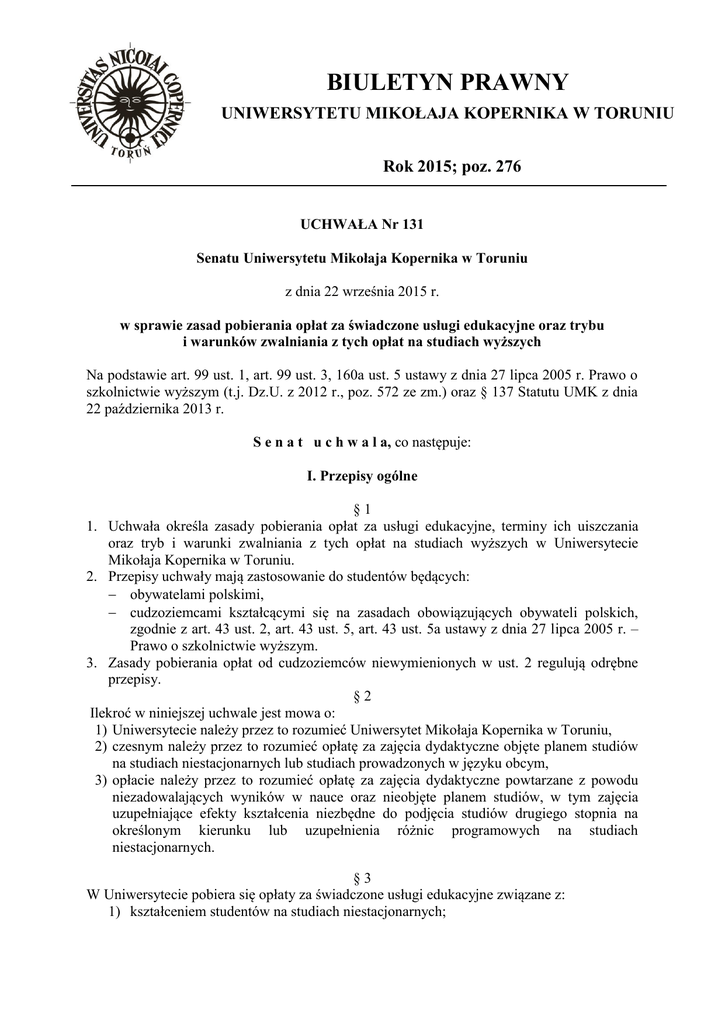 BIULETYN PRAWNY UNIWERSYTETU MIKOŁAJA KOPERNIKA W TORUNIU Rok 2015; poz. 276 UCHWAŁA Nr 131 Senatu Uniwersytetu Mikołaja Kopernika w Toruniu z dnia 22 września 2015 r. w sprawie zasad pobierania opłat za świadczone usługi edukacyjne oraz trybu i warunków zwalniania z tych opłat na studiach wyższych Na podstawie art. 99 ust. 1, art. 99 ust. 3, 160a ust. 5 ustawy z dnia 27 lipca 2005 r. Prawo o szkolnictwie wyższym (t.j. Dz.U. z 2012 r., poz. 572 ze zm.) oraz § 137 Statutu UMK z dnia 22 października 2013 r. S e n a t u c h w a l a, co następuje: I. Przepisy ogólne §1 1. Uchwała określa zasady pobierania opłat za usługi edukacyjne, terminy ich uiszczania oraz tryb i warunki zwalniania z tych opłat na studiach wyższych w Uniwersytecie Mikołaja Kopernika w Toruniu. 2. Przepisy uchwały mają zastosowanie do studentów będących: obywatelami polskimi, cudzoziemcami kształcącymi się na zasadach obowiązujących obywateli polskich, zgodnie z art. 43 ust. 2, art. 43 ust. 5, art. 43 ust. 5a ustawy z dnia 27 lipca 2005 r. – Prawo o szkolnictwie wyższym. 3. Zasady pobierania opłat od cudzoziemców niewymienionych w ust. 2 regulują odrębne przepisy. §2 Ilekroć w niniejszej uchwale jest mowa o: 1) Uniwersytecie należy przez to rozumieć Uniwersytet Mikołaja Kopernika w Toruniu, 2) czesnym należy przez to rozumieć opłatę za zajęcia dydaktyczne objęte planem studiów na studiach niestacjonarnych lub studiach prowadzonych w języku obcym, 3) opłacie należy przez to rozumieć opłatę za zajęcia dydaktyczne powtarzane z powodu niezadowalających wyników w nauce oraz nieobjęte planem studiów, w tym zajęcia uzupełniające efekty kształcenia niezbędne do podjęcia studiów drugiego stopnia na określonym kierunku lub uzupełnienia różnic programowych na studiach niestacjonarnych. §3 W Uniwersytecie pobiera się opłaty za świadczone usługi edukacyjne związane z: 1) kształceniem studentów na studiach niestacjonarnych; 2) powtarzaniem określonych zajęć dydaktycznych na studiach stacjonarnych z powodu niezadowalających wyników w nauce; 3) prowadzeniem studiów w języku obcym; 4) prowadzeniem zajęć dydaktycznych nieobjętych planem studiów, w tym zajęć uzupełniających efekty kształcenia niezbędne do podjęcia studiów drugiego stopnia na określonym kierunku. §4 1. Obowiązek ponoszenia opłat za usługi edukacyjne, o których mowa w § 3 powstaje na podstawie pisemnej umowy zawartej pomiędzy osobą przyjętą na studia a Uniwersytetem. Umowa jest zawierana nie wcześniej niż po wydaniu decyzji o przyjęciu na studia i nie później niż w terminie trzydziestu dni od rozpoczęcia zajęć. 2. Rektor może udzielić pełnomocnictwa innym osobom do zawierania umów w jego imieniu. 3. Uchwala się następujące wzory umów: - umowa na studia wyższe stacjonarne (załącznik nr 1), - umowa na studia wyższe niestacjonarne (załącznik nr 2). §5 Student zobowiązany do uiszczenia opłat za usługi edukacyjne, o których mowa w § 3, uiszcza należną opłatę niezależnie od udziału w zajęciach dydaktycznych. II. Zasady pobierania opłat za usługi edukacyjne §6 1. Za zajęcia dydaktyczne objęte planem studiów na studiach niestacjonarnych oraz studiach prowadzonych w języku obcym pobiera się czesne. 2. Nie pobiera się czesnego na stacjonarnych studiach prowadzonych w języku obcym od studentów, o których mowa w § 1 ust. 2. §7 Rektor w drodze zarządzenia ustala wysokość czesnego dla poszczególnych kierunków i poziomów studiów za cały okres studiów rozpoczynających się w danym roku akademickim. §8 1. Czesne może być uiszczane w systemie rocznym lub ratalnym (semestralnym, miesięcznym). 2. Wybór systemu płatności czesnego dokonywany jest wraz z zawarciem umowy o odpłatności za usługi edukacyjne; jeżeli wybór nie zostanie dokonany przyjmuje się, że czesne będzie uiszczane w systemie semestralnym. 3. W następnych latach akademickich, nie później niż do 14 października, student może dokonać zmiany systemu płatności czesnego. 4. Wybór i zmiana systemu płatności czesnego następuje przez złożenie oświadczenia studenta. 5. Student przyjęty na studia po 31 października uiszcza czesne w roku przyjęcia na studia wyłącznie w systemie semestralnym lub rocznym. 6. Student, o którym mowa w ust. 5 uiszcza należne czesne w terminie 14 dni od dnia podpisania umowy. 2 §9 Terminy uiszczania czesnego w zależności od sytemu płatności są określone w poniższej tabeli. Ratalny Roczny semestralny (2 raty) miesięczny (8 rat) semestr I semestr II Student I roku studiów do 31 do 31 października do 15 marca I rata do 31października, października kolejne do 7-ego każdego miesiąca (od listopada do maja) Student Collegium Medicum I roku studiów do 15 do 15 października do 15 marca I rata do 15 października, października kolejne do 7-ego każdego miesiąca (od listopada do maja) Student wyższych lat studiów do 15 do 15 października października do 15 marca I rata do 15 października, kolejne do 7-ego każdego miesiąca (od listopada do maja)” § 10 Za zajęcia dydaktyczne powtarzane z powodu niezadowalających wyników w nauce oraz nieobjęte planem studiów, w tym zajęcia uzupełniające efekty kształcenia niezbędne do podjęcia studiów drugiego stopnia na określonym kierunku lub uzupełnienia różnic programowych na studiach niestacjonarnych pobiera się opłaty. § 11 1. Opłatę stanowi iloczyn liczby godzin tych zajęć i stawki za jedną godzinę zajęć. 2. Stawki za jedną godzinę zajęć dla poszczególnych kierunków, form i poziomów studiów ustala rektor w drodze zarządzenia. 3. O obowiązku uiszczenia opłaty i jej wysokości informuje studenta dziekan w decyzji stanowiącej podstawę jej uiszczenia. § 12 Opłata jest uiszczana jednorazowo w terminie 14 dni od dnia, w którym decyzja stanowiąca podstawę do uiszczenia opłaty stała się ostateczna. 1. 2. 3. 4. § 13