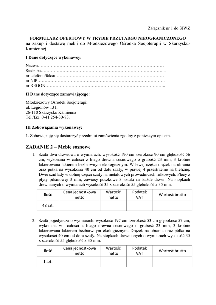 Załącznik nr 1 do SIWZ FORMULARZ OFERTOWY W TRYBIE PRZETARGU NIEOGRANICZONEGO na zakup i dostawę mebli do Młodzieżowego Ośrodka Socjoterapii w SkarżyskuKamiennej. I Dane dotyczące wykonawcy: Nazwa…………………………………………………………………………… Siedziba…………………………………………………………………………... nr telefonu/faksu………………………………………………………………… nr NIP……………………………………………………………………………. nr REGON……………………………………………………………………….. II Dane dotyczące zamawiającego: Młodzieżowy Ośrodek Socjoterapii ul. Legionów 131, 26-110 Skarżysko Kamienna Tel./fax. 0-41 254-30-83. III Zobowiązania wykonawcy: 1. Zobowiązuję się dostarczyć przedmiot zamówienia zgodny z poniższym opisem. ZADANIE 2 – Meble sosnowe 1. Szafa dwu drzwiowa o wymiarach: wysokość 190 cm szerokość 90 cm głębokość 56 cm, wykonana w całości z litego drewna sosnowego o grubość 23 mm, 3 krotnie lakierowana lakierem bezbarwnym ekologicznym. W lewej części drążek na ubrania oraz półka na wysokości 40 cm od dołu szafy, w prawej 4 przestrzenie na bieliznę. Dwie szuflady w dolnej części szafy na metalowych prowadnicach rolkowych. Plecy z płyty pilśniowej 3 mm, zawiasy puszkowe 3 sztuki na każde drzwi. Na stopkach drewnianych o wymiarach wysokość 35 x szerokość 55 głębokość x 35 mm. Ilość Cena jednostkowa netto Wartość netto Podatek VAT Wartość brutto 48 szt. 2. Szafa pojedyncza o wymiarach: wysokość 197 cm szerokość 53 cm głębokość 57 cm, wykonana w całości z litego drewna sosnowego o grubość 23 mm, 3 krotnie lakierowana lakierem bezbarwnym ekologicznym. Drążek na ubrania oraz półka na wysokości 40 cm od dołu szafy. Na stopkach drewnianych o wymiarach wysokość 35 x szerokość 55 głębokość x 35 mm. Ilość 1 szt. Cena jednostkowa netto Wartość netto Podatek VAT Wartość brutto 3. Szafa pojedyncza (bieliźniarka) o wymiarach wysokość 197 cm szerokość 53 cm głębokość 57 cm, wykonana w całości z litego drewna sosnowego o grubość 23 mm, 3 krotnie lakierowana lakierem bezbarwnym ekologicznym. Na stopkach drewnianych o wymiarach wysokość 35 x szerokość 55 głębokość x 35 mm. Ilość Cena jednostkowa netto Wartość netto Podatek VAT Wartość brutto 1 szt. 4. Szafka nocna o wymiarach wysokość 48 cm szerokość 45 cm głębokość 32 cm, wykonana w całości z litego drewna sosnowego o grubość 23 mm, 3 krotnie lakierowana lakierem bezbarwnym ekologicznym. Dolna szafka zamykana na zamek meblowy. Na stopkach drewnianych o wymiarach wysokość 35 x szerokość 35 głębokość x 35 mm Ilość Cena jednostkowa netto Wartość netto Podatek VAT Wartość brutto 96 szt. 5. Stół prostokątny o wymiarach 1800 x 800 mm wykonany w całości z litego drewna sosnowego, 3 krotnie lakierowany lakierem bezbarwnym ekologicznym. Nogi o wymiarach 80 x 80 mm przykręcone do wzmocnionej pod blatem ramy wykonanej z litego drewna sosnowego o grubości 23 mm i wysokości 10 cm. Blat o grubości 25 mm krawędzie wykonane do kantu (nie zaokrąglane). Ilość Cena jednostkowa netto Wartość netto Podatek VAT Wartość brutto 15 szt. 6. Krzesło o wymiarach wysokość 100 cm szerokość 43 cm głębokość 45 cm wykonane z litego drewna sosnowego o grubość 23 mm, 3 krotnie lakierowane lakierem bezbarwnym ekologicznym. Rysunek przykładowy: Ilość Cena jednostkowa netto Wartość netto Podatek VAT Wartość brutto 100 szt. 7. Biurko komputerowe o wymiarach wysokość 75 cm szerokość 116 cm głębokość 47 cm, wykonane w całości z litego drewna sosnowego o grubość 23 mm, 3 krotnie lakierowane lakierem bezbarwnym ekologicznym. Z prawej strony u góry szuflada, pod szufladą szafka z zamkiem meblowym. Ilość Cena jednostkowa netto Wartość netto Podatek VAT Wartość brutto 1 szt. 8. Regał biblioteczny o wymiarach wysokość 270 cm szerokość 80 cm głębokość 30 cm, wykonany w całości z litego drewna sosnowego o grubość 23 mm, 3 krotnie lakierowany lakierem bezbarwnym ekologicznym. 8 półek. Plecy z płyty pilśniowej 3 mm . Na stopkach drewnianych o wymiarach wysokość 35 x szerokość 55 głębokość x 35 mm. Ilość Cena jednostkowa netto Wartość netto Podatek VAT Wartość brutto 8 szt. 9. Regał biblioteczny o wymiarach wysokość 270 cm szerokość 80 cm głębokość 30 cm, wykonany w całości z litego drewna sosnowego o grubość 23 mm, 3 krotnie lakierowany lakierem bezbarwnym ekologicznym. 6 półek otwartych i dwie dolne z drzwiczkami zamykane na zamek meblowy. Plecy z płyty pilśniowej 3 mm. Na stopkach drewnianych o wymiarach wysokość 35 x szerokość 55 głębokość x 35 mm. Ilość Cena jednostkowa netto Wartość netto Podatek VAT Wartość brutto 2 szt. Ogółem cena ofertowa za dostawę wyżej wymienionych artykółów wynosi: 1) cena netto…………………………………………………………………..zł 2) podatek VAT……………………………………………………………….zł 3) cena brutto…………………………………………………………………...zł 4) słownie cena brutto…………………………………………………………..zł IV. Oświadczam, że akceptuję: 1) Specyfikację istotnych warunków zamówienia wraz z załącznikami; 2) Proponowany przez zamawiającego wzór umowy (proszę wpisać dane firmy do zaakceptowanego wzoru umowy). V. Oświadczam, że zgodnie z wymogami art. 22 ust. 1 ustawy Prawo zamówień publicznych: 1. Jestem uprawniony do występowania w obrocie prawnym zgodnie z wymaganiami ustawowymi; 2. Posiadam niezbędną wiedzę i doświadczenie oraz dysponuję potencjałem technicznym i osobami zdolnymi do wykonania zamówienia lub przedstawię pisemne zobowiązanie innych podmiotów do udostępnienia potenc