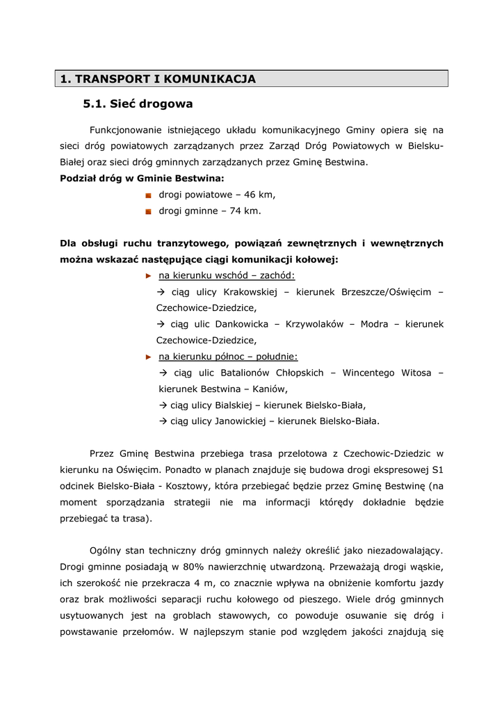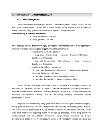 1. TRANSPORT I KOMUNIKACJA 5.1. Sieć drogowa Funkcjonowanie istniejącego układu komunikacyjnego Gminy opiera się na sieci dróg powiatowych zarządzanych przez Zarząd Dróg Powiatowych w BielskuBiałej oraz sieci dróg gminnych zarządzanych przez Gminę Bestwina. Podział dróg w Gminie Bestwina: drogi powiatowe – 46 km, drogi gminne – 74 km. Dla obsługi ruchu tranzytowego, powiązań zewnętrznych i wewnętrznych można wskazać następujące ciągi komunikacji kołowej: ► na kierunku wschód – zachód: à ciąg ulicy Krakowskiej – kierunek Brzeszcze/Oświęcim – Czechowice-Dziedzice, à ciąg ulic Dankowicka – Krzywolaków – Modra – kierunek Czechowice-Dziedzice, ► na kierunku północ – południe: à ciąg ulic Batalionów Chłopskich – Wincentego Witosa – kierunek Bestwina – Kaniów, à ciąg ulicy Bialskiej – kierunek Bielsko-Biała, à ciąg ulicy Janowickiej – kierunek Bielsko-Biała. Przez Gminę Bestwina przebiega trasa przelotowa z Czechowic-Dziedzic w kierunku na Oświęcim. Ponadto w planach znajduje się budowa drogi ekspresowej S1 odcinek Bielsko-Biała - Kosztowy, która przebiegać będzie przez Gminę Bestwinę (na moment sporządzania strategii nie ma informacji którędy dokładnie będzie przebiegać ta trasa). Ogólny stan techniczny dróg gminnych należy określić jako niezadowalający. Drogi gminne posiadają w 80% nawierzchnię utwardzoną. Przeważają drogi wąskie, ich szerokość nie przekracza 4 m, co znacznie wpływa na obniżenie komfortu jazdy oraz brak możliwości separacji ruchu kołowego od pieszego. Wiele dróg gminnych usytuowanych jest na groblach stawowych, co powoduje osuwanie się dróg i powstawanie przełomów. W najlepszym stanie pod względem jakości znajdują się drogi w Kaniowie, natomiast najgorsze parametry mają drogi w Bestwinie, w tym drogi powiatowe, które od kilkudziesięciu lat osuwają się. Największe zagęszczenie dróg ma miejsce w sołectwie Bestwina. Zarząd Dróg Powiatowych w Bielsku-Białej planuje przekazanie niektórych odcinków powiatowych od zarząd gminny. W zakresie separacji ruchu kołowego i pieszego w Gminie Bestwina występuje zbyt mała liczba chodników dla pieszych. Chodniki usytuowane są przede wszystkim wzdłuż dróg powiatowych (ul. Bialska, ul. Krakowska, ul. Witosa, ul. Janowicka, ul. Batalionów Chłopskich), jedynie w centrach poszczególnych miejscowości Gminy. Chodniki w większości są własnością Gminy i w miarę możliwości zostały przez nią wykonane Na dalszych odcinkach dróg piesi zmuszeni są poruszać się bezpośrednio drogą, co znacznie obniża poczucie bezpieczeństwa i zwiększa zagrożenie wypadku. W ostatnim czasie w Gminie Bestwina dokonano znacznej rozbudowy oświetlenia ulicznego, co wpływa na poprawę bezpieczeństwa mieszkańców oraz poprawia komfort jazdy użytkowników dróg. 5.2. Komunikacja zbiorowa Mieszkańcy Gminy mają dostęp do komunikacji zbiorowej: kolejowej, autobusowej. Przez obszar Gminy przebiega dwutorowa zelektryzowana linia kolejowa relacji Zebrzydowice – Czechowice-Dziedzice – Oświęcim – Chrzanów / Kraków. Mieszkańcy mają dostęp do linii autobusowej PKS oraz MZK. Ponadto Gminę Bestwina obsługuje przewoźnik MAR-BUS. Ze względu na korzystne położenie gminy mieszkańcy nie mają większych problemów z przemieszczaniem się do miejscowości sąsiednich oraz większych miast (Czechowice-Dziedzice, Bielsko-Biała, Oświęcim, Katowice).