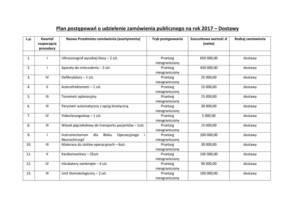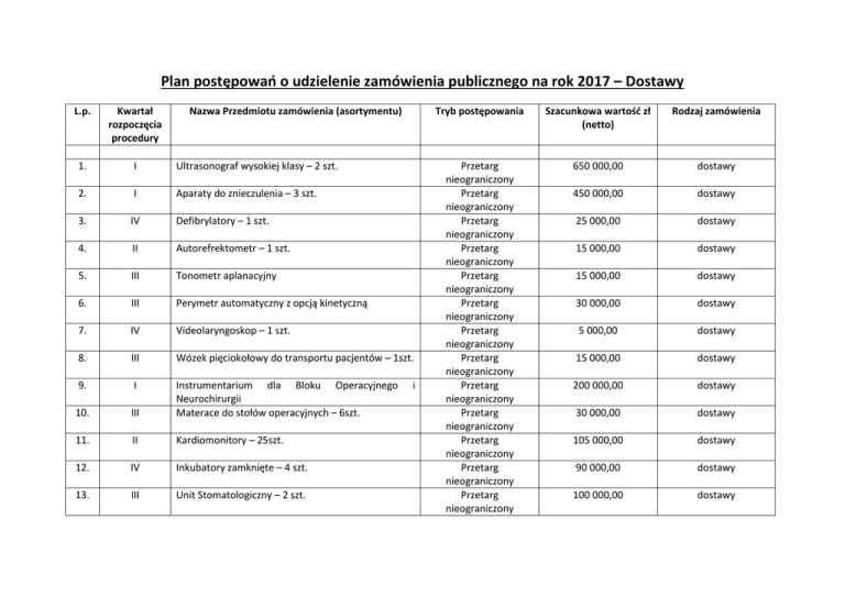 Plan postępowao o udzielenie zamówienia publicznego na rok 2017 – Dostawy L.p. Kwartał rozpoczęcia procedury Nazwa Przedmiotu zamówienia (asortymentu) 1. I Ultrasonograf wysokiej klasy – 2 szt. 2. I Aparaty do znieczulenia – 3 szt. 3. IV Defibrylatory – 1 szt. 4. II Autorefrektometr – 1 szt. 5. III Tonometr aplanacyjny 6. III Perymetr automatyczny z opcją kinetyczną 7. IV Videolaryngoskop – 1 szt. 8. III Wózek pięciokołowy do transportu pacjentów – 1szt. 9. I 10. III Instrumentarium dla Bloku Operacyjnego Neurochirurgii Materace do stołów operacyjnych – 6szt. 11. II Kardiomonitory – 25szt. 12. IV Inkubatory zamknięte – 4 szt. 13. III Unit Stomatologiczny – 2 szt. i Tryb postępowania Szacunkowa wartośd zł (netto) Rodzaj zamówienia Przetarg nieograniczony Przetarg nieograniczony Przetarg nieograniczony Przetarg nieograniczony Przetarg nieograniczony Przetarg nieograniczony Przetarg nieograniczony Przetarg nieograniczony Przetarg nieograniczony Przetarg nieograniczony Przetarg nieograniczony Przetarg nieograniczony Przetarg nieograniczony 650 000,00 dostawy 450 000,00 dostawy 25 000,00 dostawy 15 000,00 dostawy 15 000,00 dostawy 30 000,00 dostawy 5 000,00 dostawy 15 000,00 dostawy 200 000,00 dostawy 30 000,00 dostawy 105 000,00 dostawy 90 000,00 dostawy 100 000,00 dostawy 14. III Respiratory średniej klasy – 4 szt. 15. III Aparat EKG – 2 szt 16. I 17. I Sprzęt medyczny jednorazowego Kardiochirurgii Stenografy naczyniowe 18. III 19. III Akcesoria, sprzęt dla Sterylizatorni. Odczynniki do koagulacji 20. III Protezy naczyniowe 21. I Implanty Kardiochirurgiczne, zastawki tawi 22. I Implanty Neurochirurgiczne 23. IV Materiały biurowe 24. II Tusze, bębny do drukarek, tonery 25. I Środki do czystości i higieny pacjenta 26. II 27. II Sprzęt dla potrzeb pracowni hybrydy z zabiegami Neurologicznym Kaniule i zestawy do Ekmo 28. III Miał węglowy 29. I 30. I Sprzęt terapeutyczny Hemodynamicznej Materace szpitalne użytku potrzeb dla dla Centralnej pracowni Przetarg nieograniczony Przetarg nieograniczony Przetarg nieograniczony Przetarg nieograniczony Przetarg nieograniczony Przetarg nieograniczony Przetarg nieograniczony Przetarg nieograniczony Przetarg nieograniczony Przetarg nieograniczony Przetarg nieograniczony Przetarg nieograniczony Przetarg nieograniczony Przetarg nieograniczony Przetarg nieograniczony Przetarg nieograniczony Przetarg 280 000,00 dostawy 20 000,00 dostawy 1 536 084,00 dostawy 535 680,00 dostawy 166 812,00 dostawy 237 271,00 dostawy 243 271,00 dostawy 2 532 700,00 dostawy 620 139,00 dostawy 133 420,00 dostawy 176 326,00 dostawy 412 755,00 dostawy 976 686,00 dostawy 51 040,00 dostawy 790 105,00 dostawy 5 420 196,00 dostawy 31 941,00 dostawy 31. I Artykuły spożywcze 32. II Papiery EKG - AG 33. I Półmaski ochronne - AG 34. II Zestaw do termoregulacji pacjenta - AG 35. I 36. I Preparaty do konserwacji narzędzi dla potrzeb Centralnej Sterylizatorni. – AG Materiały opakowaniowe dla Apteki Szpitalnej – AG 37. II 38. I Preparaty biologiczne do rozkładu tłuszczu w instalacji kanalizacyjnej - AG Podchloryn, sól kwas solny, wodorotlenek - AG 39. II Soczewki i sprzęt do wszczepiania soczewek 40. I Bielizna operacyjna jednorazowego użytku 41. II Fotele obrotowe biurowe 42. I Odczynniki do immunologii 43. II Sprzęt do ablacji 44. II Sprzęt do elektrofizjologii 45. I 46. II Odczynniki i dializatory dla potrzeb Stacji Dializ wraz z zestawami do dializ otrzewnowych CADO/ADO Sprzęt endoskopowy nieograniczony Przetarg nieograniczony Przetarg nieograniczony Przetarg nieograniczony Przetarg nieograniczony Przetarg nieograniczony Przetarg nieograniczony Przetarg nieograniczony Przetarg nieograniczony Przetarg nieograniczony Przetarg nieograniczony Przetarg nieograniczony Przetarg nieograniczony Przetarg nieograniczony Przetarg nieograniczony Przetarg nieograniczony Przetarg nieograniczony 1 219 690,00 dostawy 21 200,00 dostawy 10 494,00 dostawy 55 522,00 dostawy 13 950,00 dostawy 4 363,00 dostawy 5 095,00 dostawy 39 175,00 dostawy 603 142,00 dostawy 435 364,00 dostawy 19 491,00 dostawy 248 172,00 dostawy 775 650,00 dostawy 681 600,00 dostawy 1 638 303,00 dostawy 921 561,00 dostawy 47. II Elektrody hakowe do zabiegów laparaskopowych 48. II Zestawy do zamykania uszka lewego przedsionka 49. III Sprzęt do zabiegów Neurologicznych 50. III Stymulatory wraz z osprzętem 51. III Defibrylatory wraz z osprzętem 52. IV Próbówki do pobierania krwi w układzie zamkniętym 53. II 54. IV 55. II 56. I Materiały remontowe, eksploatacyjne z branż hydraulicznej, budowlanej, elektrycznej, mechanicznej. Sprzęt diagnostyczny dla pracowni Hemodynamicznej Dostosowanie S.P. Szpitala Wojewódzkiego im. Papieża Jana Pawła II w Zamościu do wymogów zgodnie z Rozporządzeniem Ministra Zdrowia z dnia 26 czerwca 2012 r. w sprawie szczegółowych wymagao jakim powinny odpowiadad pomieszczenie i urządzenia podmiotu wykonującego działalnośd leczniczą (Dz.U. 12, poz. 739) oraz do Rozporządzenia Ministra Zdrowia z dnia 03.11.2011r. w sprawie szpitalnego oddziału ratunkowego (Dz. U. z 2011r. Nr 237 poz. 1420 ze zmianami) – Modernizacja SOR z uwzględnieniem utworzenia stanowiska do wstępnej intensywnej terapii, doposażenie w sprzęt medyczny oraz remont estakady i wykonanie windy dla osób niepełnosprawnych. Sprzęt jednorazowego użytku Przetarg nieograniczony Przetarg nieograniczony Przetarg nieograniczony Przetarg nieograniczony Przetarg nieograniczony Przetarg nieograniczony Przetarg nieograniczony Przetarg nieograniczony Przetarg nieograniczony Przetarg nieograniczony 24 960,00 dostawy 781 142,00 dostawy 236 304,00 dostawy 1 758 354,00 dostawy 3 090 780,00 dostawy 197 375,00 dostawy 183 998,00 dostawy 2 092 298,00 dostawy 1 489 006,40 dostawy dostawy 57. I Dostawa materiału szewnego 58. I Dostawa erytropoetyny 59. I Dostawa środków kontrastujących 60. I 61. I Dostawa sprzętu do zabiegów endowaskularnych, zestaw promieniowy i cewniki 
