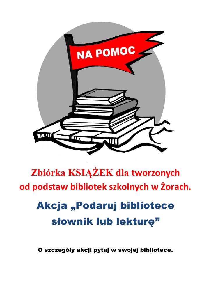 Zbiórka KSIĄŻEK dla tworzonych od podstaw bibliotek szkolnych w Żorach. Akcja „Podaruj bibliotece słownik lub lekturę” O szczegóły akcji pytaj w swojej bibliotece. Drodzy Koleżanki i Koledzy Bibliotekarze! Zwracam się z gorącym apelem o pomoc w odbudowie księgozbiorów bibliotek szkolnych w Gimnazjum nr 2 im. Wojciecha Korfantego w Żorach i Zespole Szkolno- Przedszkolnym nr 9 w Żorach- Rowniu. Każda lektura, słownik czy encyklopedia są na wagę złota! Pomimo wielkiej życzliwości Dyrekcji obu placówek brak w tegorocznym budżecie środków na stworzenie księgozbioru. Znając Wasze zaangażowanie w różnorodne akcje pomocy dla bibliotek i bibliotekarzy w tarapatach, mam nadzieję, że mogę liczyć na wsparcie. Proszę, rozpropagujcie akcję „Podaruj bibliotece szkolnej słownik lub lekturę” w swoich placówkach. Zależałoby mi na jak najszybszym jej rozpoczęciu i sfinalizowaniu do listopada tego roku. Gorąco proszę (jeśli to możliwe) o książki nowe lub w dobrej kondycji fizycznej przede wszystkim dla stworzenia księgozbioru podręcznego oraz biblioteczki lektur szkolnych. Mile widziane: -słowniki -aktualne encyklopedie -lektury dla gimnazjum i szkoły podstawowej (wykaz załączam) -albumy. Mam świadomość, że są często najcenniejsze pozycje w księgozbiorach, ale mam nadzieję, że uda się wspólnym wysiłkiem stworzyć podwaliny dobrych księgozbiorów dla pustych obecnie bibliotek szkolnych. Z góry dziękuję za okazaną pomoc i życzliwe ustosunkowanie się do mojej prośby. Bibliotekarz G2 i ZSP nr9 Mirosława Hamerska-Łagodzińska Kontakt:[email protected] Wykaz poszukiwanych lektur- gimnazjum Jan Kochanowski – wybrane fraszki, Treny (V, VII, VIII); William Szekspir- Romeo i Julia; Molier- Świętoszek lub Skąpiec; Ignacy Krasicki – wybrane bajki; Aleksander Fredro -Zemsta; Adam Mickiewicz – Dziady cz. II, Bolesław Prus lub Eliza Orzeszkowa – wybrana nowela; Henryk Sienkiewicz – wybrana powieść historyczna (Quo vadis, Krzyżacy ); Aleksander Kamiński- Kamienie na szaniec Sławomir Mrożek – wybrane opowiadanie; Antoine de Saint Exupéry- Mały Książę; Małgorzata Musierowicz- Opium w rosole John Ronald Reuel Tolkien-Hobbit wybrany utwór detektywistyczny Agaty Christie Juliusz Słowacki Balladyna; mity greckie. Wykaz poszukiwanych lektur -szkoła podstawowa Frances Hodgson Burnett- Tajemniczy ogród; Jan Brzechwa Akademia- Pana Kleksa; Carlo Collodi- Pinokio; Irena Jurgielewiczowa- Ten obcy Stanisław Lem Bajki robotów; Ferenc Molnár- Chłopcy z Placu Broni; Lucy Maud Montgomery- Ania z Zielonego Wzgórza Joanna Olech- Dynastia Miziołków; Henryk Sienkiewicz W pustyni i w puszczy; Juliusz Verne W 80 dni dookoła świata;