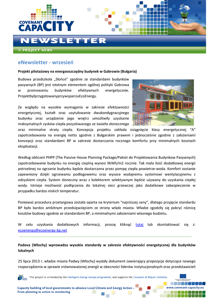 eNewsletter - wrzesień Projekt pilotażowy na energooszczędny budynek w Gabrowie (Bułgaria) Budowa przedszkola „Słońce” zgodnie ze standardami budynków pasywnych (BP) jest istotnym elementem ogólnej polityki Gabrowa w promowaniu budynków efektywnych energetycznie. ProjektbyłprzygotowanyprzywsparciuEcoEnergy. Ze względu na wysokie wymagania w zakresie efektywności energetycznej, kształt oraz usytułowanie dwukondygnacyjnego budynku oraz urządzenie jego wnętrz umożliwiły uzyskanie maksymalnych zysków ciepła pozyskiwanego ze światła słonecznego oraz minimalne straty ciepła. Koncepcja projektu zakłada osiągnięcie klasy energetycznej “A” zapotrzebowania na energię netto zgodnie z Bułgarskim prawem i jednocześnie zgodnie z założeniami koncepcji oraz standardami BP w zakresie dostarczania rocznego komfortu przy minimalnych kosztach eksploatacji. Według obliczeń PHPP (The Passive House Planning Package/Pakiet do Projektowania Budynkow Pasywnych) zapotrzebowanie budynku na energię cieplną wynosi 9kWh/m2 rocznie. Tak mała ilość dodatkowej energii potrzebnej na ogrzanie budynku będzie dostarczona przez pompę ciepła powietrze-woda. Komfort zostanie zapewniony dzięki ogrzewaniu podłogowemu oraz wysoce wydajnemu systemowi wentylacyjnemu z odzyskiem ciepła. System słoneczny wraz z kolektorem selektywnym będzie używany do uzyskania ciepłej wody. Istnieje możliwość podłączenia do lokalnej sieci grzewczej jako dodatkowe zabezpieczenie w przypadku bardzo niskich temperatur. Ponieważ procedura przetargowa została oparta na kryterium “najniższej ceny”, dlatego przyjęcie standardu BP było bardzo ambitnym przedsięwzięciem ze strony władz miasta. Władze zgodziły się pokryć różnicę kosztów budowy zgodnie ze standardami BP, a minimalnymi założeniami własnego budżetu. W celu uzyskania dodatkowych [email protected] informacji, proszę kliknąć tutaj lub skontaktować się z: Padova (Włochy) wprowadza wysokie standardy w zakresie efektywności energetycznej dla budynków lokalnych 25 lipca 2013 r. władze miasta Padwy (Włochy) wydały dokument zawierający propozycje dotyczące nowego rozporządzenia w sprawie zrównoważonej energii w obecności liderów instytucjonalnych oraz przedstawicieli lokalnych interesariuszy. Dokument ten wprowadza nowe kryteria i cele w zakresie energii i ochrony środowiska poprzez poprawę standardów budowlanych oraz odnawialnych źródeł energii, ze szczególnym uwzględnieniem działań na rzecz adaptacji i walki ze zmianami klimatu. Projekt dokumentu został przygotowany przez Urząd Planowania Urbanistycznego, Środowiska i Budownictwa Prywatnego w drodze partycypacji społecznej, która rozpoczęła się w listopadzie 2012 roku. Miało to miejsce w ramach Forum Agenda21, które angażuje kluczowych interesariuszy we władzach lokalnych. Dokument jest dostosowany do dyrektywy UE 31/2010, i zakłada, że od 31 grudnia 2018 wszystkie nowe budynki prywatne będą musiały mieć zużycie energii "bliskie zeru”, tzn. mają one posiadać wysoką charakterystykę energetyczną. W swoim planie działania dotyczącym zrównoważonego gospodarowanie energią (SEAP) miasto Padova nadzorowało przyjęcie uchwały o zrównoważonym rozwoju w celu wprowadzenia zasad eko-kompatybilności, które mają za zadanie zmniejszenie emisji CO2, poprawę dziedzictwa architektonicznego, wspieranie interwencji budowlanych, których celem jest poprawa ogólnej wydajności energetycznej oraz wsparcie sektora budowlanego w mieście. Tydzień Zielonej Energii (Green EnergyWeek) podnosi świadomość na Krecie (Grecja ) Na początku kwietnia 2013 r. Regionalna Agencja Energii na Krecie (REAC) zaprosiła sześć kreteńskich miast: Hersonissos, Heraklion, MinoaPediadas, Malevizi, Festos i Rethymnon – będących sygnatariuszami Porozumienia Burmistrzów i Prezydentów Miast (CoM) - do współorganizacji Tygodnia Zielonej Energii. Tydzień Zielonej Energii składał się z pięciu „Dni Energii” odbywających się w dniach od 3 do 7 czerwca 2013 r. Wszystkie sześć miast przygotowuje obecnie lub udoskonala swoje plany zrównoważonego gospodarowania energią komunalną (SEAP) w ramach projektu CovenantCapacity i w tym celu ściśle współpracuje z REAC. W celu zapewnienia maksymalnego oddziaływania planów i uczestnictwa Region Krety udzielił nie tylko technicznego, ale również finansowego wsparcia uczestniczącym miastom poprzez częściowe pokrycie kosztów logistycznych. Wsparcie techniczne zostało zapewnione poprzez pisemne wskazówki oraz spotkania, natomiast wsparcie finansowe było formą nagrody dla sygnatariuszy, a także zachętą dla wszystkich zainteresowanych podpisaniem w przyszłości Porozumienia Burmistrzów i Prezydentów. Władze odpowiedziały na zaproszenie Agencji Energetycznej Regionu Krety dzięki wsparciu bardzo wielu lokalnych podmiotów, w tym stowarzyszeń kulturalnych i zawodowych, oraz lokalnych grup wolontariuszy i rowerzystów. W ciągu kilku miesięcy udało im się przygotować cały program działań podnoszących świadomość w zakresie zrównoważonego zużycia energii na wyspie. W programie znalazły się uroczyste wydarzenia, działania edukacyjne skierowane do dzieci oraz wykłady adresowane do dorosłych. Program został opublikowany na stronach internetowych wszystkich miast, na stronie Regionu Krety oraz w mediach społecznościowych REAC. Odbyła się również konferencja prasowa z udziałem sześciu burmistrzów oraz Prezydenta Regionu. Mamy nadzieję, że Tydzień Zielonej Energii stanie się stałym wydarzeniem w kalendarzu kreteńskim aktywnie włączając wszystkie 24 miasta wyspy. W celu uzyskania dodatkowych informacji, prosimy o kontakt z: [email protected] Szkolenie z Systemów Energii Odnawialnej przynosi imponujące wyniki Szkolenie i Zajęcia Administracji Publicznej z zakresu Systemów Energii Odnawialnej (PATRES), to projekt finansowany z Programu Intelige