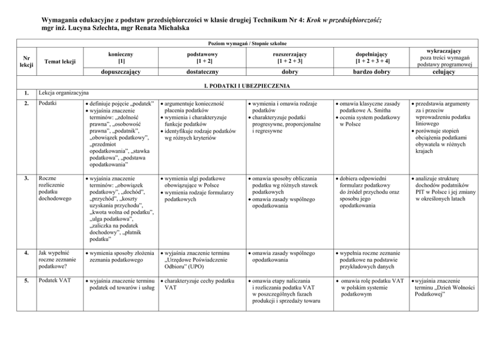 Wymagania edukacyjne z podstaw przedsiębiorczości w klasie drugiej Technikum Nr 4: Krok w przedsiębiorczość; mgr inż. Lucyna Szlechta, mgr Renata Michalska Poziom wymagań / Stopnie szkolne Nr lekcji Temat lekcji konieczny [1] podstawowy [1 + 2] rozszerzający [1 + 2 + 3] dopełniający [1 + 2 + 3 + 4] wykraczający poza treści wymagań podstawy programowej dopuszczający dostateczny dobry bardzo dobry celujący I. PODATKI I UBEZPIECZENIA 1. Lekcja organizacyjna 2. Podatki definiuje pojęcie „podatek” wyjaśnia znaczenie terminów: „zdolność prawna”, „osobowość prawna”, „podatnik”, „obowiązek podatkowy”, „przedmiot opodatkowania”, „stawka podatkowa”, „podstawa opodatkowania” argumentuje konieczność płacenia podatków wymienia i charakteryzuje funkcje podatków identyfikuje rodzaje podatków wg różnych kryteriów wymienia i omawia rodzaje podatków charakteryzuje podatki progresywne, proporcjonalne i regresywne omawia klasyczne zasady podatkowe A. Smitha ocenia system podatkowy w Polsce przedstawia argumenty za i przeciw wprowadzeniu podatku liniowego porównuje stopień obciążenia podatkami obywatela w różnych krajach 3. Roczne rozliczenie podatku dochodowego wyjaśnia znaczenie terminów: „obowiązek podatkowy”, „dochód”, „przychód”, „koszty uzyskania przychodu”, „kwota wolna od podatku”, „ulga podatkowa”, „zaliczka na podatek dochodowy”, „płatnik podatku” wymienia ulgi podatkowe obowiązujące w Polsce wymienia rodzaje formularzy podatkowych omawia sposoby obliczania podatku wg różnych stawek podatkowych omawia zasady wspólnego opodatkowania dobiera odpowiedni formularz podatkowy do źródeł przychodu oraz sposobu jego opodatkowania analizuje strukturę dochodów podatników PIT w Polsce i jej zmiany w określonych latach 4. Jak wypełnić roczne zeznanie podatkowe? wymienia sposoby złożenia zeznania podatkowego wyjaśnia znaczenie terminu „Urzędowe Poświadczenie Odbioru” (UPO) omawia zasady wspólnego opodatkowania wypełnia roczne zeznanie podatkowe na podstawie przykładowych danych 5. Podatek VAT wyjaśnia znaczenie terminu podatek od towarów i usług charakteryzuje cechy podatku VAT omawia etapy naliczania i rozliczania podatku VAT w poszczególnych fazach produkcji i sprzedaży towaru omawia rolę podatku VAT w polskim systemie podatkowym wyjaśnia znaczenie terminu „Dzień Wolności Podatkowej” wyjaśnia, czym jest ubezpieczenie wyjaśnia znaczenie terminów: „ubezpieczyciel”, „ubezpieczający”, „ubezpieczony”, „system zabezpieczenia społecznego”, „ubezpieczenia publiczne”, „ubezpieczenia prywatne”, „polisa ubezpieczeniowa”, „karencja” wymienia podstawowe obowiązki ubezpieczonego i ubezpieczyciela wymienia filary systemu emerytalnego w Polsce wymienia i charakteryzuje rodzaje ubezpieczeń wg różnych kryteriów (przedmiotu ubezpieczenia, stopnia swobody w zakresie nawiązania stosunku ubezpieczenia) charakteryzuje poszczególne filary systemu emerytalnego w Polsce wskazuje związek pomiędzy podaje różnice między swoją przyszłą aktywnością redystrybutywnym zawodową a wysokością a kapitałowym modelem emerytury ubezpieczeń społecznych wyjaśnia, jaką rolę w gospodarce odgrywają fundusze emerytalne omawia rolę Ubezpieczeniowego Funduszu Gwarancyjnego w polskim systemie ubezpieczeń 6. Ubezpieczenia 7. Sprawdzian wiadomości z działu Podatki i ubezpieczenia 8. Cele i rodzaje działalności gospodarczej wymienia i charakteryzuje ekonomiczne cele gospodarowania wymienia i charakteryzuje społeczne cele gospodarowania 9. Klasyfikacja przedsiębiorstw omawia klasyfikację wielkościową przedsiębiorstw wymienia formy organizacyjnoprawne przedsiębiorstw omawia znaczenie mikroprzedsiębiorstw w polskim systemie gospodarki określa rolę przedsiębiorstw z sektora MŚP w funkcjonowaniu polskiej gospodarki 10. Rodzaje spółek w Polsce wyjaśnia, kim jest przedsiębiorca wyjaśnia znaczenie terminów: „zdolność prawna”, „osobowość prawna” wymienia formy własności przedsiębiorstw charakteryzuje formy własności przedsiębiorstw charakteryzuje formy organizacyjno-prawne przedsiębiorstw klasyfikuje rodzaje spółek wymienia i charakteryzuje formy związków spółek (korporacje, monopole, holdingi, koncerny 11. Zakładanie firmy definiuje pojęcia „makrootoczenie przedsiębiorstwa”, „mikrootoczenie przedsiębiorstwa” wymienia i charakteryzuje etapy zakładania własnej działalności gospodarczej wskazuje najczęstsze przyczyny niepowodzeń przedsiębiorstwa wymienia i omawia czynniki dostosowuje formę warunkujące sprawne organizacyjno-prawną funkcjonowanie przedsiębiorstwa do profilu działalności przedsiębiorstwa II. PRZEDSIĘBIORSTWO wymienia i omawia czynniki podaje przykłady działań określa rodzaj działalności produkcji zgodnych z koncepcją społecznej gospodarczej wg PKD 2007 odpowiedzialności biznesu wymienia i charakteryzuje rodzaje działalności gospodarczej wypełnia zintegrowany wniosek CEIDG-1 12. Biznesplan wyjaśnia, czym jest biznesplan wymienia i omawia zasady sporządzania biznesplanu wyjaśnia pojęcia: „analiza rynku”, „rynek potencjalny” wymienia i charakteryzuje elementy biznesplanu uzasadnia przydatność sporządza projekt własnego sporządzania biznesplanu przedsiębiorstwa oparty na niezależnie od etapów rozwoju biznesplanie przedsiębiorstwa wyjaśnia, na czym polega analiza strategiczna SWOT 13. Zarządzanie definiuje terminy: „styl kierowania”, „motywowanie”, „efekt synergii” wymienia i omawia zasady pracy zespołowej wymienia i omawia zasady organizacji pracy w firmie wymienia cechy dobrego kierownika (lidera zespołu) wymienia i charakteryzuje dowodzi skuteczności ocenia zastosowanie elementy procesu zarządzania łączenia różnych sposobów różnych stylów oraz jego przebieg motywowania podwładnych kierowania w zależności od rodzaju wy