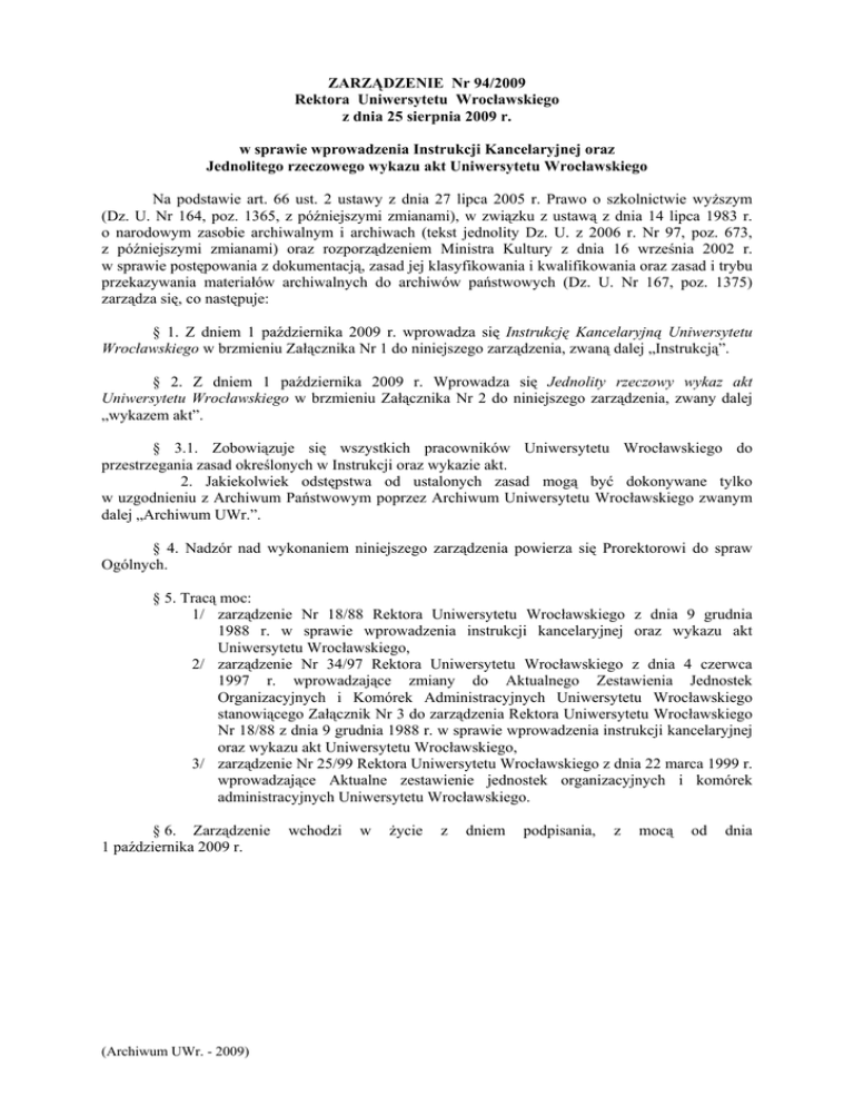 ZARZĄDZENIE Nr 94/2009 Rektora Uniwersytetu Wrocławskiego z dnia 25 sierpnia 2009 r. w sprawie wprowadzenia Instrukcji Kancelaryjnej oraz Jednolitego rzeczowego wykazu akt Uniwersytetu Wrocławskiego Na podstawie art. 66 ust. 2 ustawy z dnia 27 lipca 2005 r. Prawo o szkolnictwie wyższym (Dz. U. Nr 164, poz. 1365, z późniejszymi zmianami), w związku z ustawą z dnia 14 lipca 1983 r. o narodowym zasobie archiwalnym i archiwach (tekst jednolity Dz. U. z 2006 r. Nr 97, poz. 673, z późniejszymi zmianami) oraz rozporządzeniem Ministra Kultury z dnia 16 września 2002 r. w sprawie postępowania z dokumentacją, zasad jej klasyfikowania i kwalifikowania oraz zasad i trybu przekazywania materiałów archiwalnych do archiwów państwowych (Dz. U. Nr 167, poz. 1375) zarządza się, co następuje: § 1. Z dniem 1 października 2009 r. wprowadza się Instrukcję Kancelaryjną Uniwersytetu Wrocławskiego w brzmieniu Załącznika Nr 1 do niniejszego zarządzenia, zwaną dalej „Instrukcją”. § 2. Z dniem 1 października 2009 r. Wprowadza się Jednolity rzeczowy wykaz akt Uniwersytetu Wrocławskiego w brzmieniu Załącznika Nr 2 do niniejszego zarządzenia, zwany dalej „wykazem akt”. § 3.1. Zobowiązuje się wszystkich pracowników Uniwersytetu Wrocławskiego do przestrzegania zasad określonych w Instrukcji oraz wykazie akt. 2. Jakiekolwiek odstępstwa od ustalonych zasad mogą być dokonywane tylko w uzgodnieniu z Archiwum Państwowym poprzez Archiwum Uniwersytetu Wrocławskiego zwanym dalej „Archiwum UWr.”. § 4. Nadzór nad wykonaniem niniejszego zarządzenia powierza się Prorektorowi do spraw Ogólnych. § 5. Tracą moc: 1/ zarządzenie Nr 18/88 Rektora Uniwersytetu Wrocławskiego z dnia 9 grudnia 1988 r. w sprawie wprowadzenia instrukcji kancelaryjnej oraz wykazu akt Uniwersytetu Wrocławskiego, 2/ zarządzenie Nr 34/97 Rektora Uniwersytetu Wrocławskiego z dnia 4 czerwca 1997 r. wprowadzające zmiany do Aktualnego Zestawienia Jednostek Organizacyjnych i Komórek Administracyjnych Uniwersytetu Wrocławskiego stanowiącego Załącznik Nr 3 do zarządzenia Rektora Uniwersytetu Wrocławskiego Nr 18/88 z dnia 9 grudnia 1988 r. w sprawie wprowadzenia instrukcji kancelaryjnej oraz wykazu akt Uniwersytetu Wrocławskiego, 3/ zarządzenie Nr 25/99 Rektora Uniwersytetu Wrocławskiego z dnia 22 marca 1999 r. wprowadzające Aktualne zestawienie jednostek organizacyjnych i komórek administracyjnych Uniwersytetu Wrocławskiego. § 6. Zarządzenie 1 października 2009 r. (Archiwum UWr. - 2009) wchodzi w życie z dniem podpisania, z mocą od dnia Załącznik Nr 1 do zarządzenia Nr 94/2009 z dnia 25 sierpnia 2009 r. Instrukcja Kancelaryjna Uniwersytetu Wrocławskiego Cel i zakres Instrukcji § 1.1. Instrukcja Kancelaryjna, zwana dalej Instrukcją, ma na celu unormowanie i ujednolicenie wykonywania typowych czynności kancelaryjnych oraz obiegu informacji we wszystkich komórkach administracyjnych/jednostkach organizacyjnych Uniwersytetu Wrocławskiego, zwanego dalej Uniwersytetem. 2. Instrukcja określa organizację kancelarii oraz system i metody pracy kancelaryjnej w trakcie wykonywania typowych czynności kancelaryjnych we wszystkich komórkach administracyjnych/jednostkach organizacyjnych Uniwersytetu, w odniesieniu do dokumentacji jawnej i niezależnie od stosowanej technologii. 3. Zasady i tryb wykonywania czynności kancelaryjnych w odniesieniu do dokumentacji niejawnej określają odrębne przepisy. 4. Zasady i tryb wykonywania czynności kancelaryjnych w odniesieniu do pieczęci urzędowych i pieczątek służbowych obowiązujących w Uniwersytecie Wrocławskim, określa odrębne zarządzenie. Podstawowe pojęcia § 2. Użyte w Instrukcji pojęcia oznaczają: 1) akta sprawy – komplet dokumentacji przychodzącej i wychodzącej, sporządzanej różnymi technikami i na różnych nośnikach, jak w szczególności: papier, kalka, taśma magnetofonowa, video, fotografia, CD ROM/DVD, stanowiący podstawę podjęcia czynności urzędowych w celu rozpatrzenia i załatwienia sprawy, 2) akta spraw załatwionych – są to akta spraw zakończonych (zamkniętych), pozostające przez określony czas pod opieką komórki administracyjnej/jednostki organizacyjnej lub pracownika merytorycznego, a następnie przekazywane do Archiwum UWr., 3) akta typowe – akta powstające w każdej komórce administracyjnej/jednostce organizacyjnej. W wykazie akt są klasyfikowane zawsze w klasach od 0 do 3, obejmując takie zagadnienia jak: zarządzanie, kadry, środki rzeczowe oraz ekonomikę i finanse, 4) akta specyficzne – akta stanowiące zawsze odbicie podstawowej, statutowej działalności przypisanej tylko danej komórce administracyjnej/jednostce organizacyjnej. W wykazie akt są klasyfikowane w klasach od 4 wzwyż, 5) aktotwórca – wytwórca akt, a szerzej – całej dokumentacji, 6) Archiwum UWr. – ogólnouczelniana jednostka organizacyjna mająca za zadanie gromadzenie, przechowywanie, ewidencjonowanie, zabezpieczanie i udostępnianie całości zbioru dokumentacji wytworzonej w Uniwersytecie (kat. A i BE50), a także uczestniczenie w procesie brakowania dokumentacji niearchiwalnej, 7) archiwum specjalistyczne – miejsce gromadzenia, przechowywania, ewidencjonowania i udostępniania, nieprzekazywanych do Archiwum UWr. a będących pod jego nadzorem, (Archiwum UWr. - 2009) 2 8) 9) 10) 11) 12) 13) 14) 15) 16) 17) 18) 19) 20) 21) 22) materiałów archiwalnych i dokumentacji niearchiwalnej w komórkach administracyjnych/ jednostkach organizacyjnych, baza danych – zbiór danych lub jakichkolwiek innych materiałów i elementów zgromadzonych według określonej systematyki lub metody, indywidualnie dostępnych w jakikolwiek sposób, w tym środkami elektronicznymi, wymagający istotnego co do jakości lub ilości nakładu inwestycyjnego w celu sporządzenia, weryfikacji lub prezentacji jego zawartości, brakowanie dokumentacji niearchiwalnej – polega na ocenie przydatności dokumentacji dla cel