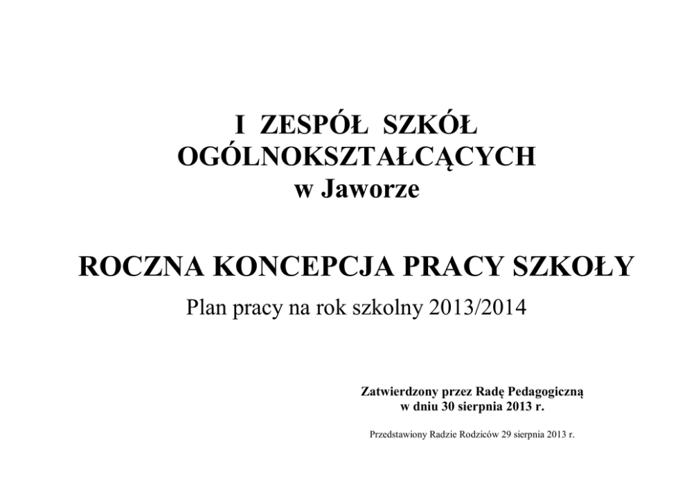 I ZESPÓŁ SZKÓŁ OGÓLNOKSZTAŁCĄCYCH w Jaworze ROCZNA KONCEPCJA PRACY SZKOŁY Plan pracy na rok szkolny 2013/2014 Zatwierdzony przez Radę Pedagogiczną w dniu 30 sierpnia 2013 r. Przedstawiony Radzie Rodziców 29 sierpnia 2013 r. SPIS TREŚCI strona Wykaz dokumentów wykorzystanych przy opracowaniu programu rozwoju 4 I. Organizacja pracy szkoły 5 Organizacja roku szkolnego 2013/2014 6 Harmonogram prac związanych z rozpoczęciem roku szkolnego 2013/2014 8 Harmonogram czynności związanych z egzaminem maturalnym 2013/2014 10 Terminy wywiadówek 12 Terminy rad pedagogicznych 12 Kadra pedagogiczna 13 Opieka nad salami i dodatkowe czynności 15 II. Warunki działalności szkoły 19 Klimat i baza szkoły 20 Planowane działania w zakresie modernizacji bazy szkoły 21 III. Zarządzanie strategiczne 22 IV. Kształcenie 23 2 V. Ewaluacja wewnętrzna 32 Struktura ewaluacji wewnętrznej, cele diagnozowania 33 Kryteria sukcesu, narzędzia i metody kontroli 34 Diagnoza wiedzy i umiejętności uczniów i słuchaczy z wybranych przedmiotów 35 Badanie stopnia spełnienia wymagania „Uczniowie są aktywni” 36 VI. Wewnątrzszkolny System Doskonalenia Nauczycieli 38 Cele WSDN, kryteria sukcesu, narzędzia i metody kontroli 39 Struktura WSDN 40 Terminarz i tematyka szkoleniowych rad pedagogicznych 40 Zespoły przedmiotowe 41 Wykaz ścieżek międzyprzedmiotowych 44 VII. Promocja szkoły 45 VIII. Wykaz załączników do planu pracy szkoły 3 49 Plan pracy szkoły na rok szkolny 2013/2014 opracowany został na podstawie: 1. Konstytucji Rzeczypospolitej Polskiej. 2. Konwencji o Prawach Dziecka z dnia 20 listopada 1989 r. 3. Powszechnej Deklaracji Praw Człowieka z 10 grudnia 1948 r. 4. Ustawy o systemie oświaty z dnia 7 września 1991 r. ze zmianami. 5. Rozporządzenia Ministra Edukacji Narodowej i Sportu z dnia 12 lutego 2002 roku w sprawie ramowych planów nauczania w szkołach publicznych (Dz. U. z 2002r. nr 15, poz. 142, ze zmianami). 6. Rozporządzenia Ministra Edukacji Narodowej i Sportu z dnia 26 lutego 2002 roku w sprawie podstawy programowej wychowania przedszkolnego oraz kształcenia ogólnego w poszczególnych typach szkół (Dz. U. z 2002r. nr 51, poz. 458, ze zmianami). 7. Rozporządzenia Ministra Edukacji Narodowej z dnia 27 sierpnia 2012 roku w sprawie podstawy programowej wychowania przedszkolnego oraz kształcenia ogólnego w poszczególnych typach szkół. 8. Rozporządzenia Ministra Edukacji Narodowej z dnia 30 kwietnia 2007 r. w sprawie warunków i sposobu oceniania, klasyfikowania i promowania uczniów i słuchaczy oraz przeprowadzania sprawdzianów i egzaminów w szkołach publicznych, z późniejszymi zmianami (Dz. U. nr 83, poz. 562, ze zmianami) . 9. Arkusza organizacji szkoły na rok szkolny 2013/2014. 10. Karty Nauczyciela. 11. Statutu Szkoły. 12. Wniosków z posiedzeń Rad Pedagogicznych odbytych w roku szkolnym 2012/2013. 4 I Organizacja pracy szkoły 5 ORGANIZACJA ROKU SZKOLNEGO 2013/2014 1. Inauguracja roku szkolnego 2 września 2013 2. I semestr od 2 września 2013 do 17 stycznia 2014 3. II semestr od 20 stycznia 2014 do 27 czerwca 2014 4. Zimowa przerwa świąteczna 23 – 31 grudnia 2013 5. Ferie zimowe od 17 lutego 2014 do 2 marca 2014 6. Wiosenna przerwa świąteczna 17 – 22 kwietnia 2014 7. Zakończenie zajęć w klasach maturalnych 25 kwietnia 2014 8. Egzamin maturalny - sesja wiosenna. 5 – 30 maja 2014 9. Pożegnanie klas maturalnych 29 kwietnia 2014 (wtorek) 10. Egzamin maturalny – termin dodatkowy 2 - 18 czerwca 2014 11. Zakończenie rocznych zajęć dydaktyczno- wychowawczych 27 czerwca 2014 12. Ferie letnie od 28 czerwca do 31 sierpnia 2014 13. Egzaminy poprawkowe 25 - 29 sierpnia 2014 6 14. Egzamin maturalny - sesja poprawkowa. ustny : 25 - 29 sierpnia 2014 pisemny : 26 sierpnia 2014 15. Posiedzenia Szkolnej Komisji Rekrutacyjno – Kwalifikacyjnej wg odrębnego harmonogramu 16. Dodatkowe dni wolne od zajęć dydaktycznych. 2, 5, 6, 7 maja 2014 20 czerwca 2014 7 HARMONOGRAM PRAC ZWIĄZANYCH Z ROZPOCZĘCIEM ROKU SZKOLNEGO 2013/2014 Lp. DATA GODZINA PRZEDSIĘWZIĘCIA ODPOWIEDZIALNY 1 30.08. 2013 9 00 Plenarne posiedzenie Rady Pedagogicznej Dyrektor 2 02.09. 2013 9 30 Uroczysta inauguracja roku szkolnego I LO Opiekunowie SU 2A 16 00 Uroczysta inauguracja roku szkolnego LU dla dorosłych Zapoznanie uczniów klas I z prawami i obowiązkami ucznia w oparciu o Statut Szkoły Wychowawcy UWAGI Wpis do dziennika 3 do 09.09. 2013 14 30 Uzupełnienie wpisów do dzienników klas I – III i arkuszy ocen klas II – III za rok szkolny 2012/2013 Wychowawcy 4 do 16.09. 2013 do 09.09. 2013 do 16.09. 2013 14 30 Wypełnienie dzienników klas I Wypełnienie dzienników klas II i III Wypełnienie dzienników zajęć pozalekcyjnych, wynikających z Karty Nauczyciela Wychowawcy Opiekun semestru Nauczyciele 5 do 12.09. 2013 14 30 Sporządzenie wykazu prac klasowych Nauczyciele Wkleić do dziennika 6 do 18.10. 2013 14 30 Wypełnienie arkuszy ocen klas I – II 7 do 12.09. 2013 14 30 Złożenie deklaracji uczniów o rezygnacji z zajęć z wychowania do życia w rodzinie (klasy I, II, III) Wychowawcy Opiekun semestru Wychowawcy Wszyscy uczniowie 8 do 12.09. 2013 14 30 Złożenie deklaracji uczniów klas I o uczęszczaniu na religię Wychowawcy 9 do 12.09. 2013 14 30 Zapoznanie uczniów i słuchaczy z wymaganiami edukacyjnymi z poszczególnych przedmiotów (podyktowanie do zeszytów i zebranie podpisów rodziców) Nauczyciele 8 10 do 27.09. 2013 14 30 Zapoznanie uczniów klas I i przypomnienie uczniom klas starszych Statutu Szkoły Wychowawcy Opiekun semestru 11 do 16.09. 2013 14 30 Złożenie rozkładów materiału z przedmiotów i godziny z wychowawcą oraz harmonogramu konsultacji Nauczyciele 14 30 Złożenie rozkładów materiału z przedmiotów dla klas 2 i 3 w cyklu rozpoczętym w klasie 1 oraz do końca października 2013 Wpis do dziennika, oświadczenia ucz Złożenie rozkładów materiału z przedmiotów dla klas 2 i 3 w cyklu rozpoczętym w klasie 2 12 do 19.09. 20