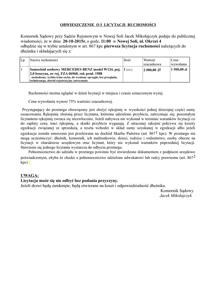 OBWIESZCZENIE O I LICYTACJI RUCHOMOŚCI Komornik Sądowy przy Sądzie Rejonowym w Nowej Soli Jacek Mikołajczyk podaje do publicznej wiadomości, że w dniu 20-10-2015r. o godz. 11:00 w Nowej Soli, ul. Okrzei 4 odbędzie się w trybie ustalonym w art. 867 kpc pierwsza licytacja ruchomości należących do dłużnika i składających się z: Lp. Nazwa ruchomości Ilość 1 Samochód osobowy MERCEDES BENZ model W124, poj. 1 [szt.] 2,0 benzyna, nr rej. FZA 06960, rok prod. 1988 Wartość szacunkowa 2 000,00 zł Cena wywołania 1 500,00 zł . uszkodzony, wybita tylna szyba, do wymiany sprzęgło, bez przeglądu, technicznego, dowód rejestracyjny zatrzymany Ruchomości można oglądać w dzień licytacji w miejscu i czasie oznaczonym wyżej. Cena wywołania wynosi 75% wartości szacunkowej. Przystępujący do przetargu obowiązany jest złożyć rękojmię w wysokości jednej dziesiątej części sumy oszacowania. Rękojmię złożoną przez licytanta, któremu udzielono przybicia, zatrzymuje się; pozostałym licytantom rękojmię zwraca się niezwłocznie. Jeżeli nabywca nie wykonał w terminie warunków licytacji co do zapłaty ceny, traci rękojmię, a skutki przybicia wygasają. Z utraconej rękojmi pokrywa się koszty egzekucji związanej ze sprzedażą, a reszta wchodzi w skład sumy uzyskanej w egzekucji albo jeżeli egzekucja została umorzona jest przelewana na dochód Skarbu Państwa (art. 867 1 kpc). W przetargu nie mogą uczestniczyć: dłużnik, komornik, ich małżonkowie, dzieci, rodzice i rodzeństwo, osoby obecne na licytacji w charakterze urzędowym oraz licytant, który nie wykonał warunków poprzedniej licytacji. Stawienie się jednego licytanta wystarcza do odbycia przetargu. Pełnomocnictwo do udziału w przetargu powinno być stwierdzone dokumentem z podpisem urzędowo poświadczonym, chyba że chodzi o pełnomocnictwo udzielone adwokatowi lub radcy prawnemu (art. 867 2 kpc) UWAGA: Licytacja może się nie odbyć bez podania przyczyny. Jeżeli drzwi będą zamknięte, będą otwierane na koszt i odpowiedzialność dłużnika. Komornik Sądowy Jacek Mikołajczyk