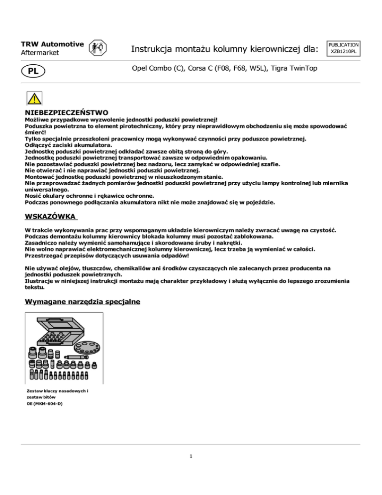 TRW Automotive Aftermarket Instrukcja montażu kolumny kierowniczej dla: PUBLICATION XZB1210PL Opel Combo (C), Corsa C (F08, F68, W5L), Tigra TwinTop NIEBEZPIECZEŃSTWO Możliwe przypadkowe wyzwolenie jednostki poduszki powietrznej! Poduszka powietrzna to element pirotechniczny, który przy nieprawidłowym obchodzeniu się może spowodować śmierć! Tylko specjalnie przeszkoleni pracownicy mogą wykonywać czynności przy poduszce powietrznej. Odłączyć zaciski akumulatora. Jednostkę poduszki powietrznej odkładać zawsze obitą stroną do góry. Jednostkę poduszki powietrznej transportować zawsze w odpowiednim opakowaniu. Nie pozostawiać poduszki powietrznej bez nadzoru, lecz zamykać w odpowiedniej szafie. Nie otwierać i nie naprawiać jednostki poduszki powietrznej. Montować jednostkę poduszki powietrznej w nieuszkodzonym stanie. Nie przeprowadzać żadnych pomiarów jednostki poduszki powietrznej przy użyciu lampy kontrolnej lub miernika uniwersalnego. Nosić okulary ochronne i rękawice ochronne. Podczas ponownego podłączania akumulatora nikt nie może znajdować się w pojeździe. WSKAZÓWKA W trakcie wykonywania prac przy wspomaganym układzie kierowniczym należy zwracać uwagę na czystość. Podczas demontażu kolumny kierownicy blokada kolumny musi pozostać zablokowana. Zasadniczo należy wymienić samohamujące i skorodowane śruby i nakrętki. Nie wolno naprawiać elektromechanicznej kolumny kierowniczej, lecz trzeba ją wymieniać w całości. Przestrzegać przepisów dotyczących usuwania odpadów! Nie używać olejów, tłuszczów, chemikaliów ani środków czyszczących nie zalecanych przez producenta na jednostki poduszek powietrznych. Ilustracje w niniejszej instrukcji montażu mają charakter przykładowy i służą wyłącznie do lepszego zrozumienia tekstu. Wymagane narzędzia specjalne Zestaw kluczy nasadowych i zestaw bitów OE (MKM-604-D) 1 Momenty obrotowe Momenty dokręcania Śruby i nakrętki samozabezpieczające należy bezwzględnie wymienić. Śruba(-y) wałka pośredniego (patrz rysunek 7) Użyć środka kolumny kierownicy (1) zabezpieczającego śruby. Kolumna sterownicza (1)(2) (patrz rysunek 8) Śruba(y), przy kolumnie kierownicy 24 Nm + 60° Nakrętka(i) 22 Nm; Śruba(y) 22 Nm Śruba(-y) poduszki powietrznej kierowcy 8 Nm Nakrętka (-i) kierownicy Użyć środka zabezpieczającego śruby. 2 30 Nm Rysunek 1 Demontaż: Ustawić kierownicę w położeniu środkowym i zatrzasnąć zamek blokady kierownicy. Odłączyć biegun ujemny akumulatora. Zachować czas oczekiwania co najmniej 1 min. Wymontować poduszkę powietrzną kierowcy. Potrzebne narzędzia specjalne: Zestaw kluczy nasadowych i zestaw bitów OE (MKM-604-D) - Końcówka bit OE (MKM-604-29) Wymontować kierownicę. Zdemontować uchwyt do przechylania kolumny kierowniczej. (jeśli istnieje) Wykręcić śruby uchwytu regulacji wysokości kolumny kierownicy. (1) Zdemontować uchwyt regulacji wysokości kolumny kierownicy. (2) Odblokować zaczepy blokujące osłony kolumny kierownicy u góry. (3) Wymontować obudowę drążka kierowniczego u góry. (4) Wykręcić śruby(-ę) osłon(-y) kolumny kierownicy. (5) Wymontować obudowę drążka kierowniczego na dole. (6) (patrz rysunek 1) Poluzować złącze elektryczne jednostki stykowej. (1) Wymontować jednostkę kontaktową. (2)(3) (patrz rysunek 2) 1 Śruba(-y) uchwytu regulacji wysokości 2 Uchwyt regulacji wysokości 3 Noski zatrzaskowe 4 Osłona kolumny kierownicy u góry 5 Śruba(-y) osłon(-y) kolumn(-y) kierowniczych(-ej) 6 Osłona kolumny kierownicy na dole Rysunek 2 1 Elektryczne złącze(a) wtykowe 3 jednostka kontaktowa 3 2 Noski zatrzaskowe Poniższe czynności należy przeprowadzić po obydwu stronach. Zaczepy przełącznika na kolumnie kierownicy odblokować odpowiednim narzędziem. (1) Wymontować przełącznik kolumny kierownicy z modułu kolumny kierownicy. (2) (patrz rysunek 3) Rysunek 3 1 Noski zatrzaskowe Rozłączyć złącze(-a) elektryczne. (1)(2) (patrz rysunek 4) 2 Zamontowany przełącznik kolumny sterowniczej Rysunek 4 Zdemontować moduł kolumny kierownicy. 1 Elektryczne złącze(a) wtykowe 4 2 Elektryczne złącze(a) wtykowe Wymontować półkę odbiorczą. (1) Wykręcić śrubę(y). (2) Wymontować osłonę(y). (3) (patrz rysunek 5) Rysunek 5 Wykręcić śrubę(-y) okładziny wnęki na nogi po stronie kierowcy. Wymontować osłonę wnęki na nogi. Wymontować kanał nawiewu na nogi kierowcy. 1 Schowek 2 Śruba(y) 3 Osłona Wymontować kanał nawiewu na nogi kierowcy. (1) Wymontować wspornik deski rozdzielczej w przestrzeni na nogi. (2) Wyciąć podporę okładziny przestrzeni na nogi. (3) (Strzałki) Odłączyć złącze elektryczne od sterownika elektryczego wspomagania układu kierowniczego. (4) (patrz rysunek 6) Rysunek 6 1 Kanał powietrzny przestrzeni na nogi po stronie kierowcy 2 Wspornik deski rozdzielczej we przestrzeni na nogi 3 Podpora okładziny przestrzeni na 4 Elektryczne złącze(a) wtykowe nogi 5 Wykręcić śrubę(-y) wału pośredniego kierownicy. (1) Odłączyć wał pośredni kierownicy od wału kierownicy. (2)(3) (patrz rysunek 7) Rysunek 7 1 Śruba(-y) wałka pośredniego kolumny kierownicy 2 Wał obrotowy kierowniczy 3 Wał pośredni kolumny kierownicy 4 znaczenie(a) Regulacja pochylenia kolumny kierownicy musi być zamknięty! Rysunek 8 Wykręcić śrubę (śruby) kolumny kierowniczej. (1) Odkręcić nakrętkę(-i) kolumny kierownicy. (2) Wymontować kolumnę kierownicy. (3) (patrz rysunek 8) W przypadku wymiany kolumny kierownicy należy przemontować następujące elementy: - Sterownik elektrycznego wspomagania układu kierowniczego - Sterownik immobilizera - Przełącznik rozrusznika zapłonu - Stacyjka 1 Śruby (śruba) – kolumna kierownicza 3 Kolumna sterownicza 6 2 Nakrętka(-i) kolumny kierownicy Rysunek 9 Montaż: Montaż w odwrotnej kolejności do demontażu. Wkręcić śrubę(-y) i nakrętkę(-i) kolumny kierownicy, lecz nie dokręcać. (1)(2) Dokręcić nakrętkę(-i) ko