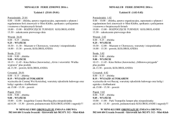MINI-KLUB FERIE ZIMOWE 2016 r. MINI-KLUB FERIE ZIMOWE 2016 r. Tydzień I (25.01-29.01) Tydzień II (1.02-5.02) Poniedziałek 25.01 8.00 – 10.00 – zbiórka, sprawy organizacyjne, zapoznanie z planem i regulaminem ferii zimowych w Mini-Klubie, spotkanie z policjantem i rozmowa o bezpiecznych feriach 10.00 – 15.00 – ROZPOCZĘCIE TURNIEJU KOLOROLANDII 15.30 – zakończenie pierwszego dnia Poniedziałek 1.02 8.00 – 10.00 – zbiórka, sprawy organizacyjne, zapoznanie z planem i regulaminem ferii zimowych w Mini-Klubie, spotkanie z policjantem i rozmowa o bezpiecznych feriach 10.00 – 15.00 – ROZPOCZĘCIE TURNIEJU KOLOROLANDII 15.30 – zakończenie pierwszego dnia Wtorek 26.01 8.00 – 9.25 – zbiórka 9.25 – WYJŚCIE 10.30 – 11.30 – Muzeum w Choroszczy, warsztaty i niespodzianka 14.00 – 15.30 – powrót, KOLOROLANDIA Wtorek 2.02 8.00 – 9.25 – zbiórka 9.25 – WYJŚCIE 10.30 – 12.00 – Muzeum w Choroszczy, warsztaty i niespodzianka 14.00 – 15.30 – powrót, KOLOROLANDIA Środa 27.01 8.00 – 9.00 – zbiórka 9.00 – WYJŚCIE 10.15 – 11.45 - Kino Helios (Jurowiecka) „Alvin i wiewiórki: Wielka wyprawa” plus posiłek ok.13.30 – powrót, KOLOROLANDIA Środa 3.02 8.00 – 9.00 – zbiórka 9.00 – WYJŚCIE 10.15 – 11.45 - Kino Helios (Jurowiecka) „Odlotowa przygoda” plus posiłek ok.13.30 – powrót, KOLOROLANDIA Czwartek 28.01 8.00 – 8.15 – zbiórka 8.15 – WYJAZD AUTOKAREM wycieczka do Czarnej Wsi Kościelnej, warsztaty rękodzieła ludowego oraz kulig i ognisko z kiełbaskami ok.15.00 - 15.30 – powrót Czwartek 4.02 8.00 – 8.15 – zbiórka 8.15 – WYJAZD AUTOKAREM wycieczka do wsi Ruczaj, warsztaty rękodzieła ludowego oraz kulig i ognisko z kiełbaskami ok.15.00 - 15.30 – powrót Piątek 29.01 8.00 – 9.00 – zbiórka 9.00 – WYJŚCIE 10.00 – 12.00 – kręgielnia Cosmic Bowling plus niespodzianka ok14.30 – 15.30 – powrót, podsumowanie KOLOROLANDII i nagrody!!! Piątek 5.02 8.00 – 9.05 – zbiórka 9.05 – WYJŚCIE 10.00 – 11.00 – Park Trampolin Jumper plus niespodzianka ok14.30 – 15.30 – powrót, podsumowanie KOLOROLANDII i nagrody!!! W MINI-KLUBIE OBOWIĄZUJE ZMIANA OBUWIA 502 644 604 Urszula Iwaszuk - kierownik lub 502 871 312 - Mini-Klub W MINI-KLUBIE OBOWIĄZUJE ZMIANA OBUWIA 502 644 604 Urszula Iwaszuk - kierownik lub 502 871 312 - Mini-Klub