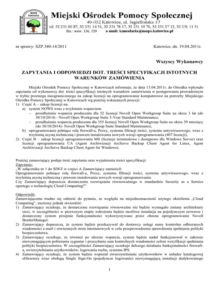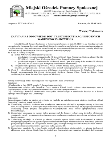 nr sprawy: SZP.340-14/2011 Katowice, dn. 19.04.2011r. Wszyscy Wykonawcy ZAPYTANIA I ODPOWIEDZI DOT. TREŚCI SPECYFIKACJI ISTOTNYCH WARUNKÓW ZAMÓWIENIA Miejski Ośrodek Pomocy Społecznej w Katowicach informuje, że dnia 13.04.2011r. do Ośrodka wpłynęło zapytanie od wykonawcy dot. treści specyfikacji istotnych warunków zamówienia w postępowaniu prowadzonym w trybie przetargu nieograniczonego na zakup licencji na oprogramowanie komputerowe na potrzeby Miejskiego Ośrodka Pomocy Społecznej w Katowicach wg poniżej wskazanych pozycji: 1) Część A – zakup licencji na: a) system NOWS wraz z trzyletnim wsparciem: przedłużenie wsparcia producenta dla 52 licencji Novell Open Workgroup Suite na okres 3 lat (do 30/10/2014) - Novell Open Workgroup Suite 3-Year Standard Maintenance, przedłużenie wsparcia producenta dla 355 licencji Novell Open Workgroup Suite na okres 39 miesięcy (do 30/10/2014)- Novell Open Workgroup Suite Standard Maintenance, b) oprogramowanie pełniące rolę firewall-a, Proxy, systemu filtracji treści, systemu antywirusowego, wraz z trzyletnią asystą techniczną i prawem instalowania nowych wersji oprogramowania (407 licencji), 2) Część B – zakup licencji oprogramowania MS (licencje terminalowe i dostępowe dla Windows Server) oraz licencji oprogramowania CA (Agent Archiwizacji ArcServe Backup Client Agent for Linux, Agent Archiwizacji ArcServe Backup Client Agent for Windows). Poniżej zamawiający podaje treść zapytania oraz wyjaśnienia treści specyfikacji: Zapytanie: „W załączniku nr 1 do SIWZ w części A Zamawiający zamieścił: Oprogramowanie pełniące rolę firewall-a, Proxy, systemu filtracji treści, systemu antywirusowego, wraz z trzyletnią asystą techniczną i prawem instalowania nowych wersji oprogramowania. Czy Zamawiający dopuszcza dostarczenie rozwiązania równoważnego w standardzie Security as a Sernice opartego o technologię Cloud Computing?” Odpowiedź: Zamawiającemu trudno się odnieść do pytania, ze względu na niejednoznaczność użytego określenia „Cloud Computing”, możemy jednak stwierdzić: 1) Zamawiający oczekuje, że dostarczone rozwiązanie równoważne nie będzie wymagało zmiany architektury sieci, w szczególności w pierwszym etapie wdrożenia będzie możliwa instalacja na pojedynczym serwerze i dostarczony system przejmie funkcjonalności wykorzystywane przez obecne oprogramowanie Novell BorderManager. 2) Zamawiający dopuszcza, że system będzie przekazywał do dostawcy usługi sumy kontrolne odbieranych wiadomości e-mail i otwieranych stron internetowych w celu przeprowadzenia sprawdzenia spełniania polityki bezpieczeństwa. 3) Zamawiający oczekuje, że również po okresie wsparcia, system będzie nadal funkcjonował w zakresie niewymagającym pobierania sygnatur i przesyłania sum kontrolnych wiadomości celem weryfikacji spełniania polityki bezpieczeństwa. W szczególności Zamawiający oczekuje dalszego działania funkcjonalności firewalla, uwierzytelniania użytkowników, logowania ruchu, systemu IPS. 4) Zamawiający oczekuje, że system będzie wspierał uwierzytelnianie użytkowników w usłudze katalogowej eDirectory wraz obsługą Single Sign-On (pojedyncze logowanie) niewymagającą instalacji dedykowanego 1 oprogramowania na stacjach użytkowników, bez konieczności przeprowadzania prac wdrożeniowych wymagających wsparcia dostawcy oprogramowania. 5) W wypadku dostarczenia usługi wymagającej podpisania umowy powierzenia danych osobowych (art. 31 ustawy o ochronie danych osobowych), Zamawiający nie dopuszcza dalszego podpowierzenia tych danych. DYREKTOR Miejskiego Ośrodka Pomocy Społecznej mgr Anna Trepka 2