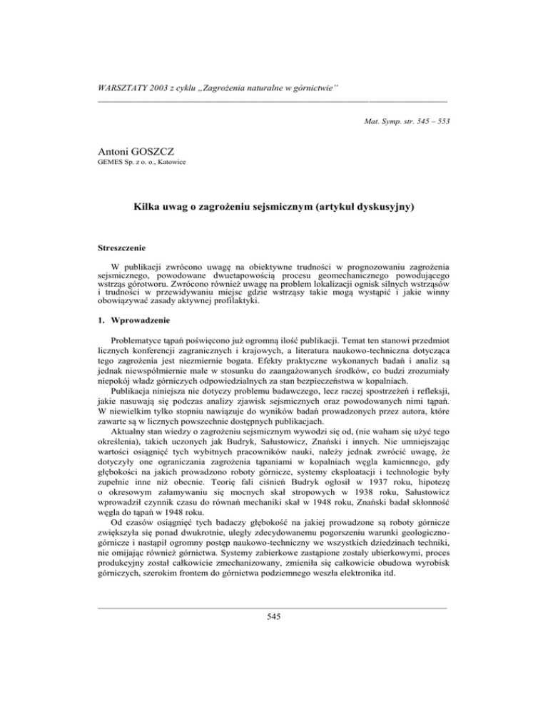 Antoni GOSZCZ Kilka uwag o zagrożeniu sejsmicznym