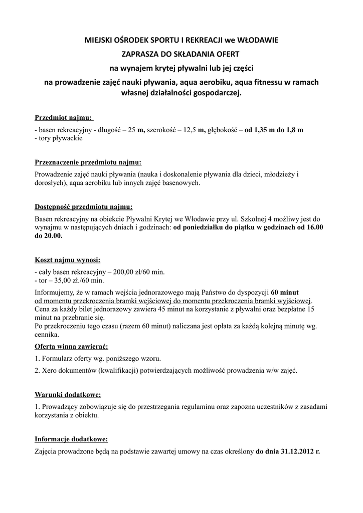 MIEJSKI OŚRODEK SPORTU I REKREACJI we WŁODAWIE ZAPRASZA DO SKŁADANIA OFERT na wynajem krytej pływalni lub jej części na prowadzenie zajęć nauki pływania, aqua aerobiku, aqua fitnessu w ramach własnej działalności gospodarczej. Przedmiot najmu: - basen rekreacyjny - długość – 25 m, szerokość – 12,5 m, głębokość – od 1,35 m do 1,8 m - tory pływackie Przeznaczenie przedmiotu najmu: Prowadzenie zajęć nauki pływania (nauka i doskonalenie pływania dla dzieci, młodzieży i dorosłych), aqua aerobiku lub innych zajęć basenowych. Dostępność przedmiotu najmu: Basen rekreacyjny na obiekcie Pływalni Krytej we Włodawie przy ul. Szkolnej 4 możliwy jest do wynajmu w następujących dniach i godzinach: od poniedziałku do piątku w godzinach od 16.00 do 20.00. Koszt najmu wynosi: - cały basen rekreacyjny – 200,00 zł/60 min. - tor – 35,00 zł./60 min. Informujemy, że w ramach wejścia jednorazowego mają Państwo do dyspozycji 60 minut od momentu przekroczenia bramki wejściowej do momentu przekroczenia bramki wyjściowej. Cena za każdy bilet jednorazowy zawiera 45 minut na korzystanie z pływalni oraz bezpłatne 15 minut na przebranie się. Po przekroczeniu tego czasu (razem 60 minut) naliczana jest opłata za każdą kolejną minutę wg. cennika. Oferta winna zawierać: 1. Formularz oferty wg. poniższego wzoru. 2. Xero dokumentów (kwalifikacji) potwierdzających możliwość prowadzenia w/w zajęć. Warunki dodatkowe: 1. Prowadzący zobowiązuje się do przestrzegania regulaminu oraz zapozna uczestników z zasadami korzystania z obiektu. Informacje dodatkowe: Zajęcia prowadzone będą na podstawie zawartej umowy na czas określony do dnia 31.12.2012 r. Składanie ofert: 1. Oferty należy składać w siedzibie Wynajmującego; Miejski Ośrodek Sportu i Rekreacji we Włodawie 22-200 Włodawa Al. J. Piłsudskiego 41 Formularz ofertowy dotyczy jednego rodzaju prowadzonych zajęć (jeżeli oferent jest zainteresowany kilkoma formami to na każdą należy złożyć oddzielną ofertę). Wzór oferty: Imię i Nazwisko Oferenta ............................................................................................. Adres ................................................................................................................................... REGON ........................................................ NIP: ............................................................. Tel. ...................................................... Rodzaj prowadzonych zajęć ......................................................................................................... Grupa wiekowa: ....................................................... lat Ilość uczestników: ................................................ Dni tygodnia: ................................................................................................ Godz. prowadzenia zajęć ......................................................................................................... Przedmiot najmu ........................................................................................................................ (np. cały basen, 1 tor, 2 tory, 3 tory itp.)