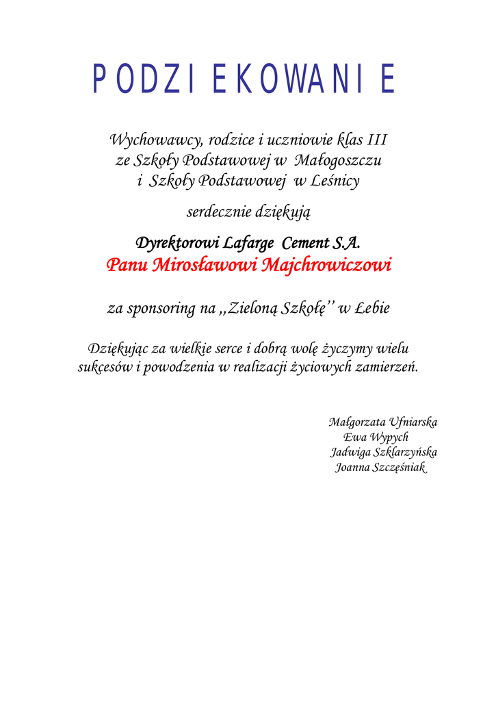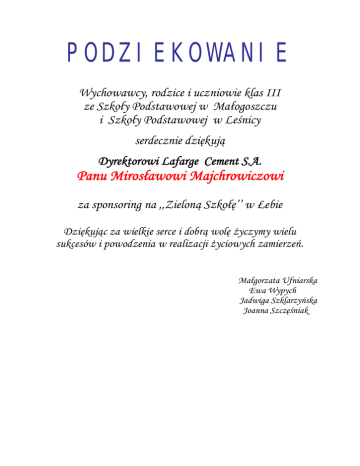 PODZIEKOWANIE Wychowawcy, rodzice i uczniowie klas III ze Szkoły Podstawowej w Małogoszczu i Szkoły Podstawowej w Leśnicy serdecznie dziękują Dyrektorowi Lafarge Cement S.A. Panu Mirosławowi Majchrowiczowi za sponsoring na ,,Zieloną Szkołę’’ w Łebie Dziękując za wielkie serce i dobrą wolę życzymy wielu sukcesów i powodzenia w realizacji życiowych zamierzeń. Małgorzata Ufniarska Ewa Wypych Jadwiga Szklarzyńska Joanna Szczęśniak