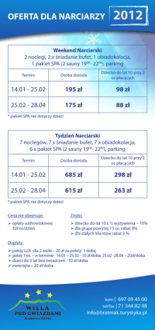 OFERTA DLA NARCIARZY 2012 Weekend Narciarski 2 noclegi, 2 x śniadanie bufet, 1 obiadokolacja, 1 pakiet SPA (2 sauny 1900- 2200), parking Termin Osoba dorosła Dziecko do lat 10 przy 2 os płacących 14.01 - 25.02 195 zł 98 zł 25.02 - 28.04 175 zł 88 zł * pakiet SPA nie dotyczy dzieci Tydzień Narciarski 7 noclegów, 7 x śniadanie bufet, 7 x obiadokolacja, 6 x pakiet SPA (2 sauny 1900- 2200), parking Termin Osoba dorosła Dziecko do lat 10 przy 2 os płacących 14.01 - 25.02 685 zł 298 zł 25.02 - 28.04 615 zł 263 zł * pakiet SPA nie dotyczy dzieci Cena nie obejmuje: Zniżki: Ø opłaty uzdrowiskowej 3zł/os/dzień Ø dziecko do lat 10 z ½ wyżywienia – 10% Ø dla grupy powyżej 15 os. rabat 8% Ø dla stałych klientów rabat 3 % Dopłaty: Ø pokój LUX dla 2 osób – 20 zł za pokój/ 1 dobę Ø pokój 1 os. – w terminie : 14.01 – 25.02 - 10 zł/doba; 25.02 -28.04 – 20zł/doba Ø dzieci do 3 lat bez świadczeń - 10 zł/doba Ø zwierzęta – 20 zł/doba kom | 697 09 45 00 tel/fax | 71 344 82 48 [email protected] STACJE NARCIARSKIE >> 15 km od Willi Pod Gwiazdami ZIELENIEC Polska www.zieleniec.pl; www.winterpol.eu 28 wyciągów narciarskich; 10 oświetlonych stoków ; snowpark oraz pełnowymiarowe rynny (halfpipe). Karnet 1 dzień – 70 zł/os. >> 15 km od Willi Pod Gwiazdami DESTNE Czechy www.skicentrum.sportprofi.cz Średnia stacja narciarska: wyciąg krzesełkowy, 6 orczyków, długie i dobre stoki. Karnet 1 dzień - normalny 420 Kč/os. / ulgowy 320 Kč/os. >> 15 km od Willi Pod Gwiazdami OLESNICE w Górach Orlickich Czechy www.skiolesnice.cz Mała stacja narciarska: 2 wyciągi narciarskie (500m i 300m); 4 trasy zjazdowe o długości 3,5 km. Karnet 1 dzień – 290 Kč/os. >> 55 km od Willi Pod Gwiazdami CZARNA GÓRA w Jańskich Łaźniach Czechy Mała stacja narciarska: 2 wyciągi narciarskie (500m i 300m); 4 trasy zjazdowe o długości 3,5 km. Karnet 1 dzień – 52 zł/os.Duży resort narciarski. Nowoczesny kompleks ze wspólnym karnetem w Jańskich Łaźniach, Czarnym Dole i Svobodzie nad Upou. 20 km stoków narciarskich; 4 koleje linowe, 8-siodełkowa kolej gondolowa oraz 22 wyciągi narciarskie, zawodniczy 3,5 km tor saneczkarski, KIDpark i SNOWpark, 70 km tras biegowych. Karnet 1 dzień – normalny 590 Kč/os. / ulgowy 360 Kč/os. >> 3 km od Willi Pod Gwiazdami Dolina Sportów Zimowych w Kudowie Zdrój Ośrodek dla dzieci i początkujących narciarzy. Wyciąg narciarski 200 metrowy , długość zjazdu 450 m, wyciąg 100 metrowy „śnieżne koło” śnieżny ponton na trasie zjazdowej 300 m. Wypożyczalnia nart i sanek, bufet. Karnet 11 zjazdów – normalny 15 zł/os. / ulgowy 12 zł/os.