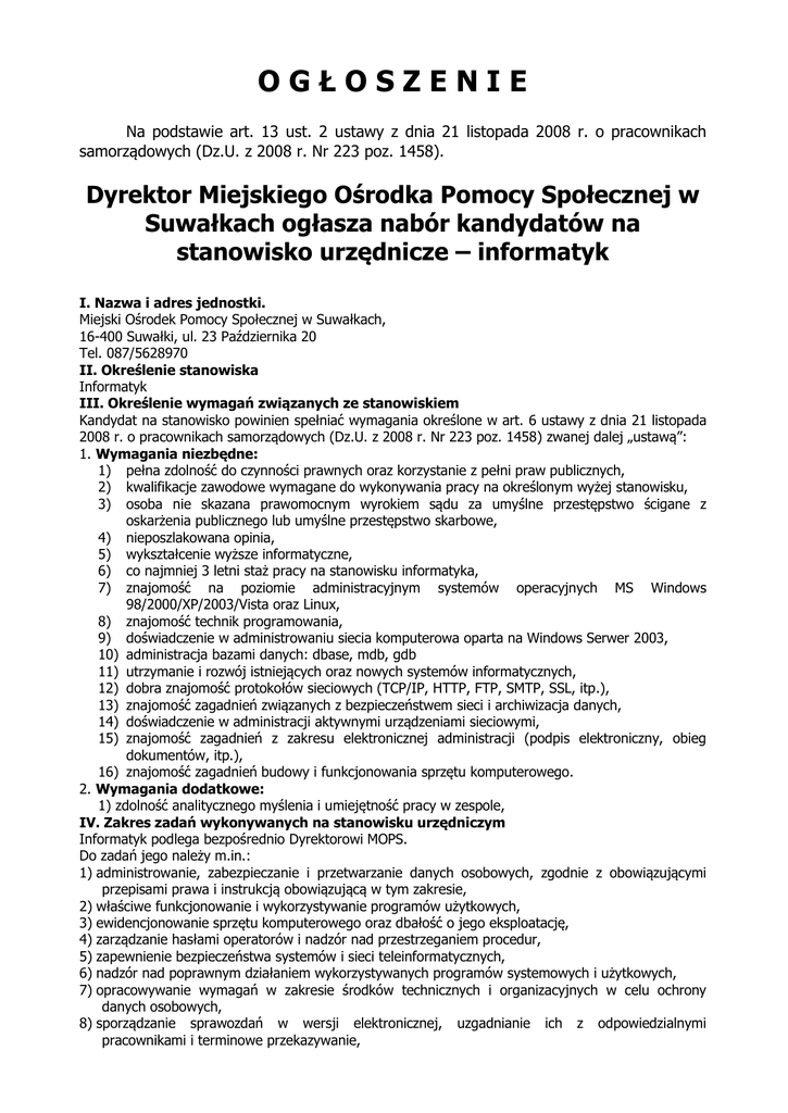 OGŁOSZENIE Na podstawie art. 13 ust. 2 ustawy z dnia 21 listopada 2008 r. o pracownikach samorządowych (Dz.U. z 2008 r. Nr 223 poz. 1458). Dyrektor Miejskiego Ośrodka Pomocy Społecznej w Suwałkach ogłasza nabór kandydatów na stanowisko urzędnicze – informatyk I. Nazwa i adres jednostki. Miejski Ośrodek Pomocy Społecznej w Suwałkach, 16-400 Suwałki, ul. 23 Października 20 Tel. 087/5628970 II. Określenie stanowiska Informatyk III. Określenie wymagań związanych ze stanowiskiem Kandydat na stanowisko powinien spełniać wymagania określone w art. 6 ustawy z dnia 21 listopada 2008 r. o pracownikach samorządowych (Dz.U. z 2008 r. Nr 223 poz. 1458) zwanej dalej „ustawą”: 1. Wymagania niezbędne: 1) pełna zdolność do czynności prawnych oraz korzystanie z pełni praw publicznych, 2) kwalifikacje zawodowe wymagane do wykonywania pracy na określonym wyżej stanowisku, 3) osoba nie skazana prawomocnym wyrokiem sądu za umyślne przestępstwo ścigane z oskarżenia publicznego lub umyślne przestępstwo skarbowe, 4) nieposzlakowana opinia, 5) wykształcenie wyższe informatyczne, 6) co najmniej 3 letni staż pracy na stanowisku informatyka, 7) znajomość na poziomie administracyjnym systemów operacyjnych MS Windows 98/2000/XP/2003/Vista oraz Linux, 8) znajomość technik programowania, 9) doświadczenie w administrowaniu siecia komputerowa oparta na Windows Serwer 2003, 10) administracja bazami danych: dbase, mdb, gdb 11) utrzymanie i rozwój istniejących oraz nowych systemów informatycznych, 12) dobra znajomość protokołów sieciowych (TCP/IP, HTTP, FTP, SMTP, SSL, itp.), 13) znajomość zagadnień związanych z bezpieczeństwem sieci i archiwizacja danych, 14) doświadczenie w administracji aktywnymi urządzeniami sieciowymi, 15) znajomość zagadnień z zakresu elektronicznej administracji (podpis elektroniczny, obieg dokumentów, itp.), 16) znajomość zagadnień budowy i funkcjonowania sprzętu komputerowego. 2. Wymagania dodatkowe: 1) zdolność analitycznego myślenia i umiejętność pracy w zespole, IV. Zakres zadań wykonywanych na stanowisku urzędniczym Informatyk podlega bezpośrednio Dyrektorowi MOPS. Do zadań jego należy m.in.: 1) administrowanie, zabezpieczanie i przetwarzanie danych osobowych, zgodnie z obowiązującymi przepisami prawa i instrukcją obowiązującą w tym zakresie, 2) właściwe funkcjonowanie i wykorzystywanie programów użytkowych, 3) ewidencjonowanie sprzętu komputerowego oraz dbałość o jego eksploatację, 4) zarządzanie hasłami operatorów i nadzór nad przestrzeganiem procedur, 5) zapewnienie bezpieczeństwa systemów i sieci teleinformatycznych, 6) nadzór nad poprawnym działaniem wykorzystywanych programów systemowych i użytkowych, 7) opracowywanie wymagań w zakresie środków technicznych i organizacyjnych w celu ochrony danych osobowych, 8) sporządzanie sprawozdań w wersji elektronicznej, uzgadnianie ich z odpowiedzialnymi pracownikami i terminowe przekazywanie, 9) zarzadzanie systemami informatycznymi jednostki w celu zapewnienia sprawnego i efektywnego dostepu do zasobów, 10) zarzadzanie i administrowanie istniejącą siecią komputerową oraz urządzeniami sieciowymi, 11) administrowanie serwerem, 12) przeglady i konserwacja sprzetu komputerowego, 13) instalowanie systemów i programów komputerowych, 14) wykonywanie przegladów systemów operacyjnych Windows, 15) dokonywanie instalacji i reinstalacji systemów operacyjnych, 16) wsparcie techniczne w rozwiazywaniu problemów z oprogramowaniem oraz sprzetem, 17) udostępnianie danych osobowych, 18) tworzenie i administrowanie stron www. V. Oferta kandydata powinna zawierać: 1) list motywacyjny, 2) kwestionariusz osobowy dla osoby ubiegającej się o zatrudnienie, 3) życiorys zawodowy (CV), 4) kserokopie świadectw pracy (w przypadku pozostawania w chwili składania oferty w zatrudnieniu – umowa o pracę), 5) kserokopie dokumentów potwierdzających wykształcenie (odpis dyplomu i inne dokumenty), 6) kserokopie zaświadczeń o ukończonych kursach, szkoleniach, 7) oświadczenie o niekaralności za umyślne przestępstwa ścigane z oskarżenia publicznego lub umyślne przestępstwa skarbowe, 8) oświadczenie o korzystaniu z pełni praw publicznych, 9) opinie z poprzednich lub ewentualnie obecnych miejsc pracy (min. 2 referencje), 10) oświadczenie o wyrażeniu zgody na przetwarzanie danych osobowych do celów rekrutacji. Wybrany kandydat zobowiązany będzie dostarczyć przed zawarciem umowy o pracę zaświadczenie o niekaralności z Krajowego Rejestru Karnego. Kopie składanych dokumentów muszą być potwierdzone za zgodność z oryginałem w Sekretariacie lub w Kadrach MOPS, bądź przez Notariusza. VI. Termin i miejsce składania wymaganych dokumentów. Kandydaci przystępujący do otwartego i konkurencyjnego naboru na stanowisko urzędnicze składają w sekretariacie Miejskiego Ośrodka Pomocy Społecznej w Suwałkach ul. 23 Października 20, pokój nr 7, w terminie do dnia 12.10.2009 r. do godz.12-tej, wymagane dokumenty, o których mowa w cz. V ogłoszenia w zamkniętej kopercie z podanym adresem zwrotnym, z dopiskiem „Nabór, kwalifikacje – informatyk” Aplikacje, które wpłyną po wyżej określonym terminie nie będą rozpatrywane. Informacja o wyniku naboru będzie umieszczona na stronie Biuletynu Informacji Publicznej (strona internetowa Urzędu Miejskiego w Suwałkach) oraz na stronie internetowej MOPS i tablicy ogłoszeń w siedzibie Ośrodka. Data ogłoszenia konkursu: 29.09.2009 r. Dyrektor Miejskiego Ośrodka Pomocy Społecznej w Suwałkach mgr Maria Metelska
