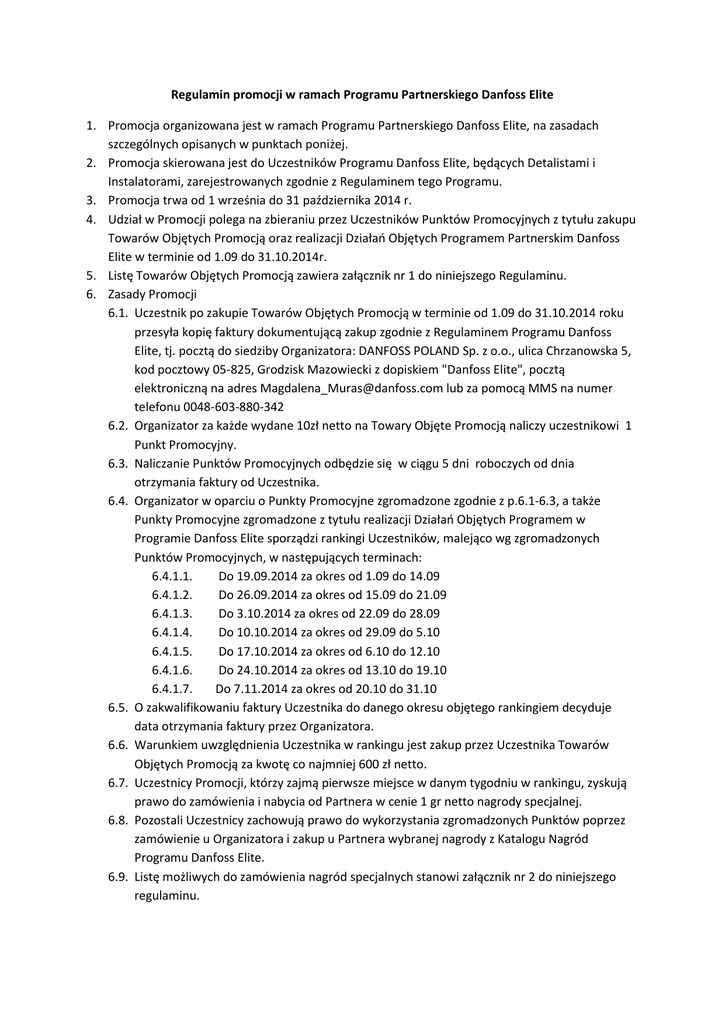 Regulamin promocji w ramach Programu Partnerskiego Danfoss Elite 1. Promocja organizowana jest w ramach Programu Partnerskiego Danfoss Elite, na zasadach szczególnych opisanych w punktach poniżej. 2. Promocja skierowana jest do Uczestników Programu Danfoss Elite, będących Detalistami i Instalatorami, zarejestrowanych zgodnie z Regulaminem tego Programu. 3. Promocja trwa od 1 września do 31 października 2014 r. 4. Udział w Promocji polega na zbieraniu przez Uczestników Punktów Promocyjnych z tytułu zakupu Towarów Objętych Promocją oraz realizacji Działań Objętych Programem Partnerskim Danfoss Elite w terminie od 1.09 do 31.10.2014r. 5. Listę Towarów Objętych Promocją zawiera załącznik nr 1 do niniejszego Regulaminu. 6. Zasady Promocji 6.1. Uczestnik po zakupie Towarów Objętych Promocją w terminie od 1.09 do 31.10.2014 roku przesyła kopię faktury dokumentującą zakup zgodnie z Regulaminem Programu Danfoss Elite, tj. pocztą do siedziby Organizatora: DANFOSS POLAND Sp. z o.o., ulica Chrzanowska 5, kod pocztowy 05-825, Grodzisk Mazowiecki z dopiskiem "Danfoss Elite", pocztą elektroniczną na adres [email protected] lub za pomocą MMS na numer telefonu 0048-603-880-342 6.2. Organizator za każde wydane 10zł netto na Towary Objęte Promocją naliczy uczestnikowi 1 Punkt Promocyjny. 6.3. Naliczanie Punktów Promocyjnych odbędzie się w ciągu 5 dni roboczych od dnia otrzymania faktury od Uczestnika. 6.4. Organizator w oparciu o Punkty Promocyjne zgromadzone zgodnie z p.6.1-6.3, a także Punkty Promocyjne zgromadzone z tytułu realizacji Działań Objętych Programem w Programie Danfoss Elite sporządzi rankingi Uczestników, malejąco wg zgromadzonych Punktów Promocyjnych, w następujących terminach: 6.4.1.1. Do 19.09.2014 za okres od 1.09 do 14.09 6.4.1.2. Do 26.09.2014 za okres od 15.09 do 21.09 6.4.1.3. Do 3.10.2014 za okres od 22.09 do 28.09 6.4.1.4. Do 10.10.2014 za okres od 29.09 do 5.10 6.4.1.5. Do 17.10.2014 za okres od 6.10 do 12.10 6.4.1.6. Do 24.10.2014 za okres od 13.10 do 19.10 6.4.1.7. Do 7.11.2014 za okres od 20.10 do 31.10 6.5. O zakwalifikowaniu faktury Uczestnika do danego okresu objętego rankingiem decyduje data otrzymania faktury przez Organizatora. 6.6. Warunkiem uwzględnienia Uczestnika w rankingu jest zakup przez Uczestnika Towarów Objętych Promocją za kwotę co najmniej 600 zł netto. 6.7. Uczestnicy Promocji, którzy zajmą pierwsze miejsce w danym tygodniu w rankingu, zyskują prawo do zamówienia i nabycia od Partnera w cenie 1 gr netto nagrody specjalnej. 6.8. Pozostali Uczestnicy zachowują prawo do wykorzystania zgromadzonych Punktów poprzez zamówienie u Organizatora i zakup u Partnera wybranej nagrody z Katalogu Nagród Programu Danfoss Elite. 6.9. Listę możliwych do zamówienia nagród specjalnych stanowi załącznik nr 2 do niniejszego regulaminu. 6.10. W przypadku uzyskania takiej samej ilości punktów przez dwóch lub więcej Uczestników, o kolejności w rankingu decyduje pierwszeństwo uzyskania największej ilości punktów. 7. Dystrybucja nagród i obsługa ewentualnych reklamacji realizowana jest zgodnie z Regulaminem Programu Partnerskiego Danfoss Elite. 8. Laureat o wygranej zostanie poinformowany telefonicznie lub e-mailowo przez Organizatora Załącznik nr 1. Lista Towarów Objętych Promocją. Załącznik nr 2. Lista nagród specjalnych możliwych do zamówienia w Promocji. 1. Tablet Samsung Galaxy Tab 4 10.1 T530 WiFi 16G biały 2. Kino domowe Samsung HT-F5530 3D 3. Telewizor LG 32" LED 32LB5610 4. Kärcher Myjka ciśnieniowa K 4 5. Telefon Samsung Galaxy S4 mini i9195 czarny 6. Ekspres do kawy Saeco Xsmall HD8743/19 7. Rower turystyczny Maxim MC 1.1 MAN 26"