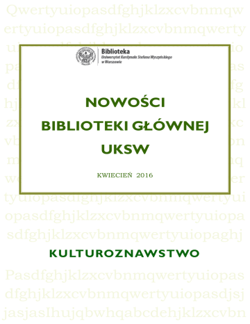 Qwertyuiopasdfghjklzxcvbnmqw NOWOŚCI BIBLIOTEKI GŁÓWNEJ UKSW ertyuiopasdfghjklzxcvbnmqwerty uiopasdfghjklzxcvbnmqwertyuio pasdfghjklzxcvbnmqwertyuiopas dfghjklzxcvbnmqwertyuiopasdfg NOWOŚCI hjklzxcvbnmqwertyuiopasdfghjkl zxcvbnmqwertyuiopasdfghjklzxc BIBLIOTEKI GŁÓWNEJ vbnmqwertyuiopasdfghjklzxcvbn UKSW mqwertyuiopasdfghjklzxcvbnmq KWIECIEŃ 2016 wertyuiopasdfghjklzxcvbnmqwer tyuiopasdfghjklzxcvbnmqwertyui opasdfghjklzxcvbnmqwertyuiopa sdfghjklzxcvbnmqwertyuiopaghj KULTUROZNAWSTWO Pasdfghjklzxcvbnmqwertyuiopas dfghjklzxcvbnmqwertyuiopasdjsj jasjasIhujqbwhqabcdehjklzxcvbn KULTUROZNAWSTWO kwiecień 2016 1 ASSMANN, ALEIDA (1947- ). Wprowadzenie do kulturoznawstwa : podstawowe terminy, problemy, pytania / Aleida Assmann ; tłumaczenie i wstęp Anna Artwińska i Katarzyna Różańska. – Poznań : Wydawnictwo Nauka i Innowacje, 2015. – 362, [1] s. ; 23 cm. Na podst. 3. wyd. niem. – Bibliogr. s. 338-353 oraz przy rozdz. Indeksy. ISBN 978-83-64864-10-0 Sygn.: 343007 2 BISKO, AGATA ANNA. Polska dla średnio zaawansowanych : współczesna polskość codzienna / Agata Bisko. – Kraków : Towarzystwo Autorów i Wydawców Prac Naukowych Universitas, [2015], cop. 2014. – 468, [3] s. ; 24 cm. Na s. red. i s. 4 okł. błędnie zapisany ISBN: 97883-242-2783-9. – Na s. red.: cop. 2014. Prawidłowy r. wyd. wg inform. od wydawcy. – Bibliogr. s. 445-458. Indeks. ISBN 97883-242-2783-9 Sygn.: 343335 3 BROWN, KATE. Kresy : biografia krainy, której nie ma : jak zniszczono wielokulturowe pogranicze / Kate Brown ; tł. Aleksandra Czwojdrak. – Kraków : Wydawnictwo Uniwersytetu Jagiellońskiego, cop. 2013. – 341, [2] s. : il. ; 21 cm. – (Historiai) Tyt. oryg.: A biography of no place : from ethnic borderland to Soviet heartland, 2004. – Indeks. ISBN 978-83-233-3571-9 Sygn.: 343182 4 DROŻDŻ, BOGUSŁAW (1963- ). Kultura czy jogurt / Bogusław A. Drożdż. – Legnica : Diecezjalne Centrum Edukacyjne : Biblioteka im. Jana Pawła II Wyższego Seminarium Duchownego Diecezji Legnickiej, 2015. – 94 s. : il. ; 20 cm. ISBN 978-83-64013-24-9 Sygn.: 167094 5 GAWRYCKI, MARCIN FLORIAN (1975- ). (I)grając ze smakiem : muzyka, tożsamość i polityka na Karaibach / Marcin Florian Gawrycki. – Warszawa : Wydawnictwa Uniwersytetu Warszawskiego, 2013. – 431 s. ; 24 cm. – Bibliogr. s. 408-431. ISBN 978-83-235-1007-9 NOWE POZYCJE W KATALOGU KULTUROZNAWSTWO kwiecień 2016 Sygn.: 343030 6 Humanistyczne modele kultury nowożytnej wobec dziedzictwa starożytnego / red. nauk. tomu Marek Prejs. – Warszawa : Wydawnictwo Neriton, 2010. – 466 s. ; 22 cm. – (Humanizm : idee, nurty i paradygmaty humanistyczne w kulturze polskiej. Syntezy ; t. 5) Indeks. ISBN 978-83-7543-201-5 Sygn.: 343004 7 Inkowie o Inkach : antologia / spolszczył, przypisami i komentarzami opatrzył Jan Szemiński. – Warszawa : Uniwersytet Warszawski. Wydział „Artes Liberales", 2015. – 283, [1] s. : il. ; 24 cm. ISBN 978-83-63636-31-9 Sygn.: 343047 8 JAGIELSKI, SEBASTIAN. Maskarady męskości : pragnienie homospołeczne w polskim kinie fabularnym / Sebastian Jagielski. – Kraków : Towarzystwo Autorów i Wydawców Prac Naukowych Universitas, cop. 2013. – 554 s. : il. ; 24 cm. – (Horyzonty Kina ; 7) Bibliogr. s. 495-521. Indeksy. ISBN 97883-242-2284-1 Sygn.: 343315 9 Kobiety w cywilizacji konfucjańskiej / red. nauk. Elżbieta Potocka. – Toruń : Wydawnictwo Naukowe Grado, 2014. – 250 s. : il. ; 21 cm. – (Biblioteka Azji i Pacyfiku) Bibliogr. przy rozdz. – Streszcz. ang. ISBN 978-83-62941-45-2 Sygn.: 343184 10 Konwencje UNESCO w dziedzinie kultury : komentarz / red. Katarzyna Zalasińska ; [aut.]: Wojciech Kowalski [et al.]. – Stan prawny na 1 stycznia 2014 r. – Warszawa : Lex a Wolters Kluwer business, 2014. – 535, [1] s. ; 21 cm. – (Praktyczne Komentarze Lex) Bibliogr. s. 521-533. ISBN 978-83-264-3157-9 Sygn.: 342755 NOWE POZYCJE W KATALOGU KULTUROZNAWSTWO kwiecień 2016 11 KOSSEWSKA, ELŻBIETA (1972- ). Ona jeszcze mówi po polsku, ale śmieje się po hebrajsku : partyjna prasa polskojęzyczna i integracja kulturowa polskich Żydów w Izraelu (19481970) / Elżbieta Kossewska. – Warszawa : Wydawnictwa Uniwersytetu Warszawskiego, 2015. – 507, [1] s., [8] s. tabl. : il. ; 21 cm. – Bibliogr. s. 470-487. Indeks. – Streszcz. ang. ISBN 978-83-235-1882-2 Sygn.: 343000 12 Kultura nie-ludzka / pod redakcją Aleksandry Kil, Jacka Małczyńskiego, Doroty Wolskiej. – Wrocław : Wydawnictwo Uniwersytetu Wrocławskiego, 2015. – 275 s. : il. ; 24 cm. – (Acta Universitatis Wratislaviensis. Prace Kulturoznawcze, ISSN 0860-6668 ; 18) W serii gł.: no 3664. – Streszcz. i spis treści także ang. ISBN 978-83-229-3490-6 Sygn.: 343107 13 Kulturkontakte : Szenen und Modelle in deutsch-japanischen Kontexten / Yuichi Kimura, Thomas Pekar (Hg.) ; (unter Mitarb. von Mechthild Duppel-Takayama). – Bielefeld : Transcript Verlag, cop. 2015. – 368 s. : il. ; 23 cm. – (Edition Kulturwissenschaft ; Bd. 43) Bibliogr. przy rozdz. ISBN 978-3-8376-2739-8 (Print) – ISBN 978-3-8394-2739-2 (PDF) Sygn.: 342735 14 LACKNER, THOMAS. Computerspiel und Lebenswelt : kulturanthropologische Perspektiven / Thomas Lackner. – Bielefeld : Transcript Verlag, cop. 2014. – 313 s. ; 22 cm. – (Edition Kulturwissenschaft ; Bd. 53) Bibliogr. s. 299-313. ISBN 978-3-8376-2881-4 (Print) – ISBN 978-3-8394-2881-8 (PDF) Sygn.: 342734 15 MAJEWSKA, EWA (1978- ). Sztuka jako pozór? : cenzura i inne paradoksy upolitycznienia kultury / Ewa Majewska. – Kraków : Korporacja Ha!art, 2013. – 253 s. ; 20 cm. – (Linia Radykalna ; 13) Bibliogr. s. 241-249. ISBN 978-83-64057-30-4 Sygn.: 167169 NOWE POZYCJE W KATALOGU KULTUROZNAWSTWO kwiecień 2016 16 MALISZEWSKI, KRZYSZTOF. Ciemne iskry : problem aktualizacji pedagogiki kultury / Krzysztof Maliszewski. – Toruń : Wydawnictwo Adam Marszałek, 2013. – 297 s. ; 23 cm. Bibliogr. s. 271-288. Indeks. ISBN 978-83-7780-674-6 Sygn.: 343113 17 MICHALSKI, MICHAŁ (kulturoznawstwo). Znaczenie rodziny 