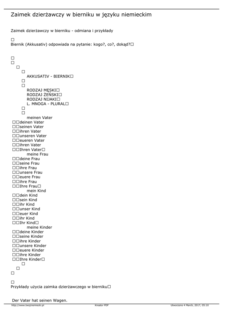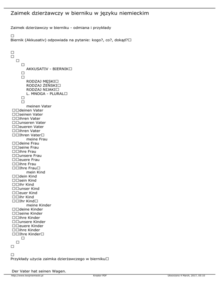 Zaimek dzierżawczy w bierniku w języku niemieckim Zaimek dzierżawczy w bierniku - odmiana i przykłady Biernik (Akkusativ) odpowiada na pytanie: kogo?, co?, dokąd? AKKUSATIV - BIERNIK RODZAJ MĘSKI RODZAJ ŻEŃSKI RODZAJ NIJAKI L. MNOGA - PLURAL meinen Vater deinen Vater seinen Vater ihren Vater unseren Vater eueren Vater ihren Vater Ihren Vater meine Frau deine Frau seine Frau ihre Frau unsere Frau euere Frau ihre Frau Ihre Frau mein Kind dein Kind sein Kind ihr Kind unser Kind euer Kind ihr Kind Ihr Kind meine Kinder deine Kinder seine Kinder ihre Kinder unsere Kinder euere Kinder ihre Kinder Ihre Kinder Przykłady użycia zaimka dzierżawczego w bierniku Der Vater hat seinen Wagen. http://www.twojniemiecki.pl Kreator PDF Utworzono 4 March, 2017, 05:10 (Tata ma swój samochód.) Peter hat sein Fahrrad. (Piotr ma swój rower.) Liest du deine Bücher? (Czytasz swoje / twoje książki?) Wir kennen seinen Sohn. (Znamy jego syna.) Ihr kennt euren Freund. (Wy znacie waszego przyjaciela.) Sie hat meine Katze. (Ona ma mojego kota.) Formy pierwszego i czwartego przypadku (Nominativ i Akkusativ) są w liczbie pojedynczej identyczne dla rodzaju nijakiego i żeńskiego. http://www.twojniemiecki.pl Kreator PDF Utworzono 4 March, 2017, 05:10