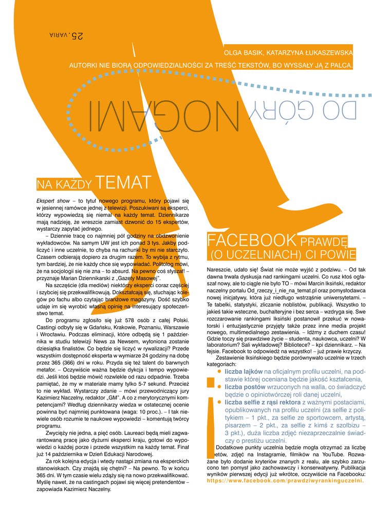 2 5 . VA R I A Olga Basik, Katarzyna Łukaszewska Autorki nie biorą odpowiedzialności za treść tekstów, bo wyssały jĄ z palca. DO GÓRY NOGAMI Na każdy temat Ekspert show – to tytuł nowego programu, który pojawi się w jesiennej ramówce jednej z telewizji. Poszukiwani są eksperci, którzy wypowiedzą się niemal na każdy temat. Dziennikarze mają nadzieję, że wreszcie zamiast dzwonić do 15 ekspertów, wystarczy zapytać jednego. – Dziennie tracę co najmniej pół godziny na obdzwonienie wykładowców. Na samym UW jest ich ponad 3 tys. Jakby podliczyć i inne uczelnie, to chyba na rachunki by mi nie starczyło. Czasem odbierają dopiero za drugim razem. To wybija z rytmu, tym bardziej, że nie każdy chce się wypowiadać. Politolog mówi, że na socjologii się nie zna – to absurd. Na pewno coś słyszał! – przyznaje Marian Dziennikarski z „Gazety Masowej”. Na szczęście (dla mediów) niektórzy eksperci coraz częściej i szybciej się przekwalifikowują. Dokształcają się, słuchając kolegów po fachu albo czytając branżowe magazyny. Dość szybko udaje im się wyrobić własną opinię na interesujący społeczeństwo temat. Do programu zgłosiło się już 578 osób z całej Polski. Castingi odbyły się w Gdańsku, Krakowie, Poznaniu, Warszawie i Wrocławiu. Podczas eliminacji, które odbędą się 1 października w studiu telewizji News za Newsem, wyłoniona zostanie dziesiątka finalistów. Co będzie się liczyć w rywalizacji? Przede wszystkim dostępność eksperta w wymiarze 24 godziny na dobę przez 365 (366) dni w roku. Przyda się też talent do barwnych metafor. – Oczywiście ważna będzie dykcja i tempo wypowiedzi. Jeśli ktoś będzie mówić rozwlekle od razu odpadnie. Trzeba pamiętać, że my w materiale mamy tylko 5-7 sekund. Przecież to nie wykład. Wystarczy zdanie – mówi przewodniczący jury Kazimierz Naczelny, redaktor „GM”. A co z merytorycznymi kompetencjami? Według dziennikarzy wiedza w ostatecznej ocenie powinna być najmniej punktowana (waga: 10 proc.). – I tak niewiele osób rozumie te naukowe wypowiedzi – komentują twórcy programu. Zwycięży nie jedna, a pięć osób. Laureaci będą mieli zagwarantowaną pracę jako dyżurni eksperci kraju, gotowi do wypowiedzi o każdej porze i przede wszystkim na każdy temat. Finał już 14 października w Dzień Edukacji Narodowej. Za rok kolejna edycja i wtedy nastąpi zmiana na eksperckich stanowiskach. Czy znajdą się chętni? – Na pewno. To w końcu 365 dni. W tym czasie wielu zdąży się na nowo przekwalifikować. Myślę nawet, że na castingach pojawi się więcej pretendentów – zapowiada Kazimierz Naczelny. Facebook prawdę (o uczelniach) ci powie Nareszcie, udało się! Świat nie może wyjść z podziwu. – Od tak dawna trwała dyskusja nad rankingami uczelni. Co rusz ktoś ogłaszał nowy, ale to ciągle nie było TO – mówi Marcin Iksiński, redaktor naczelny portalu Od_rzeczy_i_nie_na_temat.pl oraz pomysłodawca nowej inicjatywy, która już niedługo wstrząśnie uniwersytetami. – Te tabelki, statystyki, zliczanie noblistów, publikacji. Wszystko to jakieś takie wsteczne, buchalteryjne i bez serca – wzdryga się. Swe rozczarowanie rankingami Iksiński postanowił przekuć w nowatorski i entuzjastycznie przyjęty także przez inne media projekt nowego, multimedialnego zestawienia. – Idźmy z duchem czasu! Gdzie toczy się prawdziwe życie – studenta, naukowca, uczelni? W laboratorium? Sali wykładowej? Bibliotece? – kpi dziennikarz. – Na fejsie. Facebook to odpowiedź na wszystko! – już prawie krzyczy. Zestawienie Iksińskiego będzie porównywało uczelnie w trzech kategoriach: lajków na oficjalnym profilu uczelni, na pod•liczba stawie której oceniana będzie jakość kształcenia, postów wrzuconych na walla, co świadczyć •liczba będzie o opiniotwórczej roli danej uczelni, selfie z rąsi rektora z ważnymi postaciami, •liczba opublikowanych na profilu uczelni (za selfie z politykiem – 1 pkt., za selfie ze sportowcem, artystą, pisarzem – 2 pkt., za selfie z kimś z szołbizu – 3 pkt.), duża liczba zdjęć niezaprzeczalnie świadczy o prestiżu uczelni. Dodatkowe punkty uczelnia będzie mogła otrzymać za liczbę tweetów, zdjęć na Instagramie, filmików na YouTube. Rozważane było dodanie kryteriów znanych z realu, ale szybko zarzucono ten pomysł jako zachowawczy i konserwatywny. Publikacja wyników pierwszej edycji już wkrótce, oczywiście na Facebooku: https://www.facebook.com/prawdziwyrankinguczelni. Monter z doktoratem poszukiwany Iście świetlana przyszłość czeka absolwentów praktycznych kierunków studiów – wynika z analizy rynku przeprowadzonej na zlecenie miesięcznika „Praca i płaca”. Mądrze postąpili ci maturzyści, którzy uwierzyli w kampanie promocyjne, spoty telewizyjne, wypowiedzi ekspertów, że nie warto być humanistą, socjologiem, a już na pewno nienawykłym do spawania politologiem i szturmem ruszyli na studia, dające konkretny fach w ręku. Czeka na nich tysiące miejsc pracy – w montowniach samochodów, przy taśmach produkcyjnych śrubek i nakładek, w fabrykach bombek (bo nie zapominajmy, że polska gospodarka bombkami choinkowymi stoi). Kolokwia, laboratoria, referaty, prace roczne, godziny, lata nauki – ale opłaciło się. Tysiące wykutych na pamięć wzorów, setki rozwiązanych zadań, dziesiątki przeprowadzonych eksperymentów – wszystko to pozwoli poprawić efektywność, zwiększyć wydajność, wzmocnić tempo pracy armii nowych monterów – świeżo upieczonych absolwentów kierunków praktycznych. No bo ile taki monter bez wykształcenia może w ciągu godziny spasować śrubek z nakładką? 2… no może 2,5 tysiąca. A z magisterium już 3,5 tysiąca. Nie mówiąc o monterach z doktoratem, którzy osiągają normy 5 tysięcy śrubek na godzinę! – Mądry Polak po szkodzie – plują sobie w brodę zazdrośni absolwenci uniwersytetó