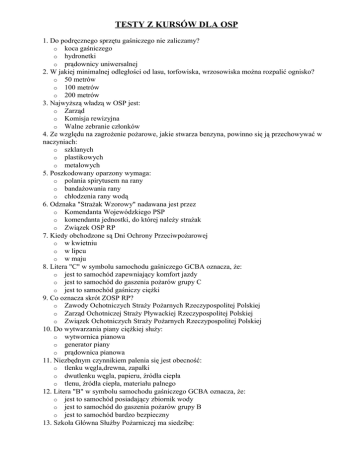 TESTY Z KURSÓW DLA OSP 1. Do podręcznego sprzętu gaśniczego nie zaliczamy? o koca gaśniczego o hydronetki o prądownicy uniwersalnej 2. W jakiej minimalnej odległości od lasu, torfowiska, wrzosowiska można rozpalić ognisko? o 50 metrów o 100 metrów o 200 metrów 3. Najwyższą władzą w OSP jest: o Zarząd o Komisja rewizyjna o Walne zebranie członków 4. Ze względu na zagrożenie pożarowe, jakie stwarza benzyna, powinno się ją przechowywać w naczyniach: o szklanych o plastikowych o metalowych 5. Poszkodowany oparzony wymaga: o polania spirytusem na rany o bandażowania rany o chłodzenia rany wodą 6. Odznaka "Strażak Wzorowy" nadawana jest przez o Komendanta Wojewódzkiego PSP o komendanta jednostki, do której należy strażak o Związek OSP RP 7. Kiedy obchodzone są Dni Ochrony Przeciwpożarowej o w kwietniu o w lipcu o w maju 8. Litera "C" w symbolu samochodu gaśniczego GCBA oznacza, że: o jest to samochód zapewniający komfort jazdy o jest to samochód do gaszenia pożarów grupy C o jest to samochód gaśniczy ciężki 9. Co oznacza skrót ZOSP RP? o Zawody Ochotniczych Straży Pożarnych Rzeczypospolitej Polskiej o Zarząd Ochotniczej Straży Pływackiej Rzeczypospolitej Polskiej o Związek Ochotniczych Straży Pożarnych Rzeczypospolitej Polskiej 10. Do wytwarzania piany ciężkiej służy: o wytwornica pianowa o generator piany o prądownica pianowa 11. Niezbędnym czynnikiem palenia się jest obecność: o tlenku węgla,drewna, zapałki o dwutlenku węgla, papieru, źródła ciepła o tlenu, źródła ciepła, materiału palnego 12. Litera "B" w symbolu samochodu gaśniczego GCBA oznacza, że: o jest to samochód posiadający zbiornik wody o jest to samochód do gaszenia pożarów grupy B o jest to samochód bardzo bezpieczny 13. Szkoła Główna Służby Pożarniczej ma siedzibę: w Krakowie w Częstochowie w Warszawie 14. Jaką grupę pożarów określa symbol A umieszczony na gaśnicy? o pożar gazów o pożar cieczy palnych lub materiałów topiących się o pożar ciał stałych głównie pochodzenia organicznego 15. Ile razy w roku należy usuwać zanieczyszczenia z przewodów dymowych od palenisk opalanych paliwem stałym (np. węglem) w budynku mieszkalnym? o co najmniej raz w miesiącu o co najmniej 4 razy o co najmniej 2 razy 16. Jaki jest najwyższy stopień w korpusie oficerów PSP? o starszy kapitan o generał brygadier o nadbrygadier 17. Odległość ustawienia sterty, stogu od lasów i terenów zadrzewionych powinna wynosić conajmniej: o 150 metrów o 100 metrów o 50 metrów 18. Jaki narząd jest najbardziej wrażliwy na niedotlenienie? o serce o nerki o mózg 19. Ile jest kategorii zagrożenia pożarowego lasu? o trzy o cztery o pięć 20. Budynki średniowysokie to budynki o wysokości: o od 12 do 25 metrów o od 25 do 55 metrów o ponad 55 metrów 21. Gdzie w Polsce znajdują się relikwie św. Floriana? o w Krakowie o w Gnieźnie o w Warszawie 22. Jakim symbolem oznaczany jest średni samochód pożarniczy: o nie posiada oznaczenia o C o L 23. Krwotok tętniczy tamujemy opatrunkiem: o foliowym o osłaniającym o uciskowym 24. Jaki gaz wydzielający się podczas pożaru stwarza zagrożenie zatrucia się: o wodór o tlen o tlenek węgla 25. Państwowa Straż Pożarna została utworzona: o w 1975 roku o w 1992 roku o o o w 1921 roku 26. Czy udzielenie pierwszej pomocy należy do obowiązku strażaka? o tak, jeżeli posiada wykształcenie średnie o tak o nie 27. Czy samochód GBAM posiada motopompe i autopompe? o nie o tak o może posiadać 28. Do Gaszenia urządzeń elektrycznych użyjesz: o wody destylowanej o gaśnicy proszkowej o gaśnicy pianowej 29. Symbol W-75 oznacza: o wąż pożarniczy grubości 75 cm o wąż pożarniczy o średnicy 75 mm o wąż pożarniczy o długości 75m 30. Strażacy do unieruchomienia złamań kończyn, podejrzeń złamań oraz zwichnięć używają najczęściej: o deski ratowniczej o szyny pneumatycznej o szyny typu Kramera o