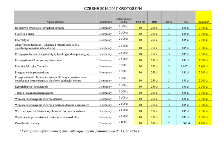 CZESNE 2016/2017 KROTOSZYN Czesne za całe studia Ilość rat Rata lub rat rata Promocja* 2 500 zł 10 250 zł 3 835 zł 2 300 zł 3 semestry 2 500 zł 10 250 zł 3 835 zł 2 300 zł Informatyka 3 semestry 2 500 zł 10 250 zł 3 835 zł 2 300 zł Oligofrenopedagogika - Edukacja i rehabilitacja osób z niepełnosprawnością intelektualną 3 semestry 10 250 zł 3 835 zł 2 300 zł Pedagogika lecznicza z gimnastyką korekcyjno-kompensacyjną 3 semestry 2 500 zł 10 250 zł 3 835 zł 2 300 zł Pedagogika opiekuńczo - wychowawcza 3 semestry 2 500 zł 10 250 zł 3 835 zł 2 300 zł Plastyka, Muzyka, Technika 3 semestry 3 200 zł 10 320 zł 3 1 067 zł 3 000 zł Przygotowanie pedagogiczne 3 semestry 2 500 zł 10 250 zł 3 835 zł 2 300 zł Przysposobienie obronne i edukacja dla bezpieczeństwa oraz koordynator bezpieczeństwa placówek edukacji i kultury 3 semestry 10 250 zł 3 835 zł 2 300 zł Resocjalizacja i socjoterapia 3 semestry 2 500 zł 10 250 zł 3 835 zł 2 300 zł Terapia i diagnoza pedagogiczna 3 semestry 2 500 zł 10 250 zł 3 835 zł 2 300 zł Wczesne wspomaganie rozwoju dziecka 3 semestry 2 500 zł 10 250 zł 3 835 zł 2 300 zł Wczesne wspomaganie rozwoju i edukacji dziecka z autyzmem 3 semestry 2 500 zł 10 250 zł 3 835 zł 2 300 zł Wiedza o społeczeństwie i Wychowanie do życia w rodzinie 3 semestry 2 500 zł 10 250 zł 3 835 zł 2 300 zł Wychowanie przedszkolne i edukacja wczesnoszkolna 3 semestry 2 500 zł 10 250 zł 3 835 zł 2 300 zł Zarządzanie oświatą 2 semestry 2 000 zł 10 200 zł 2 1000 zł 1 800 zł Nazwa kierunku Czas trwania Doradztwo zawodowe i przedsiębiorczość 3 semestry Filozofia i etyka 2 500 zł 2 500 zł *Cena promocyjna obowiązuje wpłacając czesne jednorazowo do 15.11.2016 r.