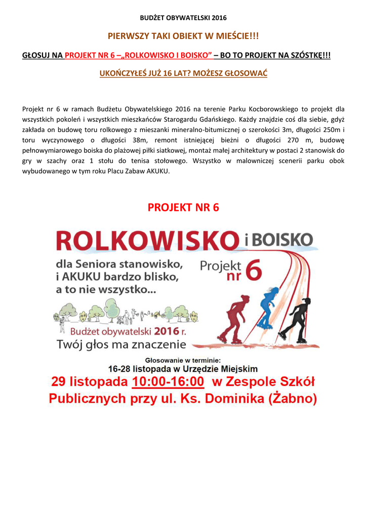BUDŻET OBYWATELSKI 2016 PIERWSZY TAKI OBIEKT W MIEŚCIE!!! GŁOSUJ NA PROJEKT NR 6 –„ROLKOWISKO I BOISKO” – BO TO PROJEKT NA SZÓSTKĘ!!! UKOŃCZYŁEŚ JUŻ 16 LAT? MOŻESZ GŁOSOWAĆ Projekt nr 6 w ramach Budżetu Obywatelskiego 2016 na terenie Parku Kocborowskiego to projekt dla wszystkich pokoleń i wszystkich mieszkańców Starogardu Gdańskiego. Każdy znajdzie coś dla siebie, gdyż zakłada on budowę toru rolkowego z mieszanki mineralno-bitumicznej o szerokości 3m, długości 250m i toru wyczynowego o długości 38m, remont istniejącej bieżni o długości 270 m, budowę pełnowymiarowego boiska do plażowej piłki siatkowej, montaż małej architektury w postaci 2 stanowisk do gry w szachy oraz 1 stołu do tenisa stołowego. Wszystko w malowniczej scenerii parku obok wybudowanego w tym roku Placu Zabaw AKUKU. PROJEKT NR 6 GŁOSUJ NA NASZ PROJEKT, BO JEST WYJĄTKOWY. TO, CO GO WYRÓŹNIA, TO: * UNIWERSALNOŚĆ- skierowany jest dla wszystkich mieszkańców Starogardu, w różnym wieku, dla indywidualistów, rodzin, grup, szkół *RÓŻNORODNOŚĆ- umożliwia aktywne spędzenie wolnego czasu w różny sposób, na wiele możliwości - 270 metrowa bieżnia dla biegaczy, - 250 metrowy tor rolkowy ( do jazdy na rolkach, wrotkach, deskorolkach, do zabawy zdalnie sterowanymi autami - możliwość organizowania wyścigów aut, lądowisko dla zdalnie sterowanych samolotów, helikopterów itp.) - pełnowymiarowe boisko do siatkówki plażowej - dla seniorów – stoliki na stałe- do gry w szachy, tenisa stołowego *BEZPIECZEŃSTWO- miejsce spokojne- z dala od ulic, hałasu, ruchu miejskiego, naturalnie odgrodzone, *ATRAKCYJNOŚĆ POŁOŻENIA– malownicze miejsce, na łonie przyrody, w otoczeniu zieleni, w dole, dzięki czemu nie wieje tam wiatr, częściowo zacienione (słońce lub cień- dla każdego cos miłego -ochrona przed nadmiernym nasłonecznieniem w upalne lato) *DOSTĘPNOŚĆ – dla każdego, dojazd samochodem , rowerem (stojaki dla rowerów), ścieżka rowerowa z centrum miasta *SĄSIEDZTWO Placu zabaw dla dzieci Akuku (zostawiamy dzieci i sami znajdujemy cos dla siebie) *Idealne miejsce do spacerów, spotkań, pikników GŁOSUJ NA PROJEKT NR 6 –„ROLKOWISKO I BOISKO” – BO TO PROJEKT NA SZÓSTKĘ!!!