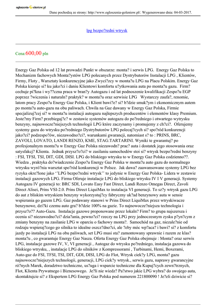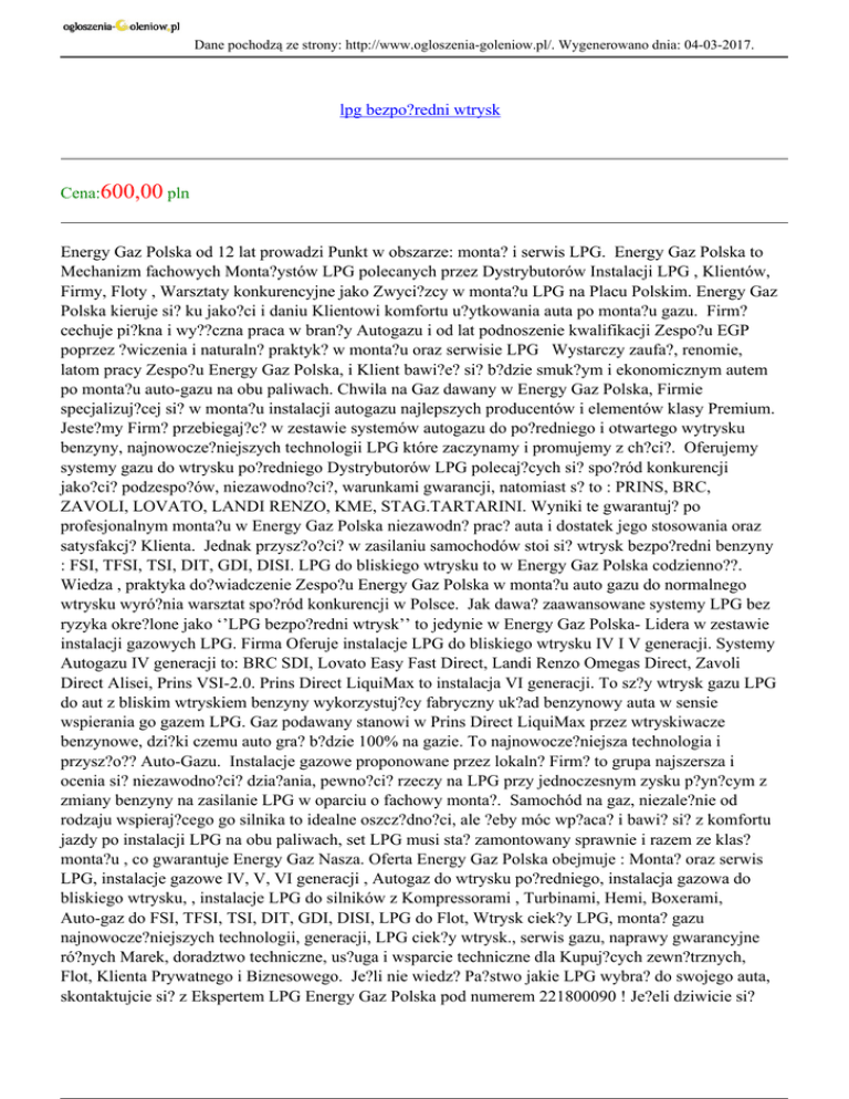 Dane pochodzą ze strony: http://www.ogloszenia-goleniow.pl/. Wygenerowano dnia: 04-03-2017. lpg bezpo?redni wtrysk Cena:600,00 pln Energy Gaz Polska od 12 lat prowadzi Punkt w obszarze: monta? i serwis LPG. Energy Gaz Polska to Mechanizm fachowych Monta?ystów LPG polecanych przez Dystrybutorów Instalacji LPG , Klientów, Firmy, Floty , Warsztaty konkurencyjne jako Zwyci?zcy w monta?u LPG na Placu Polskim. Energy Gaz Polska kieruje si? ku jako?ci i daniu Klientowi komfortu u?ytkowania auta po monta?u gazu. Firm? cechuje pi?kna i wy??czna praca w bran?y Autogazu i od lat podnoszenie kwalifikacji Zespo?u EGP poprzez ?wiczenia i naturaln? praktyk? w monta?u oraz serwisie LPG Wystarczy zaufa?, renomie, latom pracy Zespo?u Energy Gaz Polska, i Klient bawi?e? si? b?dzie smuk?ym i ekonomicznym autem po monta?u auto-gazu na obu paliwach. Chwila na Gaz dawany w Energy Gaz Polska, Firmie specjalizuj?cej si? w monta?u instalacji autogazu najlepszych producentów i elementów klasy Premium. Jeste?my Firm? przebiegaj?c? w zestawie systemów autogazu do po?redniego i otwartego wytrysku benzyny, najnowocze?niejszych technologii LPG które zaczynamy i promujemy z ch?ci?. Oferujemy systemy gazu do wtrysku po?redniego Dystrybutorów LPG polecaj?cych si? spo?ród konkurencji jako?ci? podzespo?ów, niezawodno?ci?, warunkami gwarancji, natomiast s? to : PRINS, BRC, ZAVOLI, LOVATO, LANDI RENZO, KME, STAG.TARTARINI. Wyniki te gwarantuj? po profesjonalnym monta?u w Energy Gaz Polska niezawodn? prac? auta i dostatek jego stosowania oraz satysfakcj? Klienta. Jednak przysz?o?ci? w zasilaniu samochodów stoi si? wtrysk bezpo?redni benzyny : FSI, TFSI, TSI, DIT, GDI, DISI. LPG do bliskiego wtrysku to w Energy Gaz Polska codzienno??. Wiedza , praktyka do?wiadczenie Zespo?u Energy Gaz Polska w monta?u auto gazu do normalnego wtrysku wyró?nia warsztat spo?ród konkurencji w Polsce. Jak dawa? zaawansowane systemy LPG bez ryzyka okre?lone jako ‘’LPG bezpo?redni wtrysk’’ to jedynie w Energy Gaz Polska- Lidera w zestawie instalacji gazowych LPG. Firma Oferuje instalacje LPG do bliskiego wtrysku IV I V generacji. Systemy Autogazu IV generacji to: BRC SDI, Lovato Easy Fast Direct, Landi Renzo Omegas Direct, Zavoli Direct Alisei, Prins VSI-2.0. Prins Direct LiquiMax to instalacja VI generacji. To sz?y wtrysk gazu LPG do aut z bliskim wtryskiem benzyny wykorzystuj?cy fabryczny uk?ad benzynowy auta w sensie wspierania go gazem LPG. Gaz podawany stanowi w Prins Direct LiquiMax przez wtryskiwacze benzynowe, dzi?ki czemu auto gra? b?dzie 100% na gazie. To najnowocze?niejsza technologia i przysz?o?? Auto-Gazu. Instalacje gazowe proponowane przez lokaln? Firm? to grupa najszersza i ocenia si? niezawodno?ci? dzia?ania, pewno?ci? rzeczy na LPG przy jednoczesnym zysku p?yn?cym z zmiany benzyny na zasilanie LPG w oparciu o fachowy monta?. Samochód na gaz, niezale?nie od rodzaju wspieraj?cego go silnika to idealne oszcz?dno?ci, ale ?eby móc wp?aca? i bawi? si? z komfortu jazdy po instalacji LPG na obu paliwach, set LPG musi sta? zamontowany sprawnie i razem ze klas? monta?u , co gwarantuje Energy Gaz Nasza. Oferta Energy Gaz Polska obejmuje : Monta? oraz serwis LPG, instalacje gazowe IV, V, VI generacji , Autogaz do wtrysku po?redniego, instalacja gazowa do bliskiego wtrysku, , instalacje LPG do silników z Kompressorami , Turbinami, Hemi, Boxerami, Auto-gaz do FSI, TFSI, TSI, DIT, GDI, DISI, LPG do Flot, Wtrysk ciek?y LPG, monta? gazu najnowocze?niejszych technologii, generacji, LPG ciek?y wtrysk., serwis gazu, naprawy gwarancyjne ró?nych Marek, doradztwo techniczne, us?uga i wsparcie techniczne dla Kupuj?cych zewn?trznych, Flot, Klienta Prywatnego i Biznesowego. Je?li nie wiedz? Pa?stwo jakie LPG wybra? do swojego auta, skontaktujcie si? z Ekspertem LPG Energy Gaz Polska pod numerem 221800090 ! Je?eli dziwicie si? Dane pochodzą ze strony: http://www.ogloszenia-goleniow.pl/. Wygenerowano dnia: 04-03-2017. Pa?stwo czy warto zamontowa? autogaz do samochodu, Floty Zespó? Profesjonalnych Monta?ystów LPG doradzi, dobrze dobierze instalacje gazow? do samochodu, Floty, aut biznesowych. Wyja?ni równie? dlaczego warto wzi?? pod opiek? monta? instalacji autogazu w profesjonalnej Firmie Energy Gaz Polska, Warsztacie z tradycjami i ksi??k? niekwestionowanego Lidera na zbycie LPG. Energy Gaz Polska ceni i interesuje si? zaawansowanymi technikami LPG, obecnie systemami LPG do swego wtrysku , zatem jest dla najwi?kszych , dodaj?cych si? na rynku Producentów Autogazu idealnym Partnerem. Energy Gaz Polska czynnie dzia?a w promocji, monta?u i serwisie LPG, stanowi?c doskona?y suport techniczny i wa?ne pomo?enie w przestrzeni autogazu. Z lat Energy Gaz Polska promuje i u?atwia idee monta?u innowacyjnych, najnowszych technologii LPG na rynku polskim jeszcze ze powodów na troska o miejsce. Firma lubiana jest zbyt wysok? ?wiadomo?? ekologiczn?, promocj? Autogazu jako paliwa alternatywnego do benzyny, ropy, Oleju nap?dowego a obni?aj?cego skutecznie emisj? szkodliwych emisji zanieczyszcze? i cz??ci sta?ych tak niebezpiecznych dla w?asnego prze?ycia a zdrowia. Zespó? EGP jest w?a?ciwy , ze przez lata wyrobi?a sobie na miano Firmy powa?nej, pewnej, godnej zaufania, jaka mo?na bez ryzyka wykorzystywa? w sfery LPG. W okresie12 lat Energy Gaz Polska pisz?c w autach, flotach fachow? us?ug? monta?u instalacji autogazu , Firma wyrobi?a sobie grono tysi?cy wiernych Fanów, zadowolonych Klientów spo?ród W?a?cicieli Prywatnych aut benzynowych , Dealerów Innych Marek , Flot, Biznes, Klientów Korporacyjnych, Taxi, Metod Nauki Drogi i W?a?cicieli aut nowych, którzy po monta?u w EGP systemów LPG i chroni? gwarancj? Dealersk? na wózek natomiast nie grozi im jej utrata. Gaz dawany w EGP to oczywisty owoc i gwarancja zawodowej i takiej pracy auta, Floty na LPG. S?owa Swoich Klientów , Partnerów "Polecam Energy Gaz Polska do monta?u instalacja gazowej dodaj? skrzyde? naszemu Uk?adowi i zach?caj? do te? zdrowszej i profesjonalnej pracy. Zar?czamy, ?